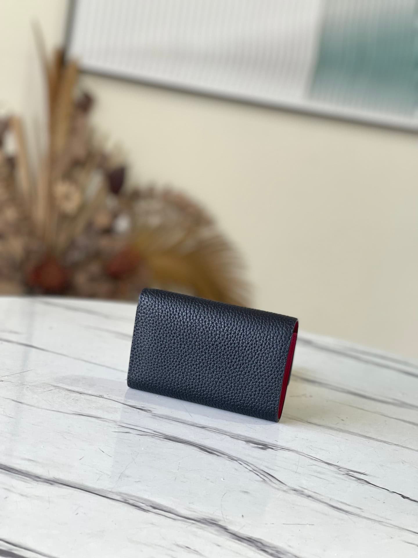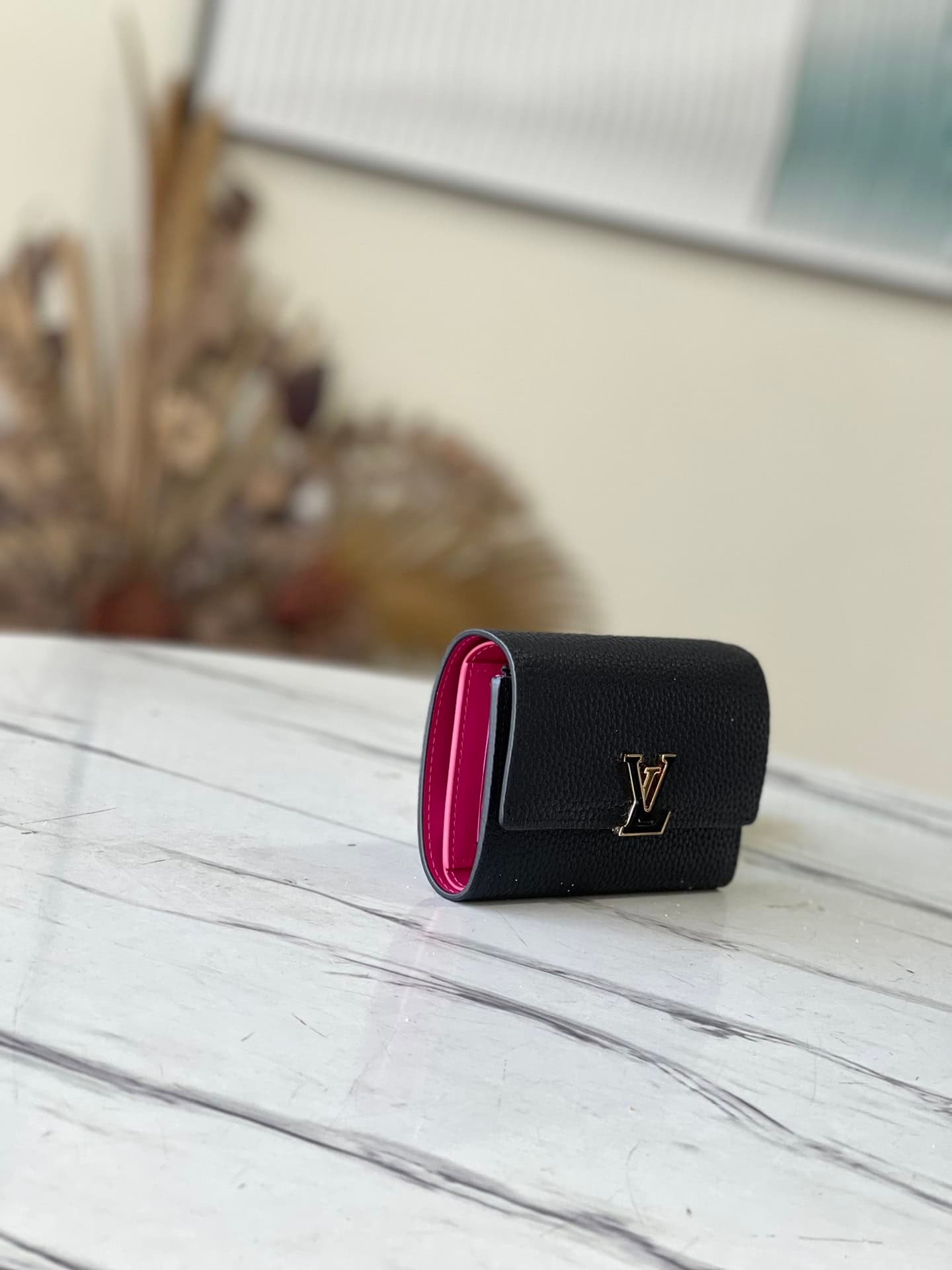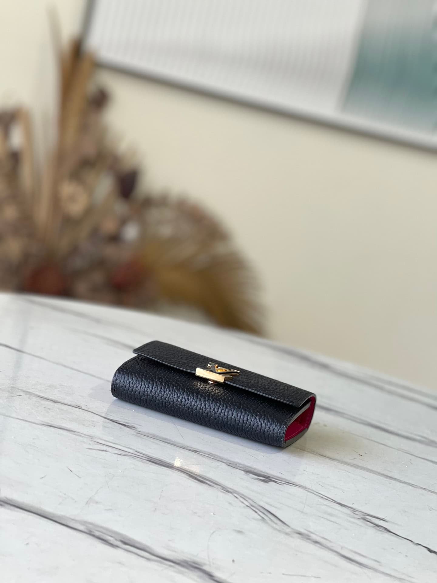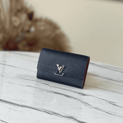 Made of Taurillon leather, this Capucines small wallet has multiple functions and is spacious enough to accommodate daily belongings. The structure of this elegant pocket wallet is refined and original, consisting of two folded flaps that offer plenty of space for credit cards, change and banknotes.