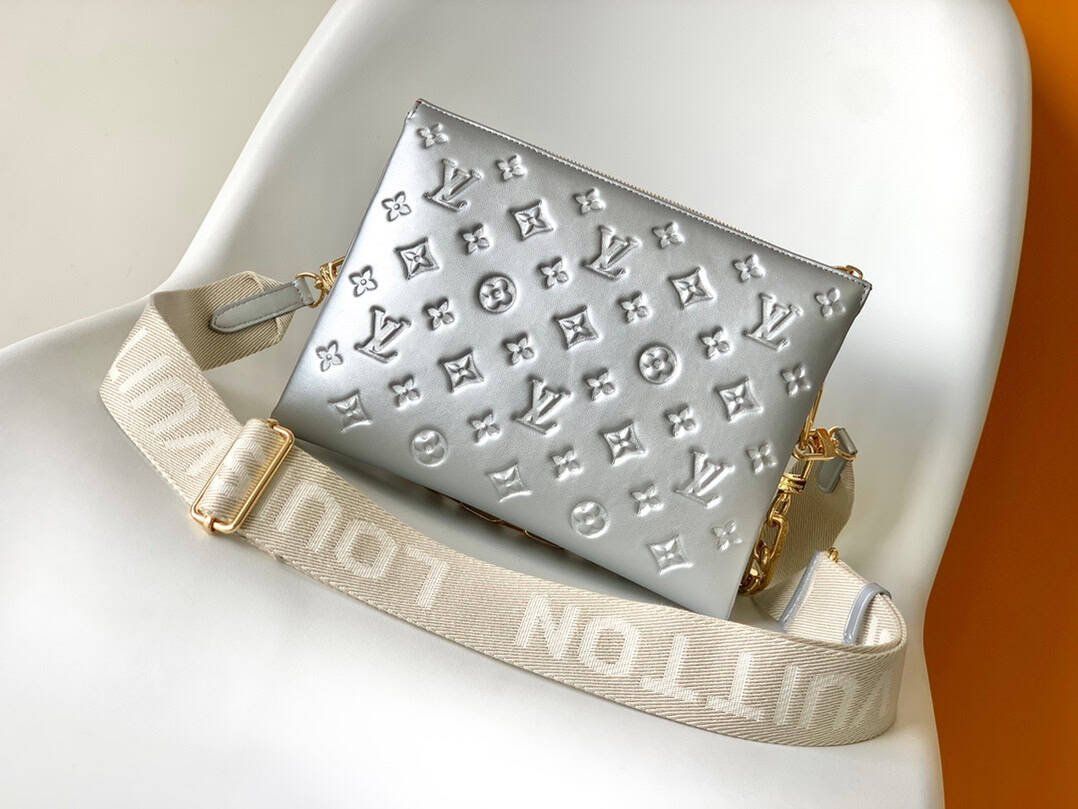 Coussin Trumpeter Bags on the Spring/Summer 2021 Fashion Show splendor. Shaggy sheepskin embossed in Monogram creates a pillow configuration, adding avant-garde style to the simple design. Use the shoulder strap to wear it crossbody or as a baguette on chain, or carry it under the arm.