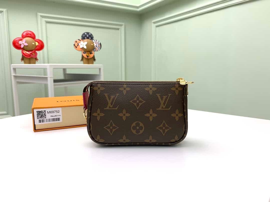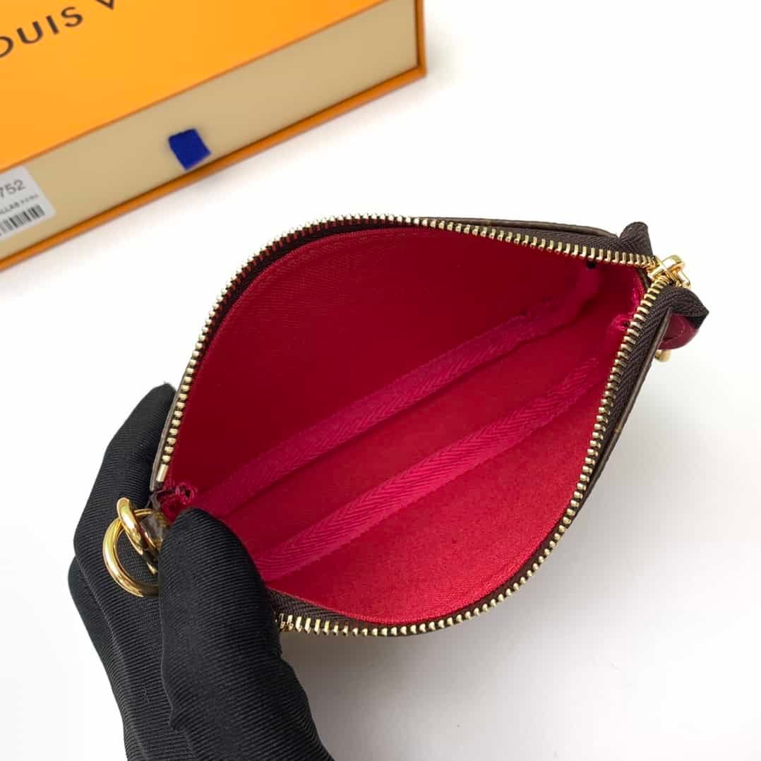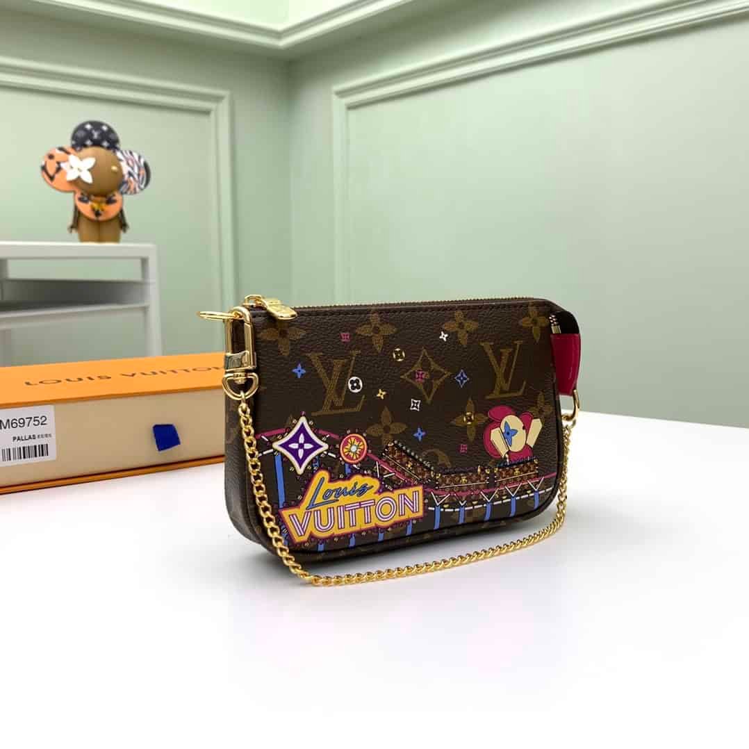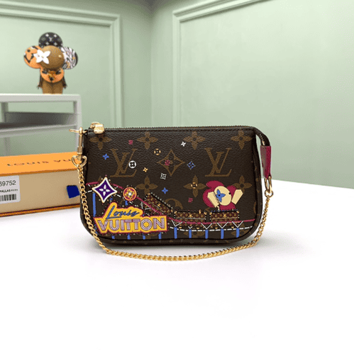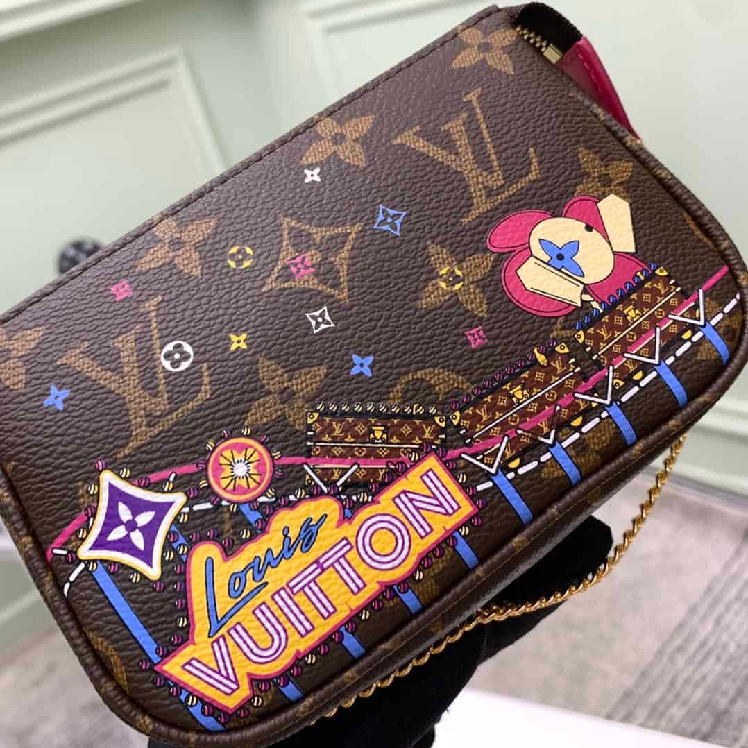 Christmas Pochette Accessoires Mini Clutch is made of Monogram or Damier Ebene canvas, depicting the cheerful scene of Louis Vuitton mascot Vivienne playing in the playground, incorporating brand iconic elements. The chain can be attached to a belt or bag.