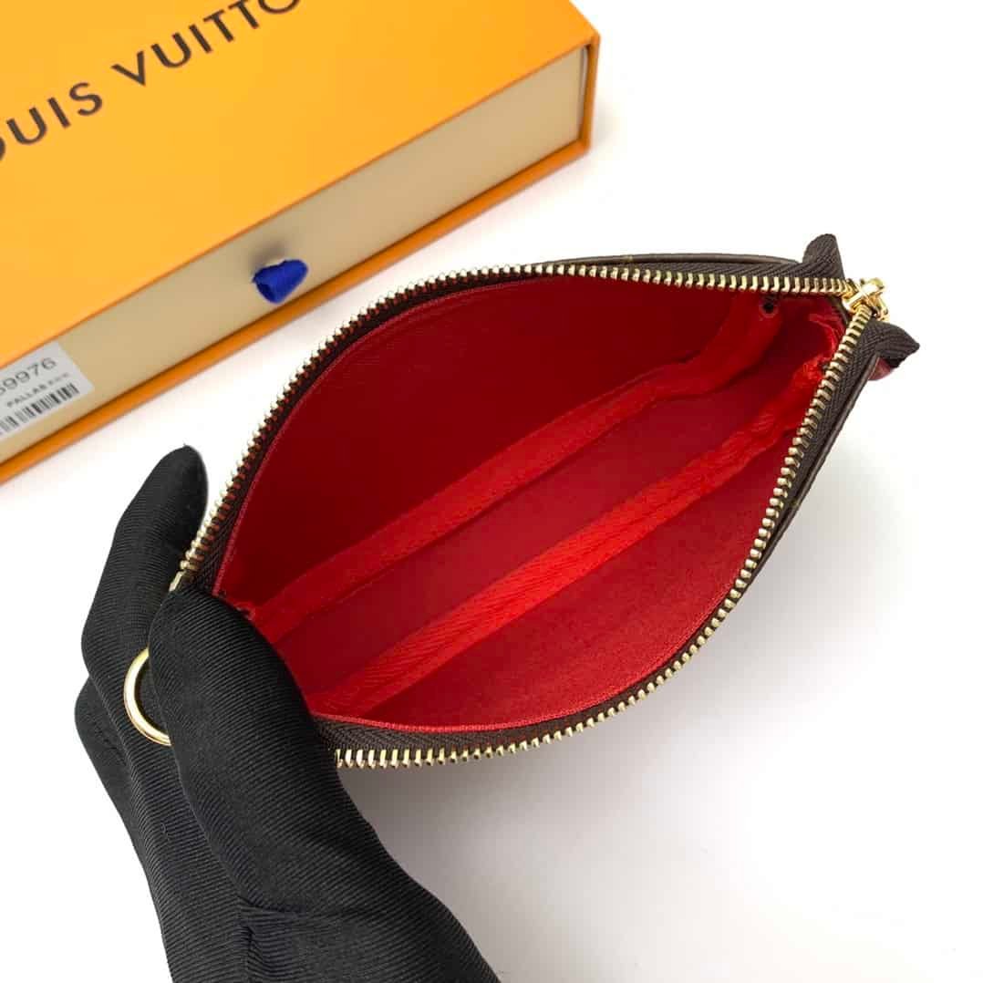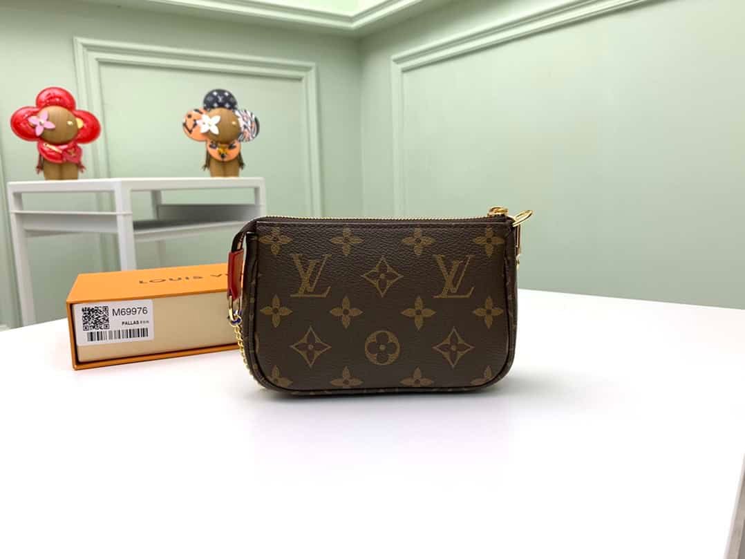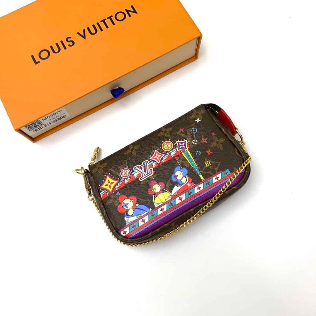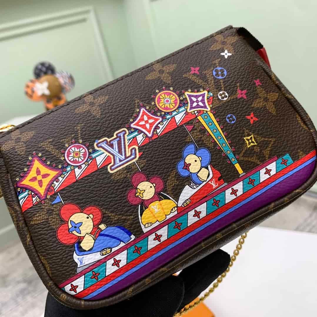 Christmas Pochette Accessoires mini clutch bag is made of Monogram or Damier Ebene canvas, depicting the cheerful scene of Louis Vuitton mascot Vivienne playing in the playground, incorporating brand iconic elements. The chain can be attached to a belt or bag.