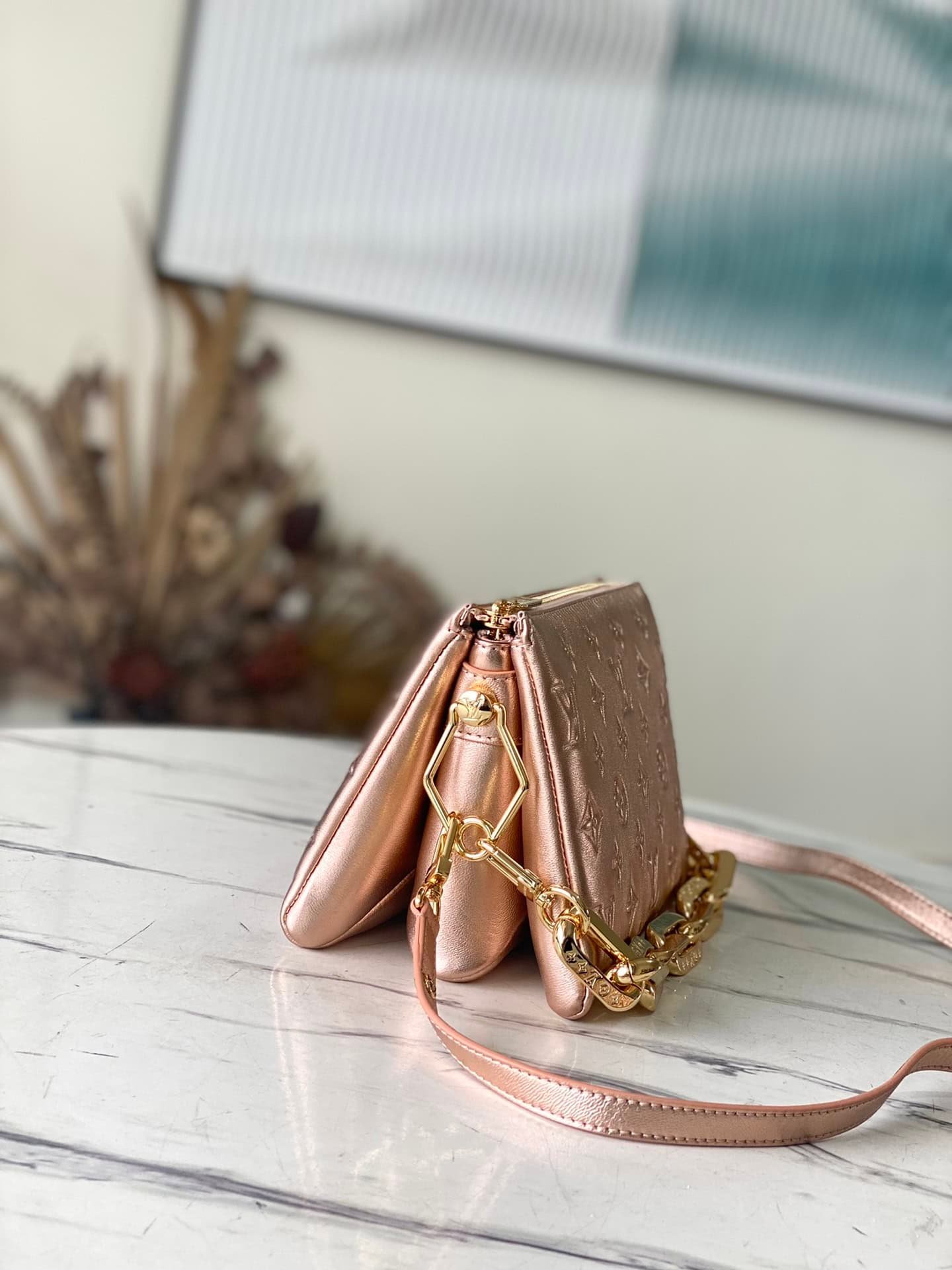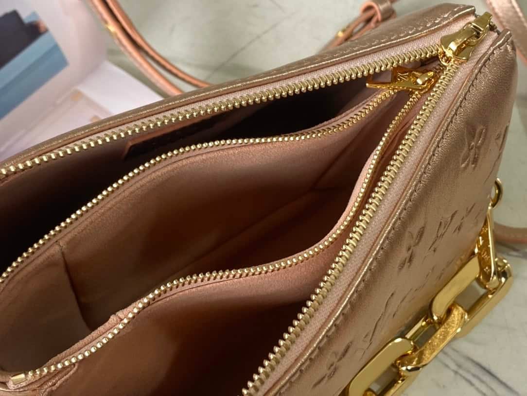 This Coussin BB handbag is cut out of soft Monogram embossed sheepskin with exquisite shape and gorgeous lining. The chunky chain and leather shoulder straps are detachable, and the interior compartment adds functional details, perfect for day or night.