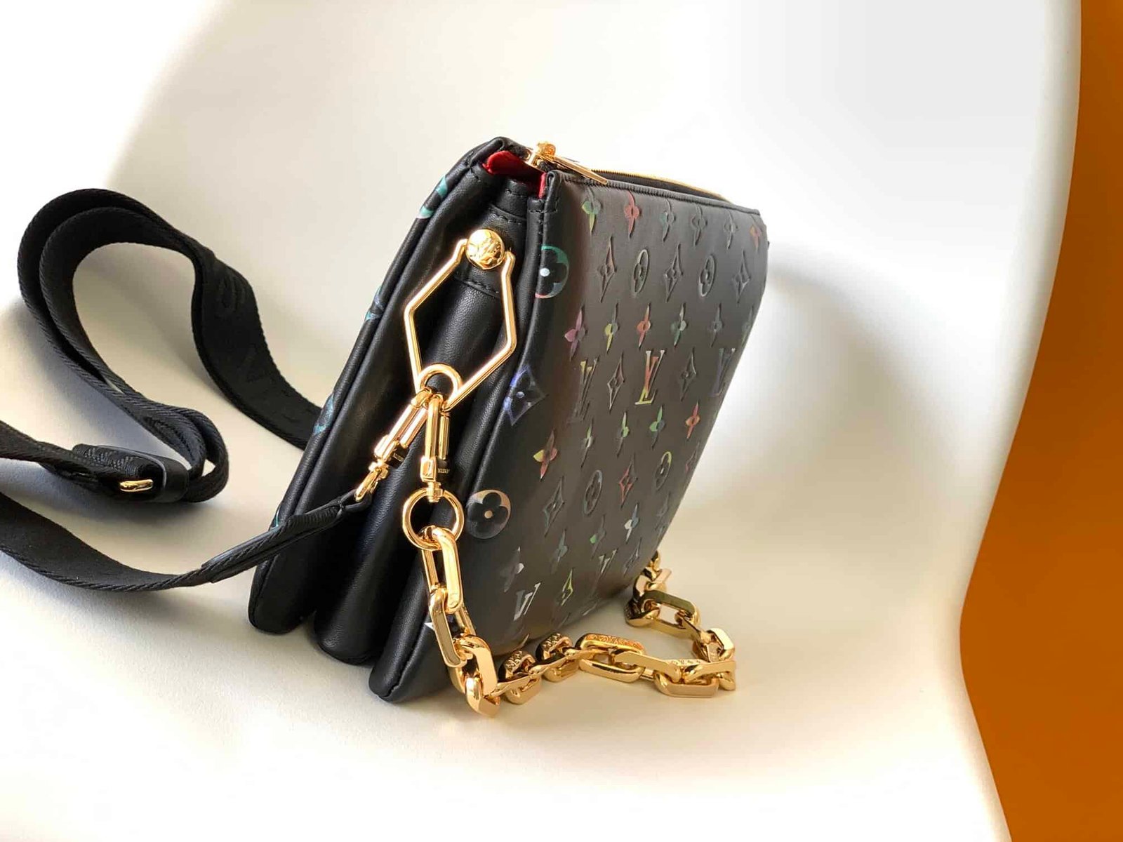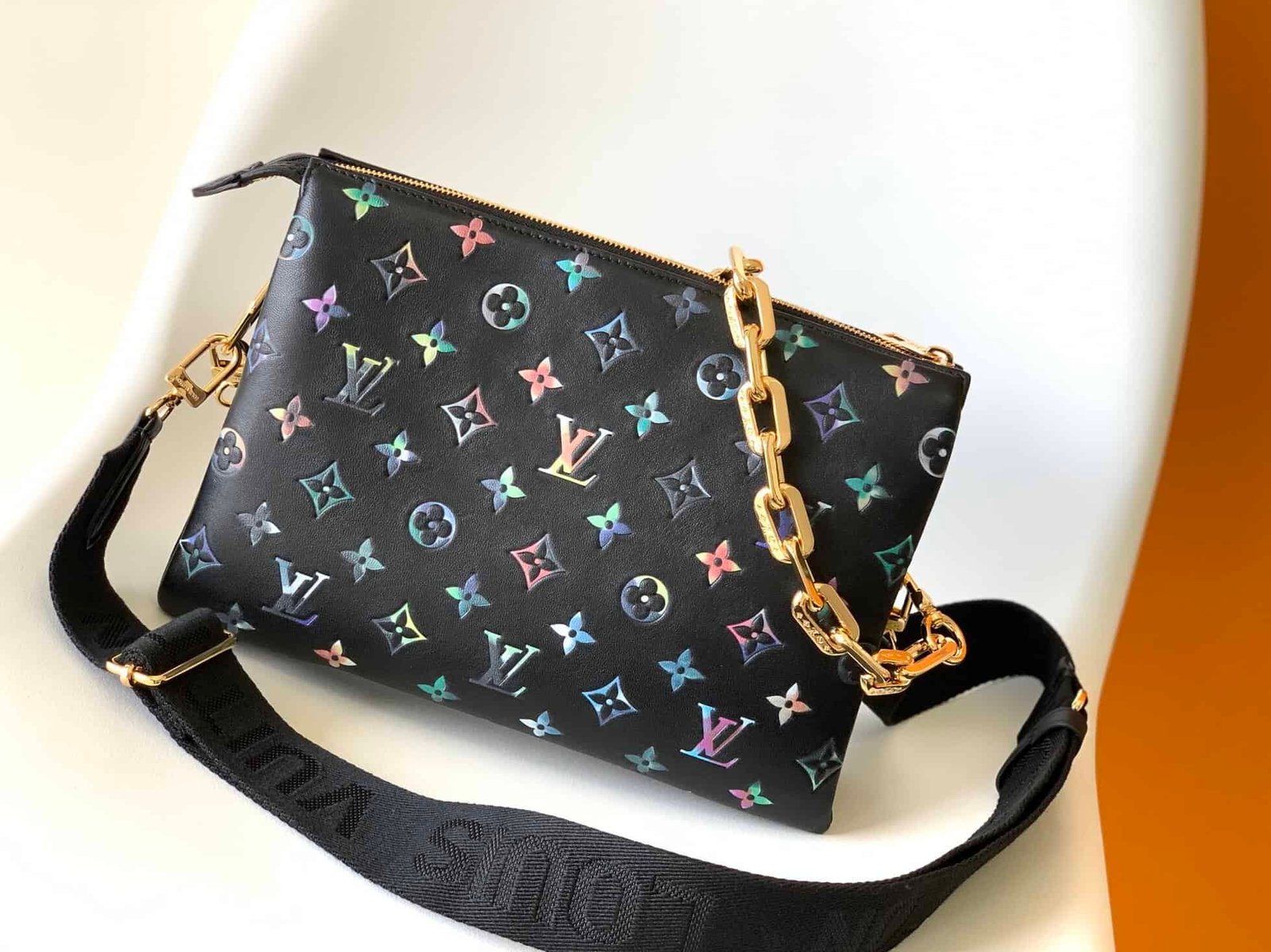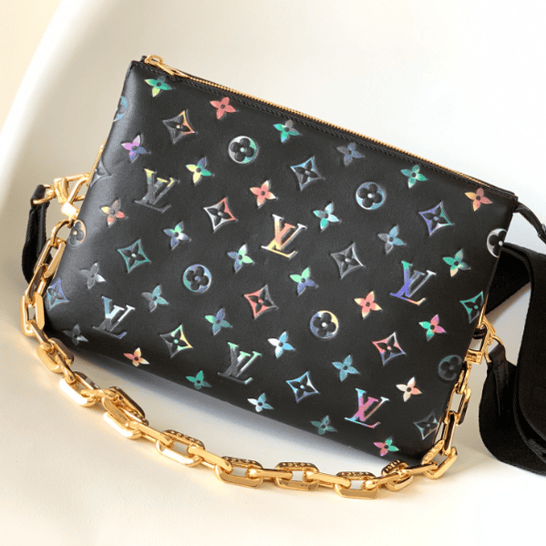 This Coussin small handbag is made of Monogram embossed sheepskin, which subtly integrates floral patterns into LV letters and Monogram flowers. Carry it on the shoulder by the chunky chain or attach the wide adjustable webbing strap to wear it cross-body.