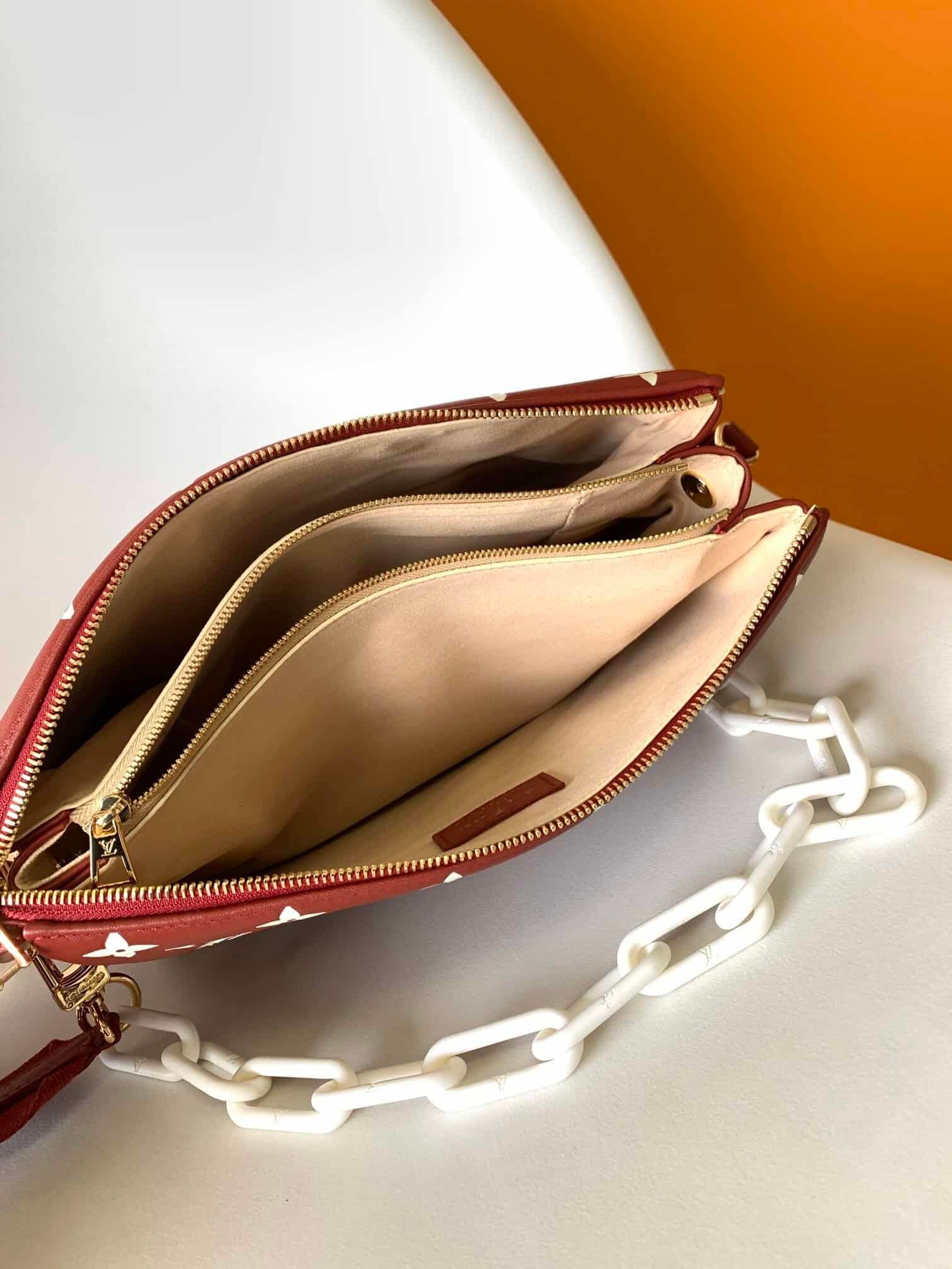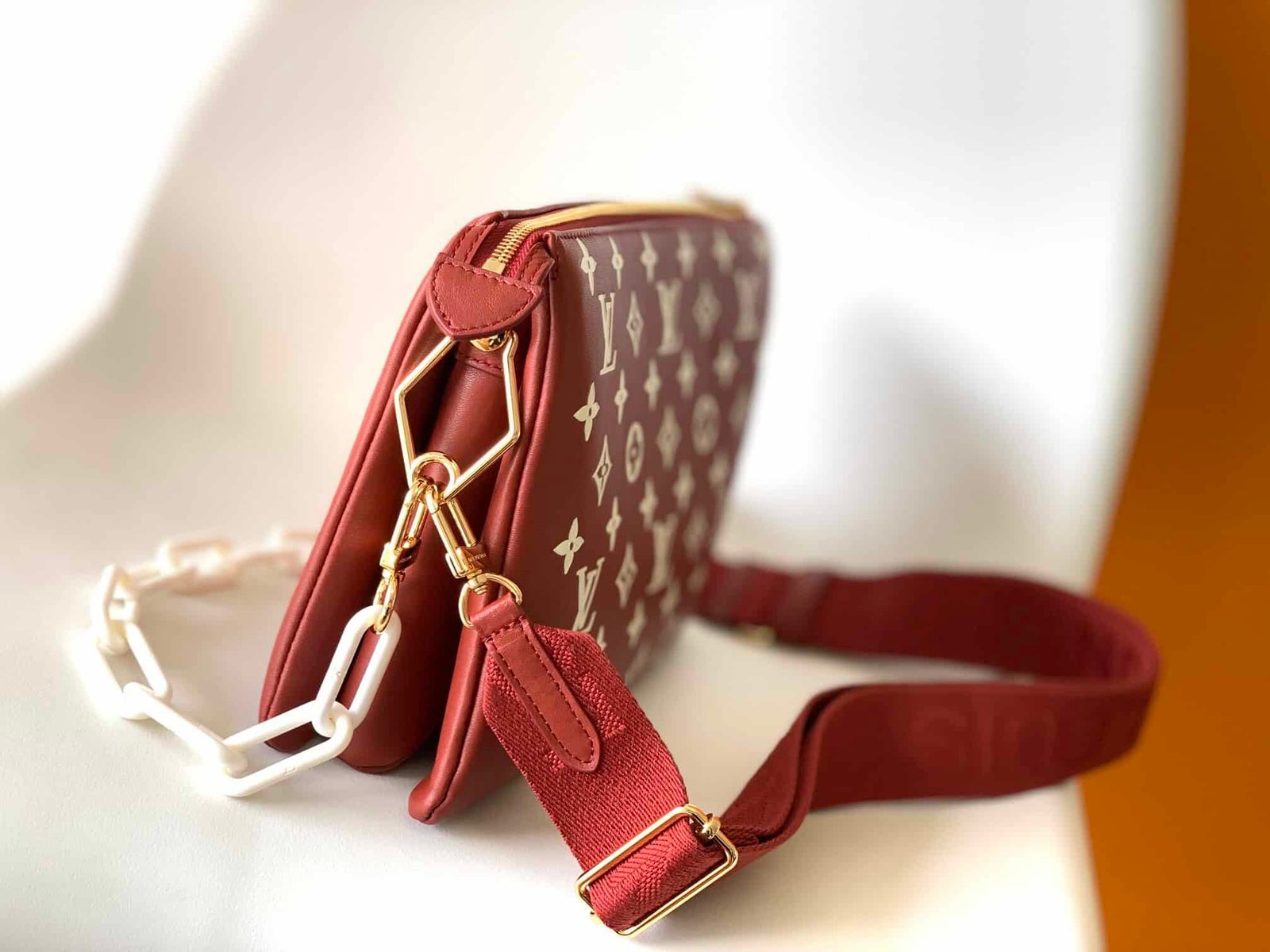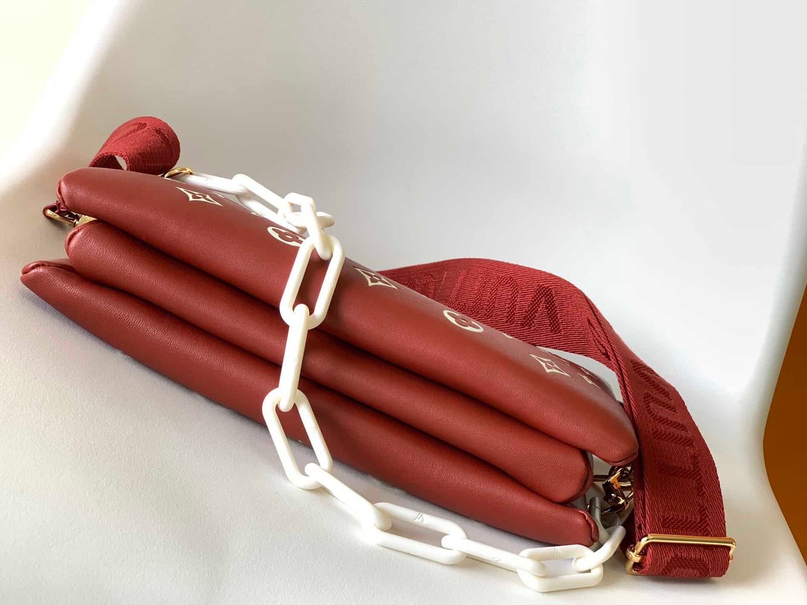 Coussin small handbag is from the Vuittamins capsule series. It is fluffy sheepskin embellished with rough chains, expressing Nicolas Ghesquière’s interpretation of confidence and joy in bright colors. Use the shoulder strap to wear it cross-body, as a baguette on chain or under the arm.