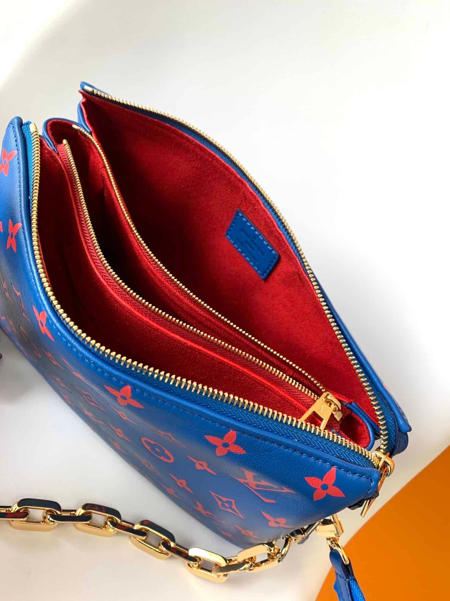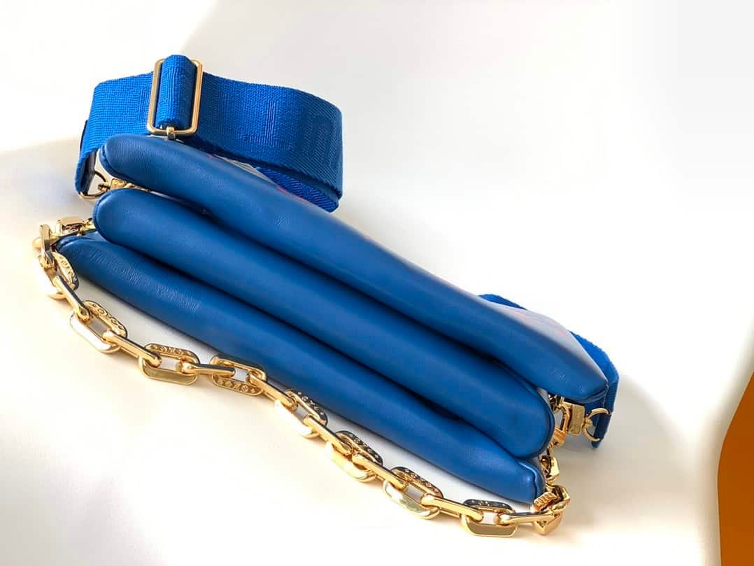 Coussin small handbag is from the Vuittamins capsule series. It is fluffy sheepskin embellished with rough chains, expressing Nicolas Ghesquière’s interpretation of confidence and joy in bright colors. Use the shoulder strap to wear it cross-body, as a baguette on chain or under the arm.