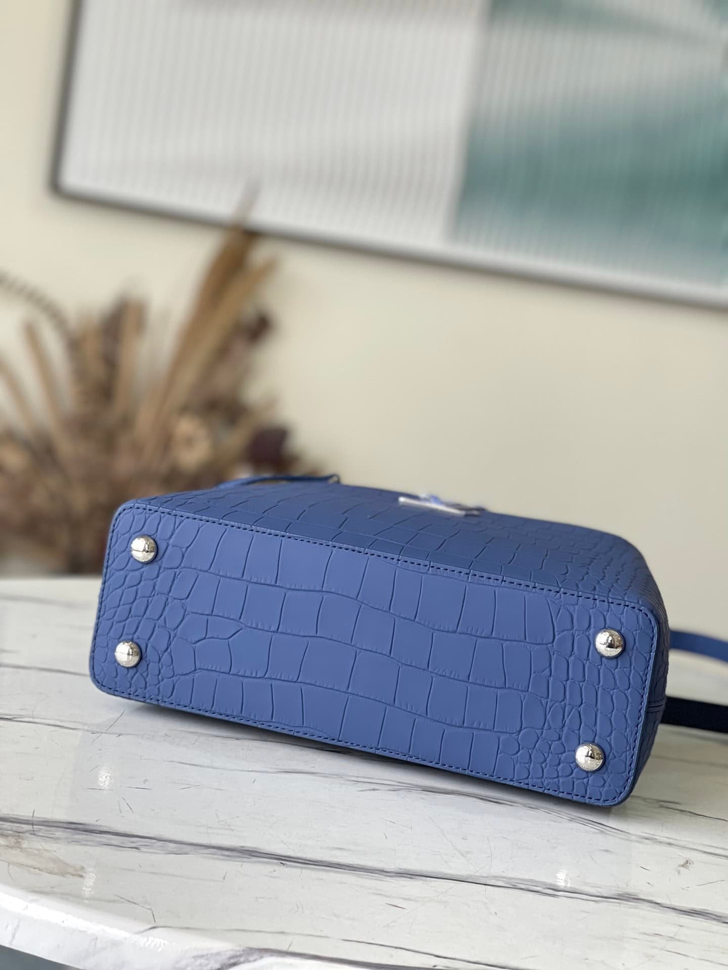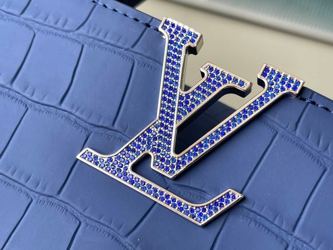 Misty blue crocodile pattern with blue diamonds This precious Capucines handbag is made of crocodile leather pattern with high-gloss treatment, which shines charming and luxurious goatskin lining and sparkling blue diamond accessories The unique Capucines cover can be used The income bag displays the letter logo and can be turned inside out to present the Monogram Flower pattern. The ideal accessory for night out. Size: 31*20*11 cm