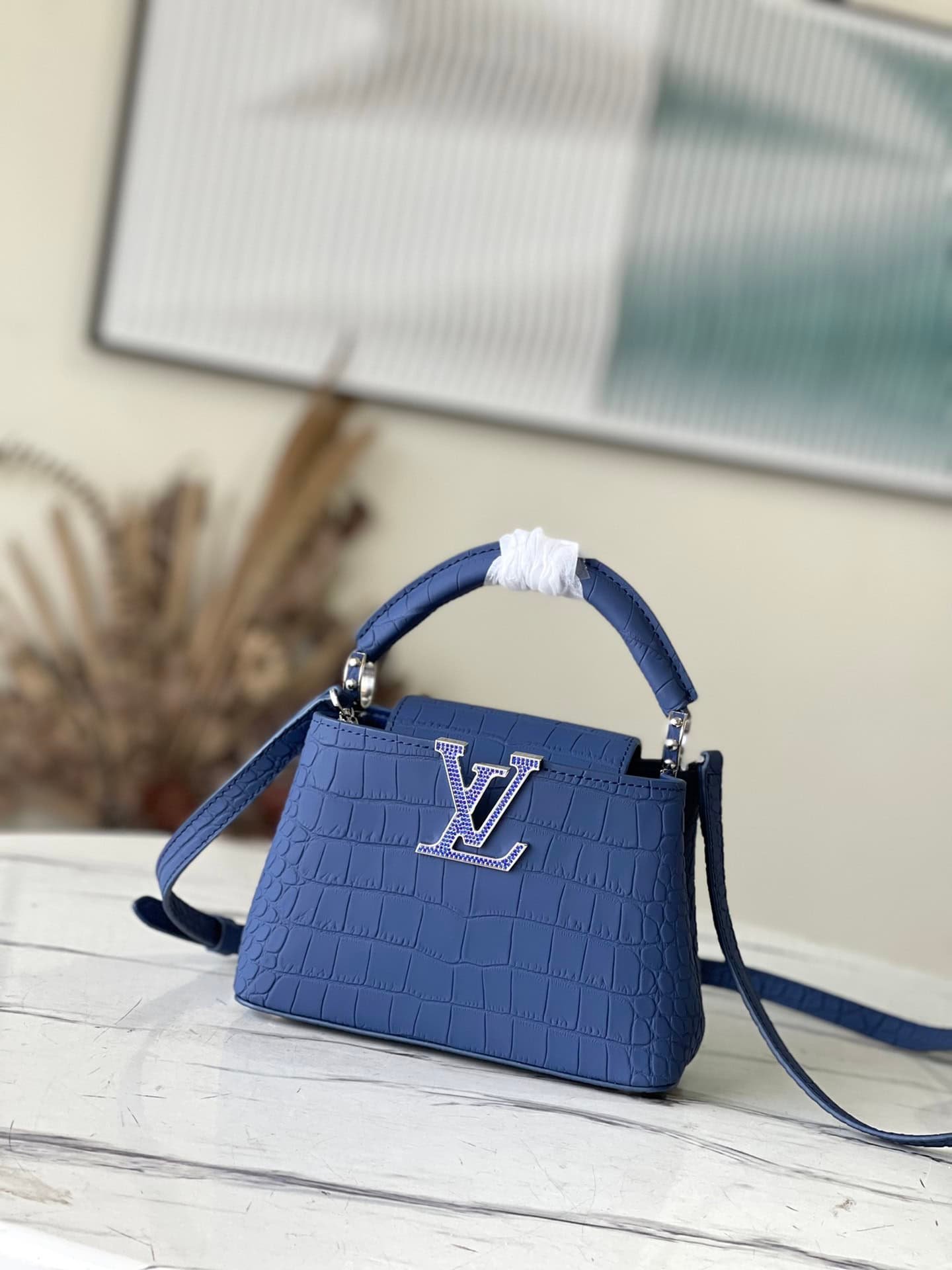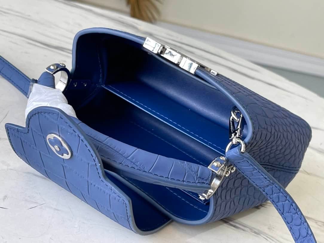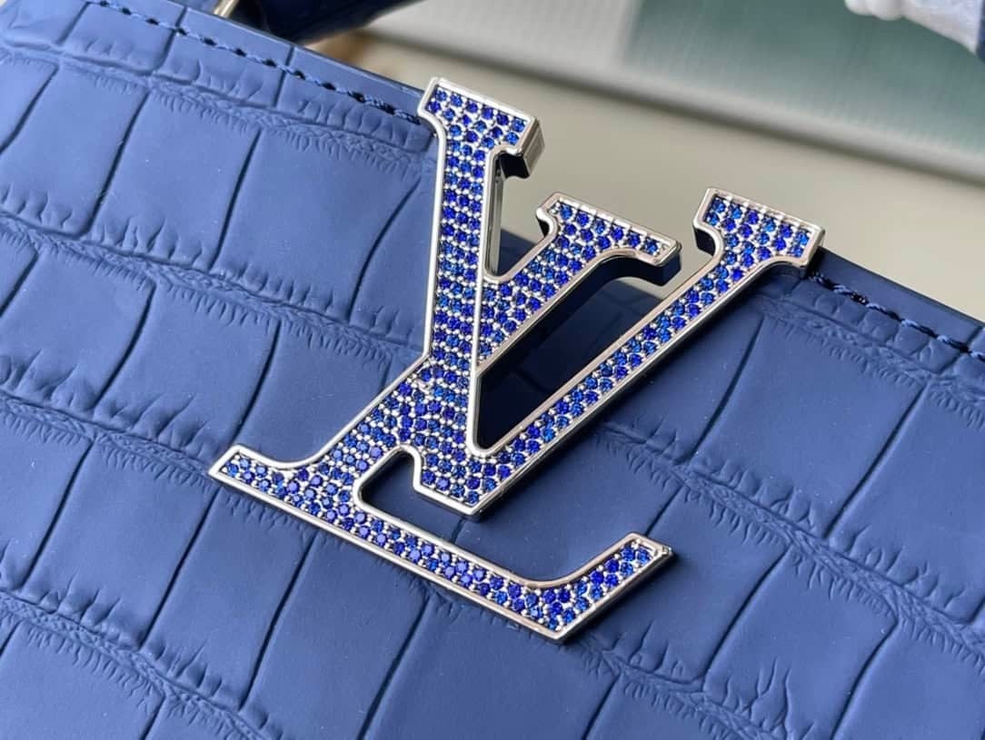 Misty blue crocodile pattern with blue diamonds This precious Capucines handbag is made of crocodile leather pattern with high-gloss treatment, which shines charming and luxurious goatskin lining and sparkling blue diamond accessories. The unique Capucines cover can be used as both The income bag displays the letter logo and can be turned inside out to present the Monogram Flower pattern. The ideal accessory for night out.