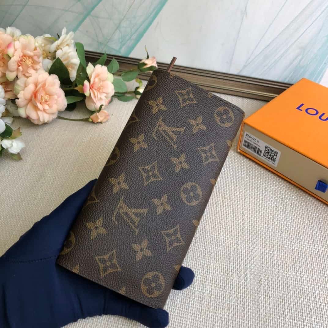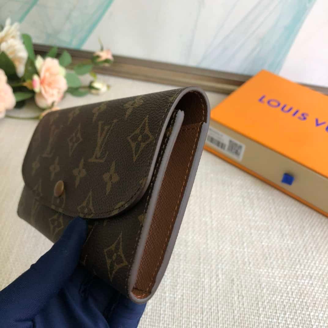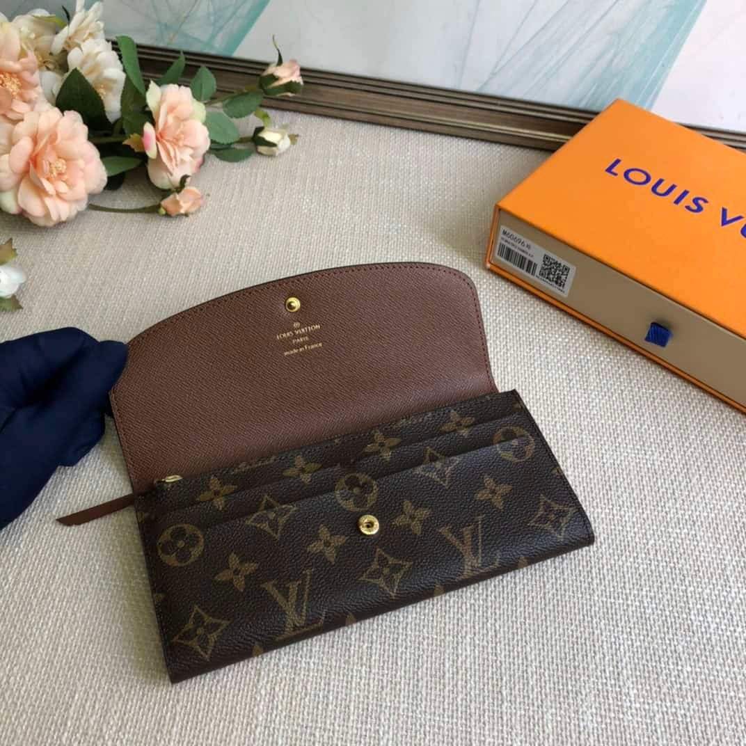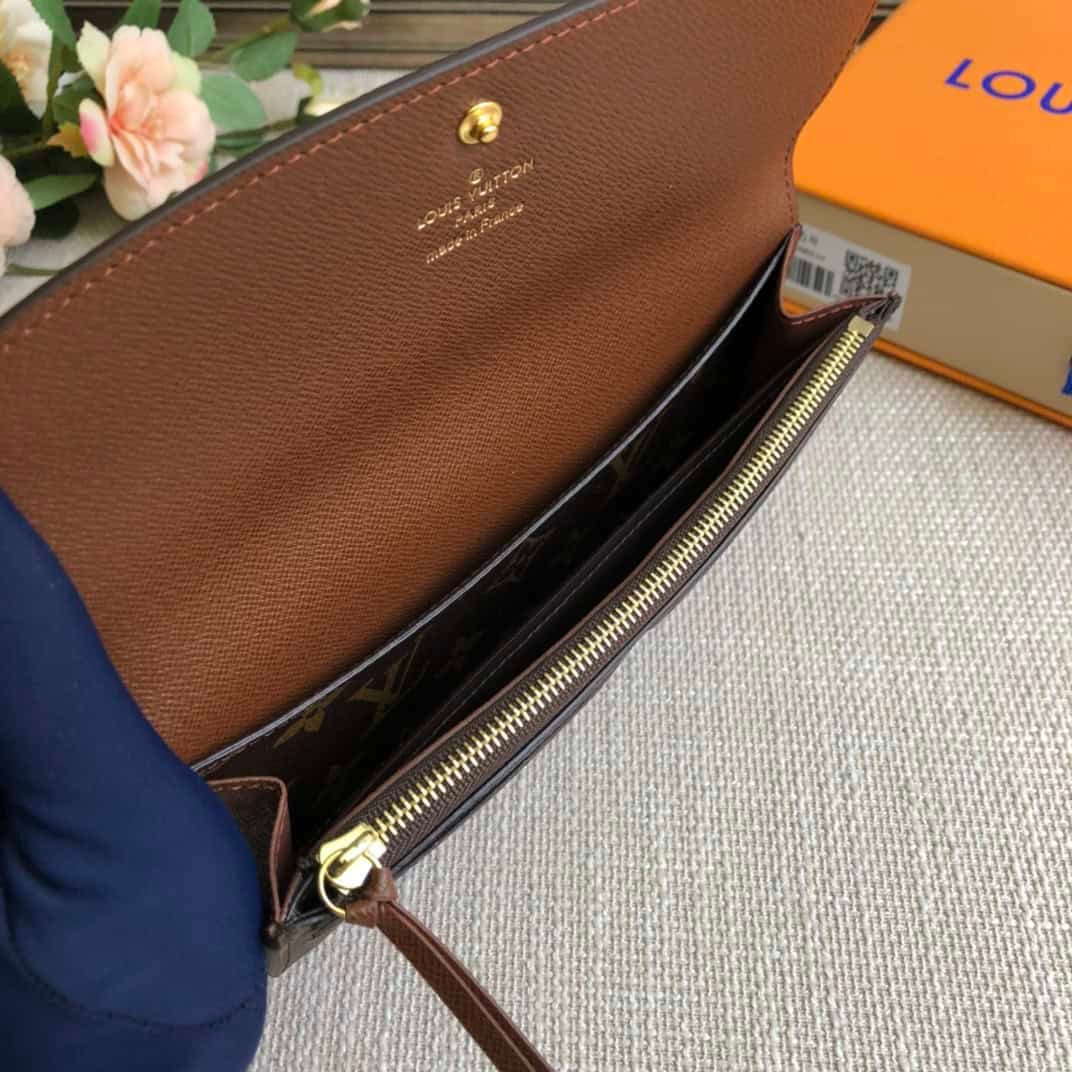Brown Doudou wallet exclusive real shot! Functional and richly designed, the Emilie Wallet is crafted in supple Monogram canvas with a vibrantly colored interior for ultimate elegance. The multi-pocket design and striking shape lend it irresistible allure.