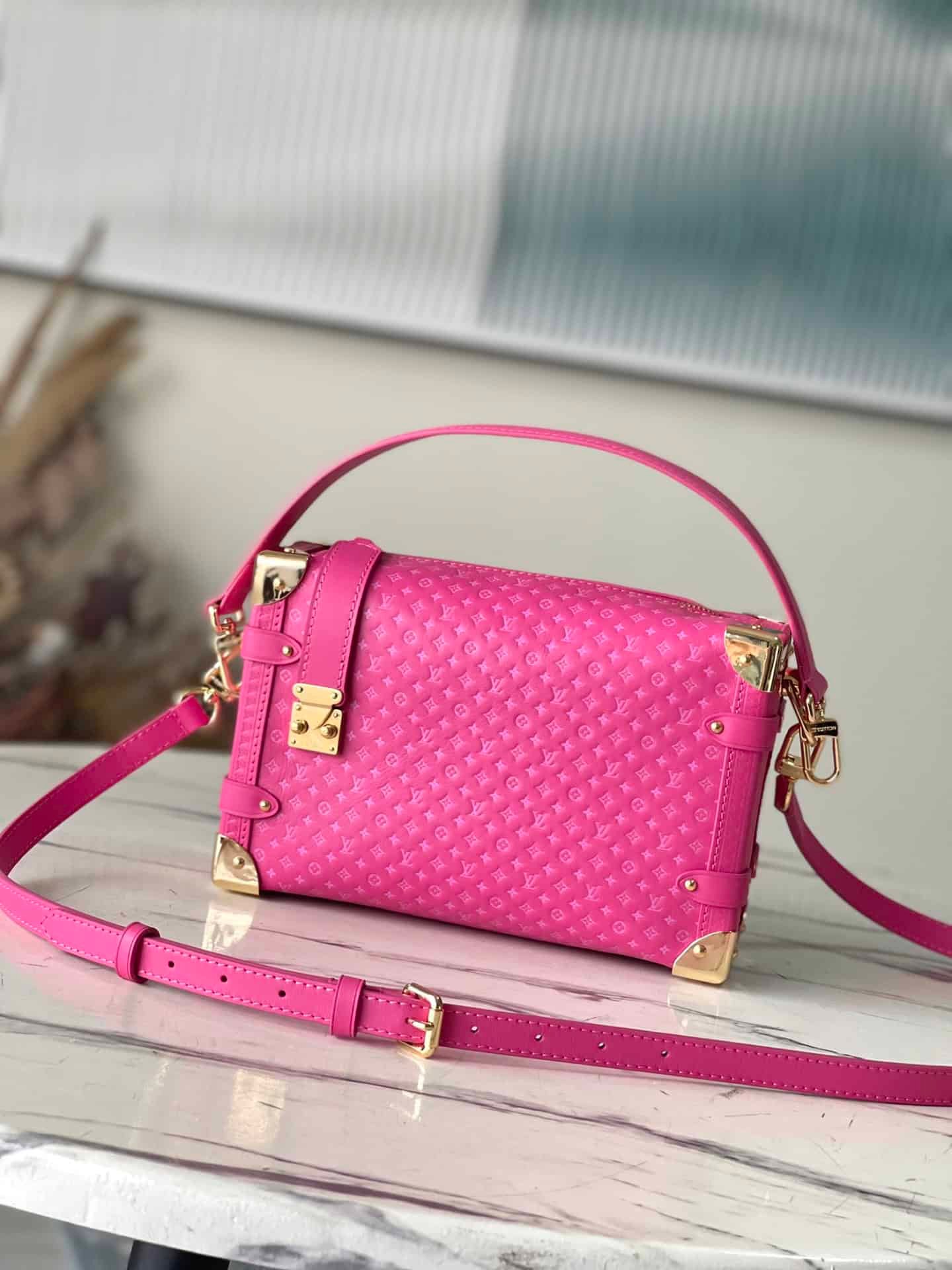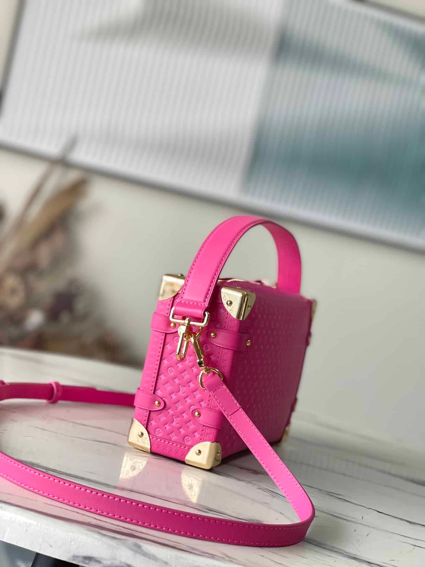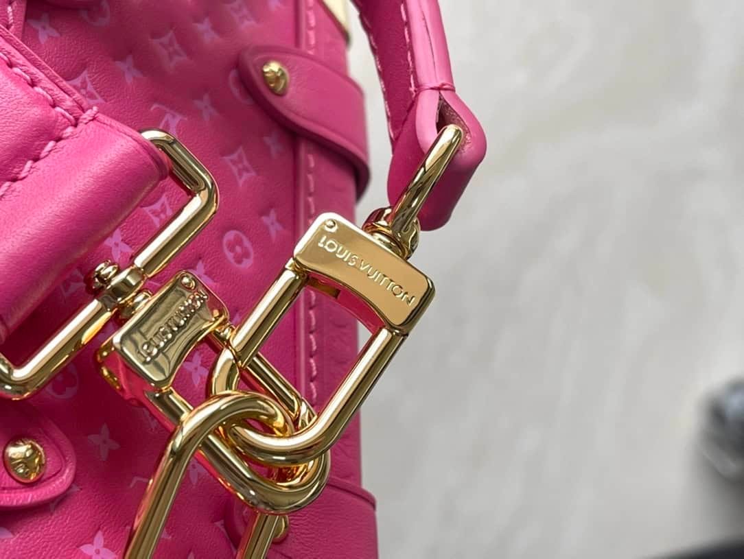 Rose red full leather bag inspired by suitcases. The overall use is the classic monogram, the bag is surrounded by metal edge design, retains the signature hard box technology, perfectly blends leather and metal, soft and hard, not only shows the softness of the leather but also incorporates a bit of laziness and casualness .
