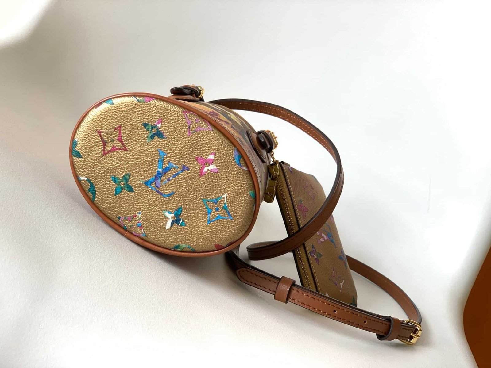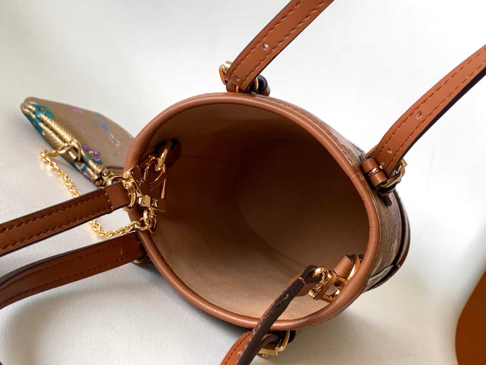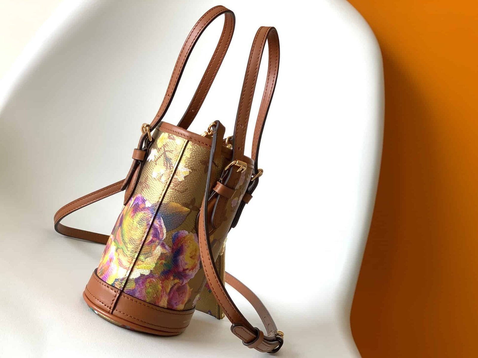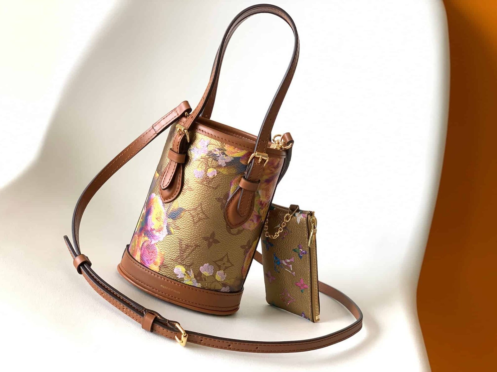 “LV Garden” capsule collection inspired by Louis Vuitton’s Autumn/Winter 2022 fashion show, with a “nano barrel” made of canvas printed with metallic patterns. A mini bucket bag featuring 2 adjustable leather handles and a detachable and adjustable shoulder strap. It offers a zippered porch ideal for storing valuables and is made of fancy monogram canvas.