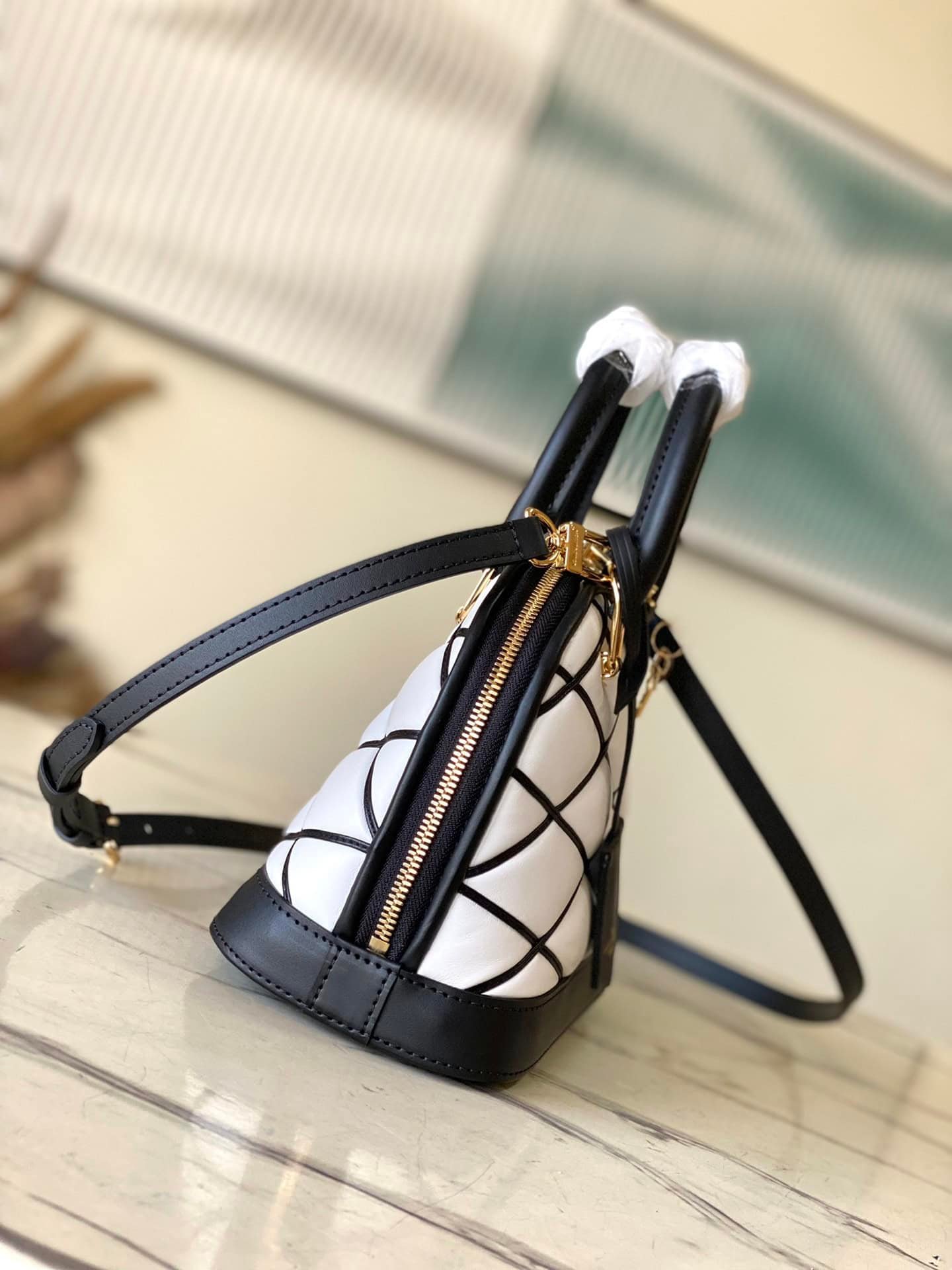 It is made of sheep leather and is combined with smoky tones in light and elegant colors to resemble the gorgeous interiors of Borromeo Palace. It is equipped with a top handle and a detachable shoulder strap, allowing for a variety of carrying methods.