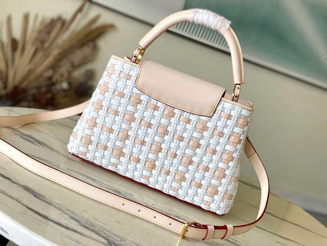 LV Heavenly Capucines handbag is from the Valentine’s Day limited series. It has a canvas strap and LV embossed leather ingeniously woven bag body, and is made of cow leather to shape the top handle, flap and adjustable shoulder strap. Leather and metal LV logo Complete overall