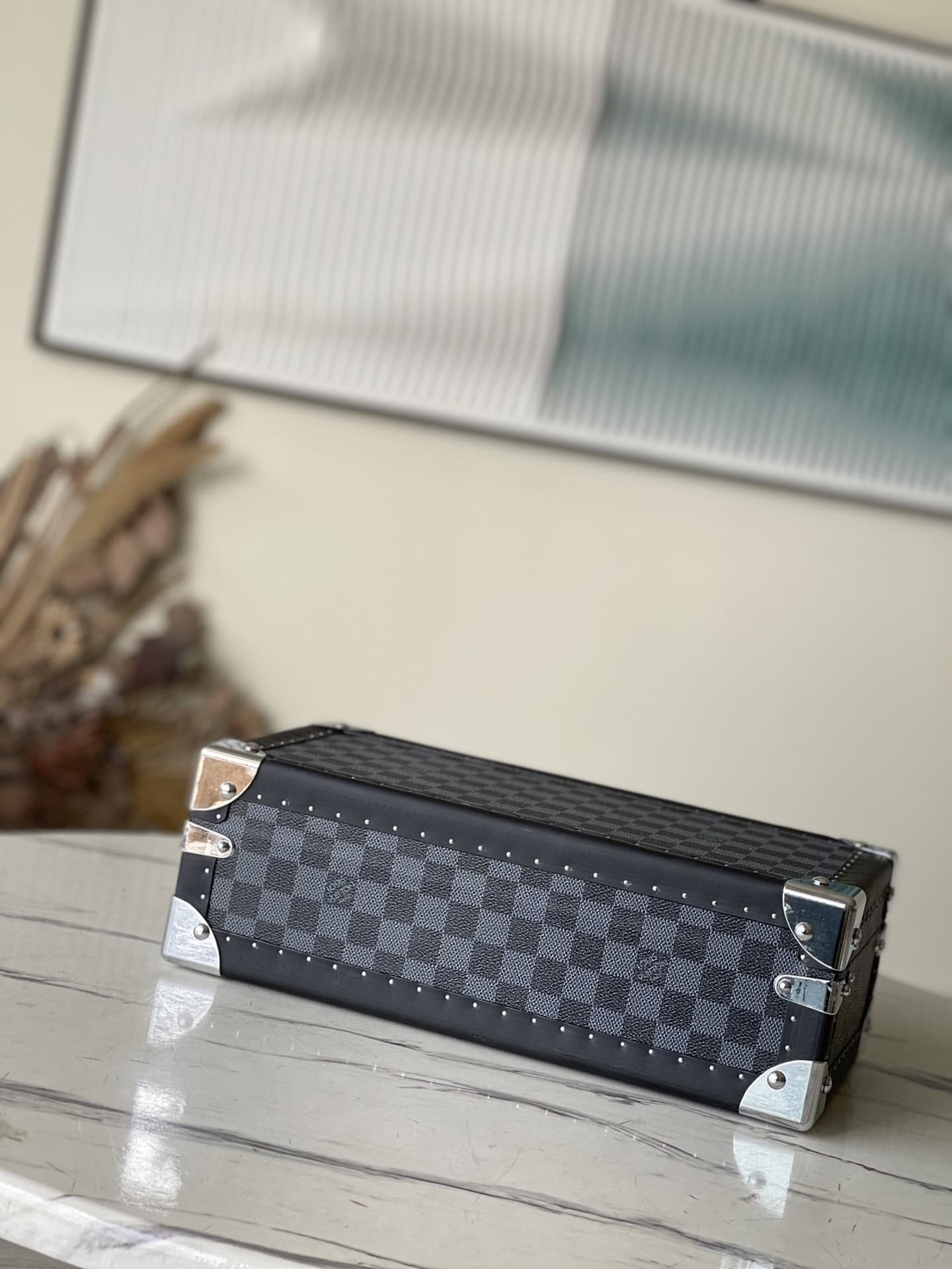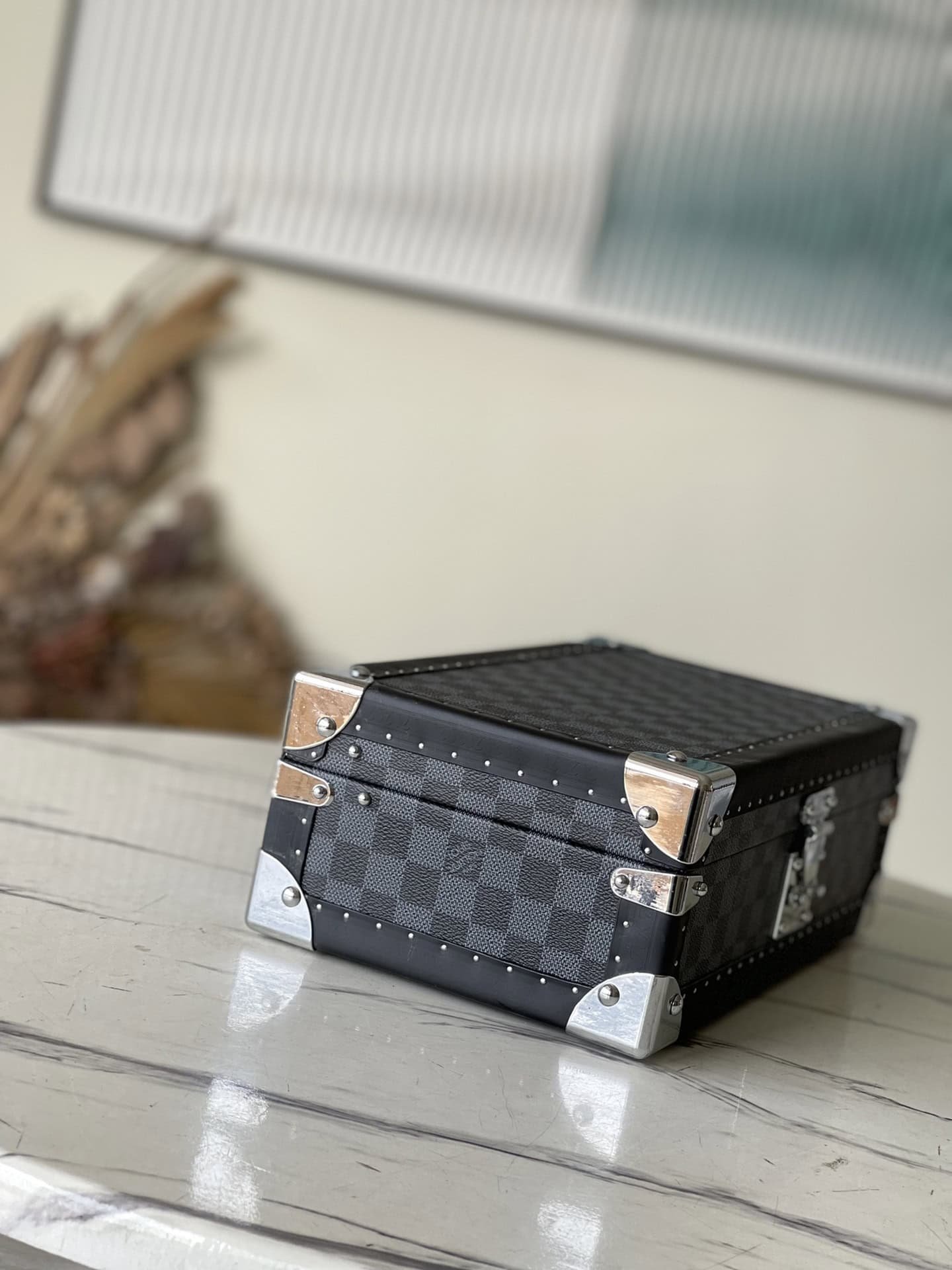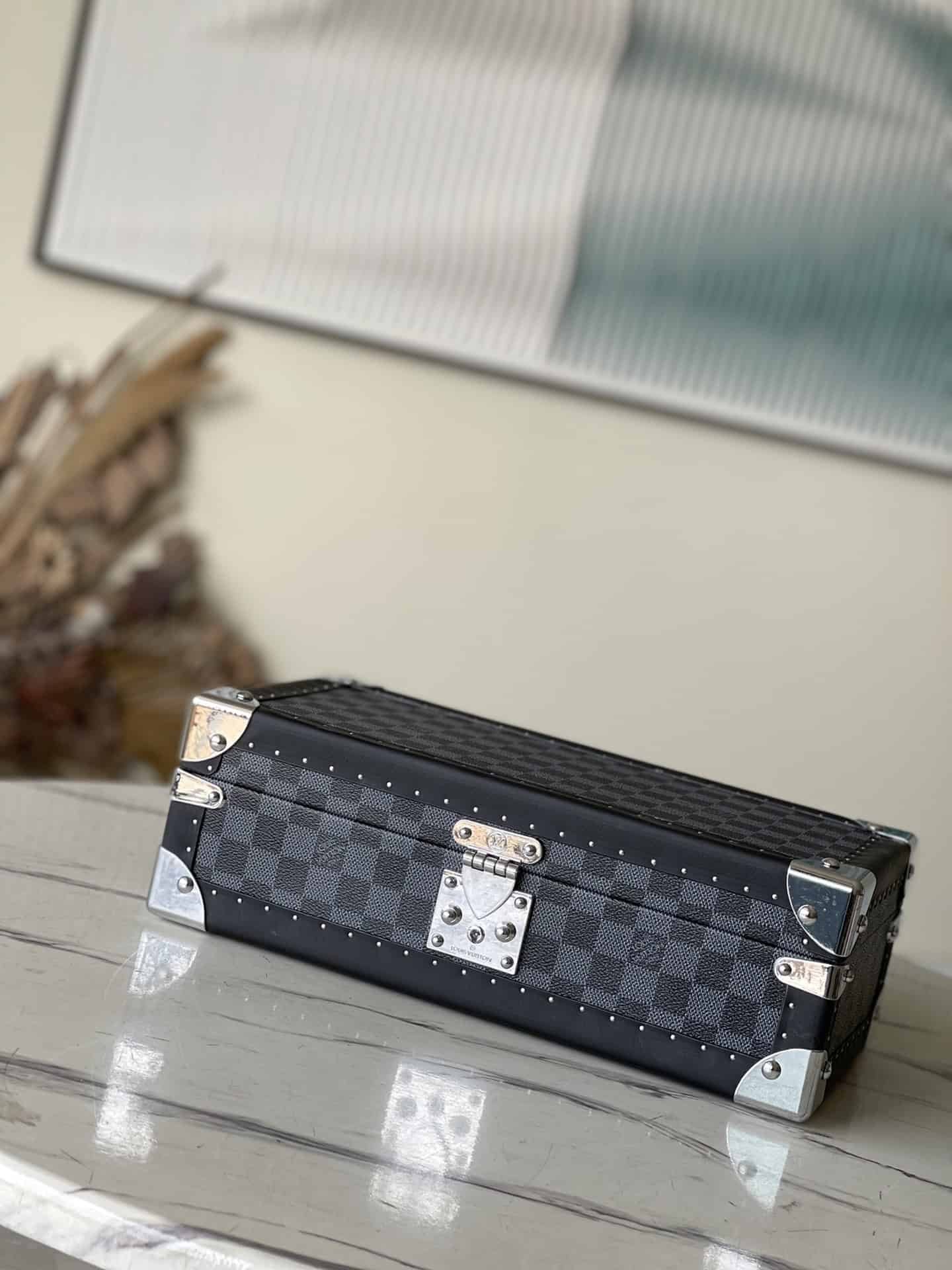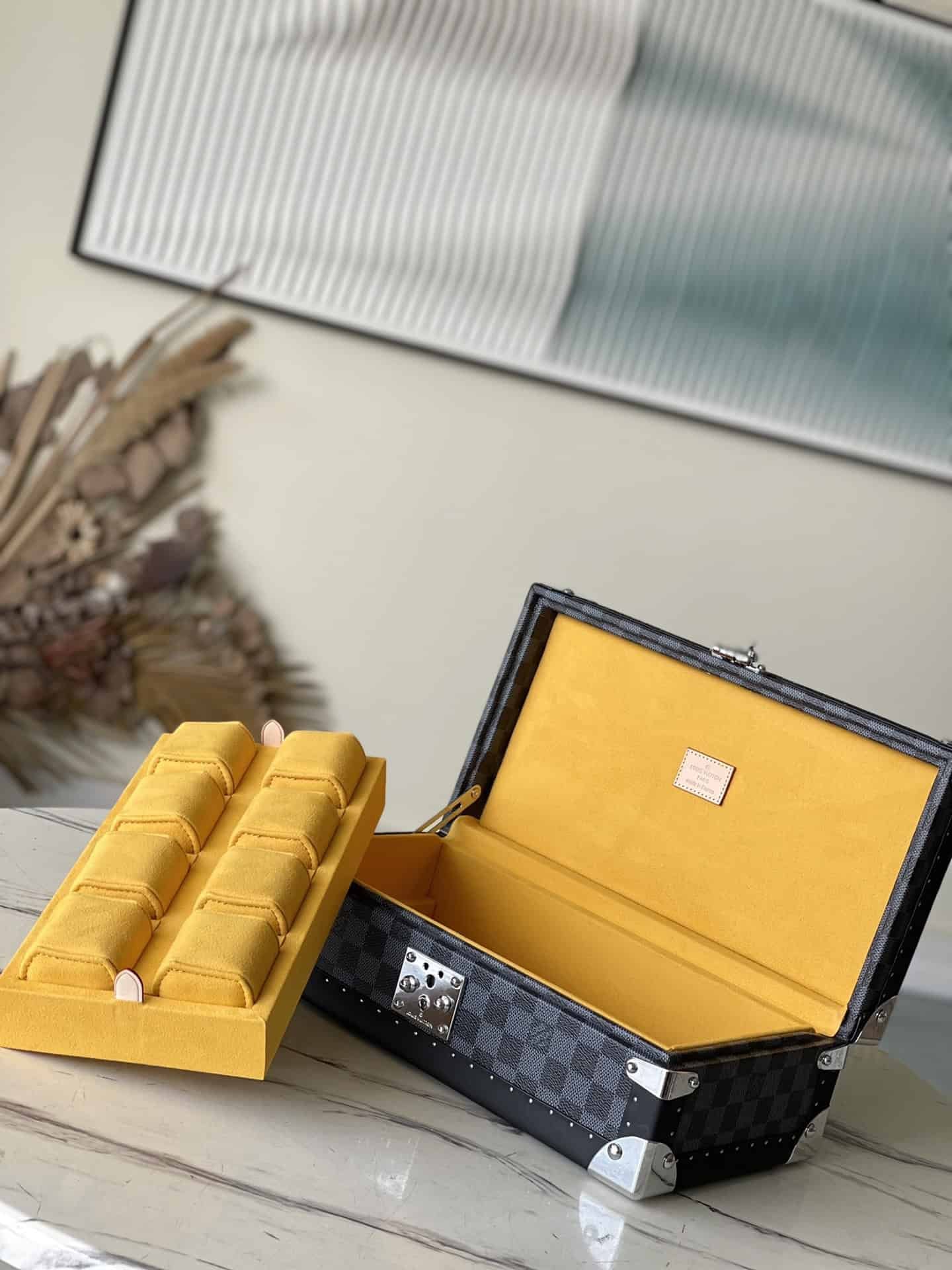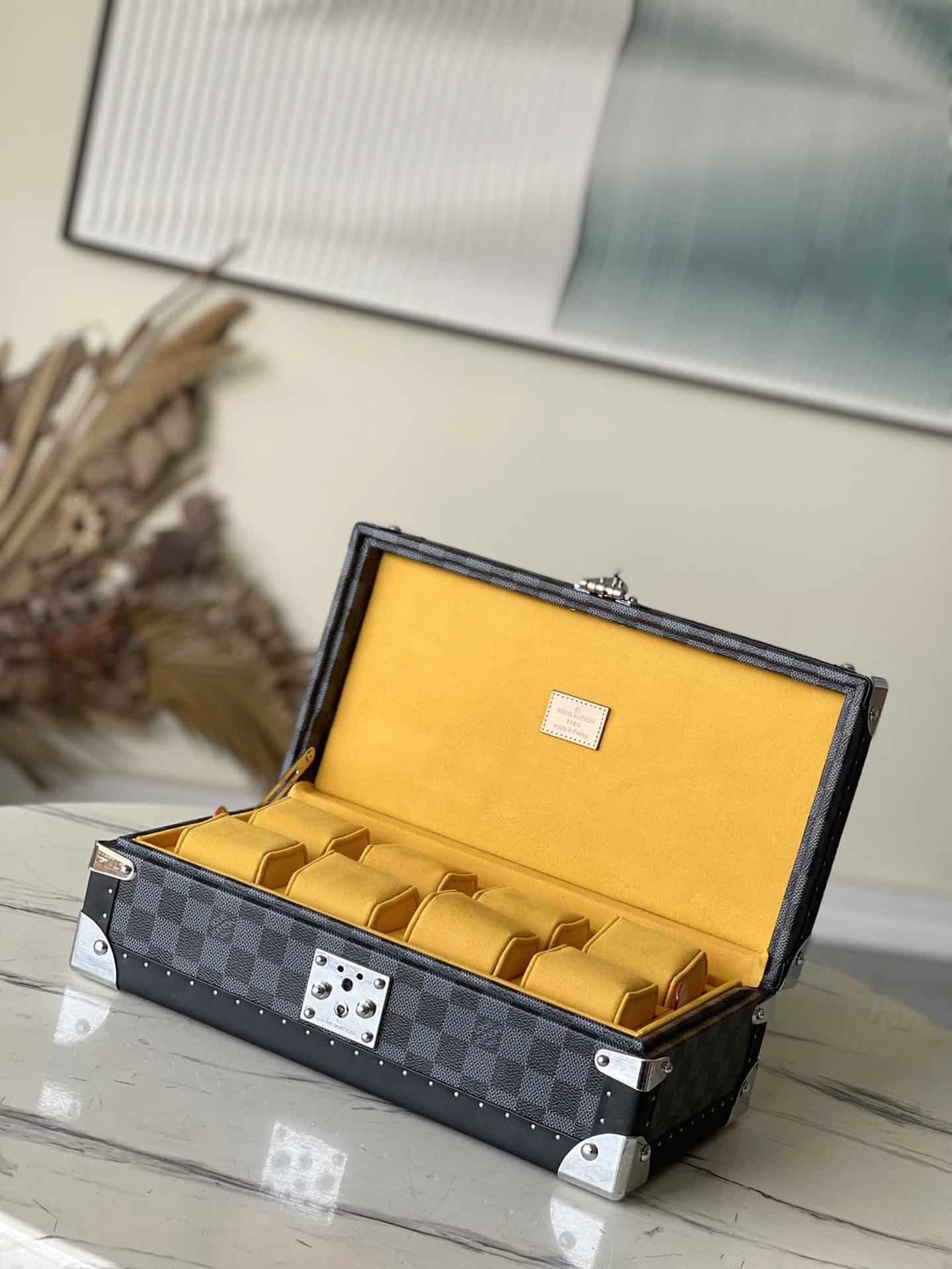 Heige Huangli This 8-piece watch case is made of classic Damier Garphite canvas. It stores conveniently from a safe to a suitcase and has a removable tray for stashing other valuables.