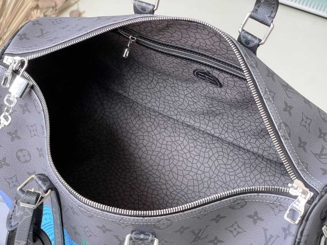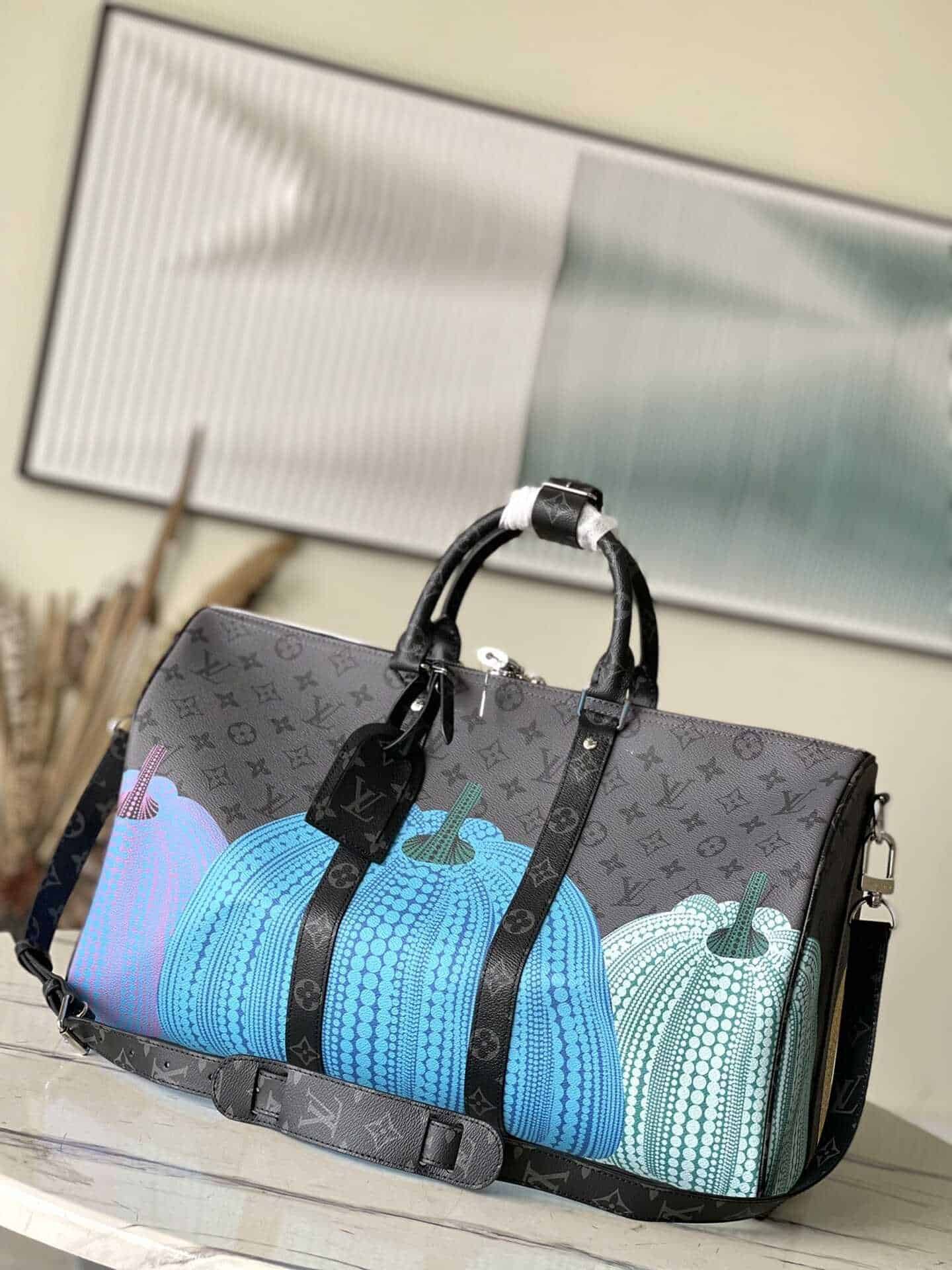 YK KEEPALL 45 travel bag Yayoi Kusama loved to depict pumpkins since she was a child, a symbol of warmth and comfort. The psychedelic pumpkin pattern is decorated with Monogram Eclipse Reverse canvas, another visual business card, and is also a collection choice.