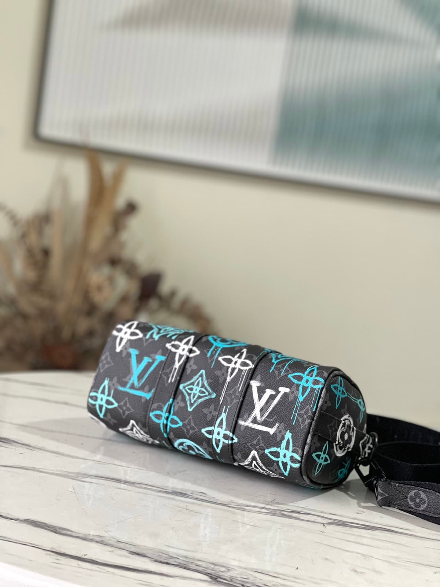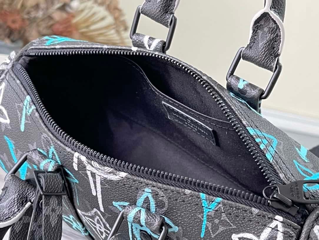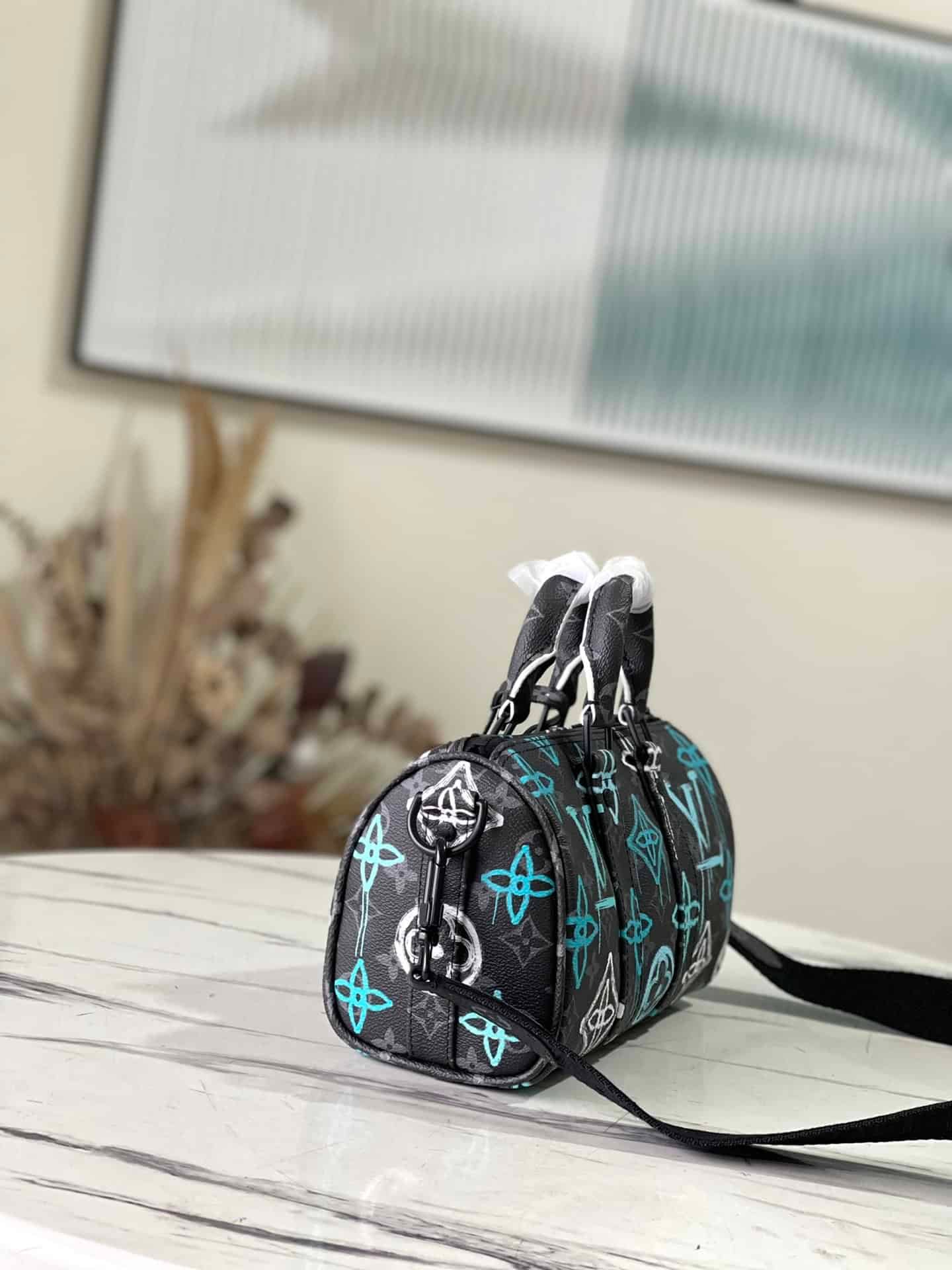This Keepall Bandoulière 25 handbag is made of Monogram Eclipse canvas, with a spray-painted Monogram pattern full of street art atmosphere. A compact design for urban mobility, the side straps and leather nameplate continue the signature elements of the Keepall duffle bag.