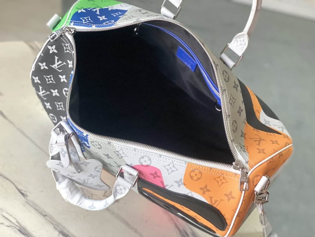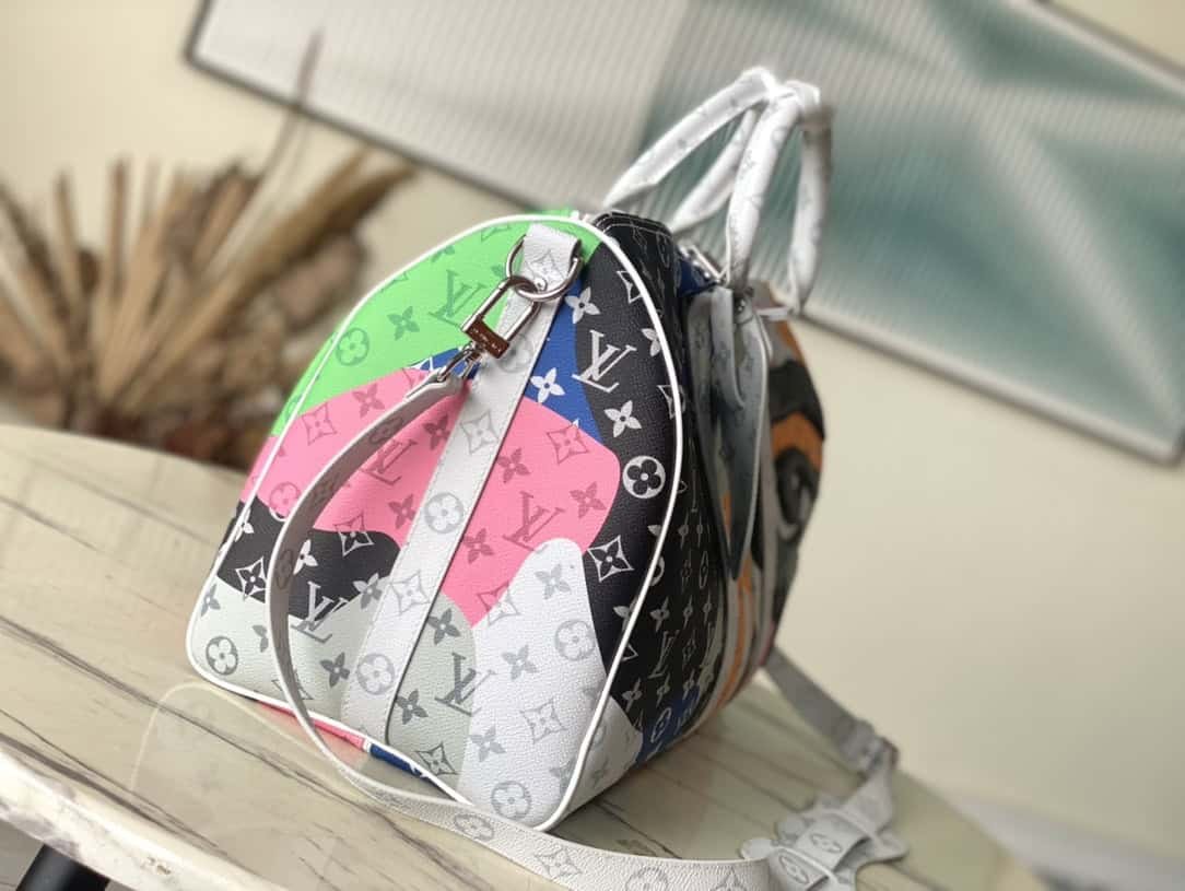 This Keepall Bandouliere45 travel bag combines Monogram coated canvas and cow leather, injecting fashion into the LV Portrait series. The abstract splicing on the Monogram pattern forms a mysterious face outline, and the eye-shaped leather patches on the front and rear enhance the three-dimensional look.