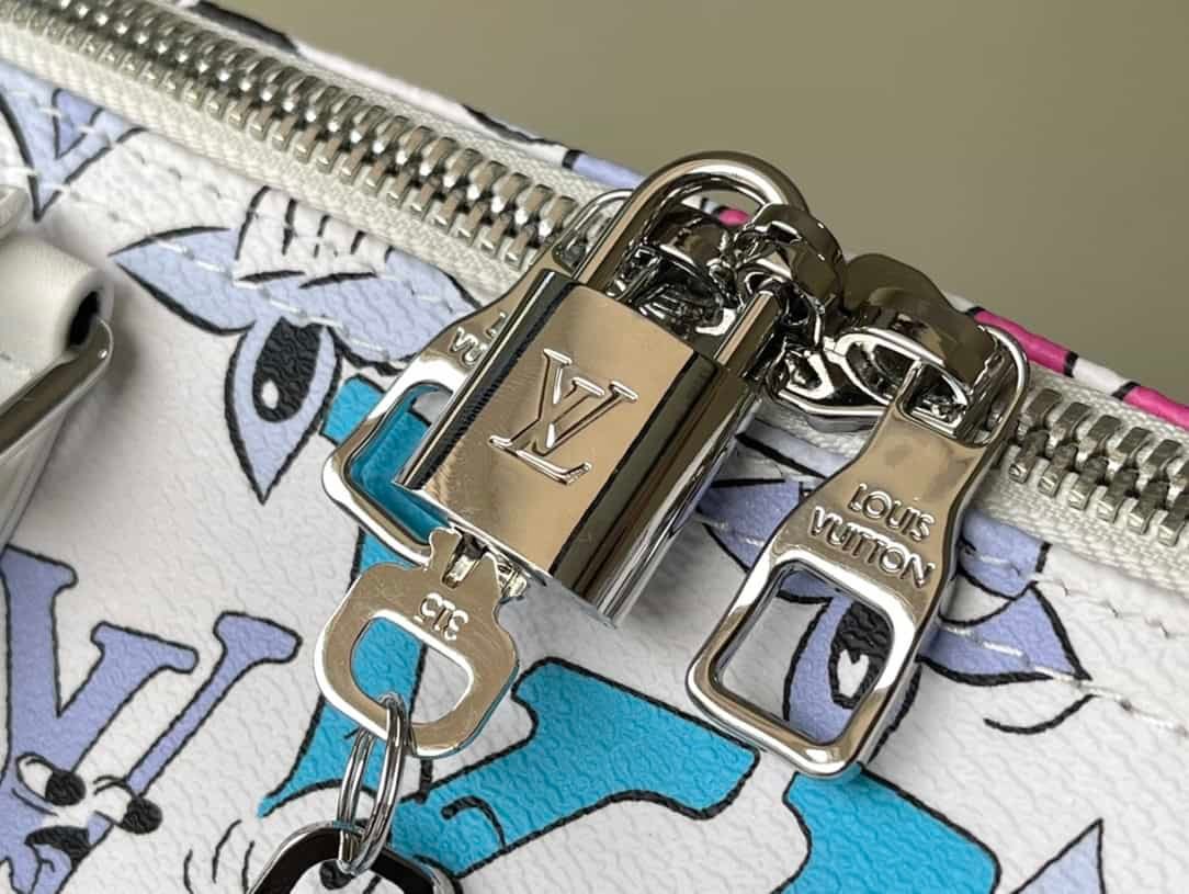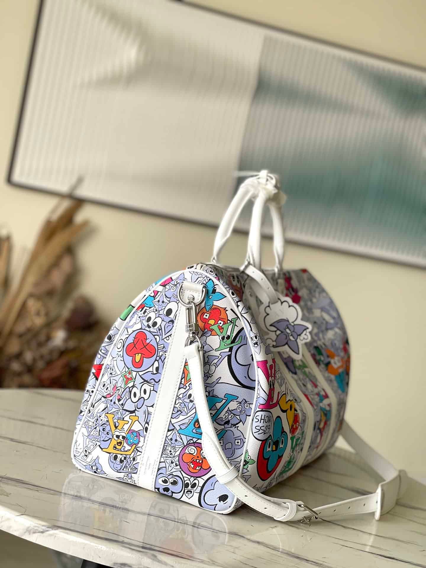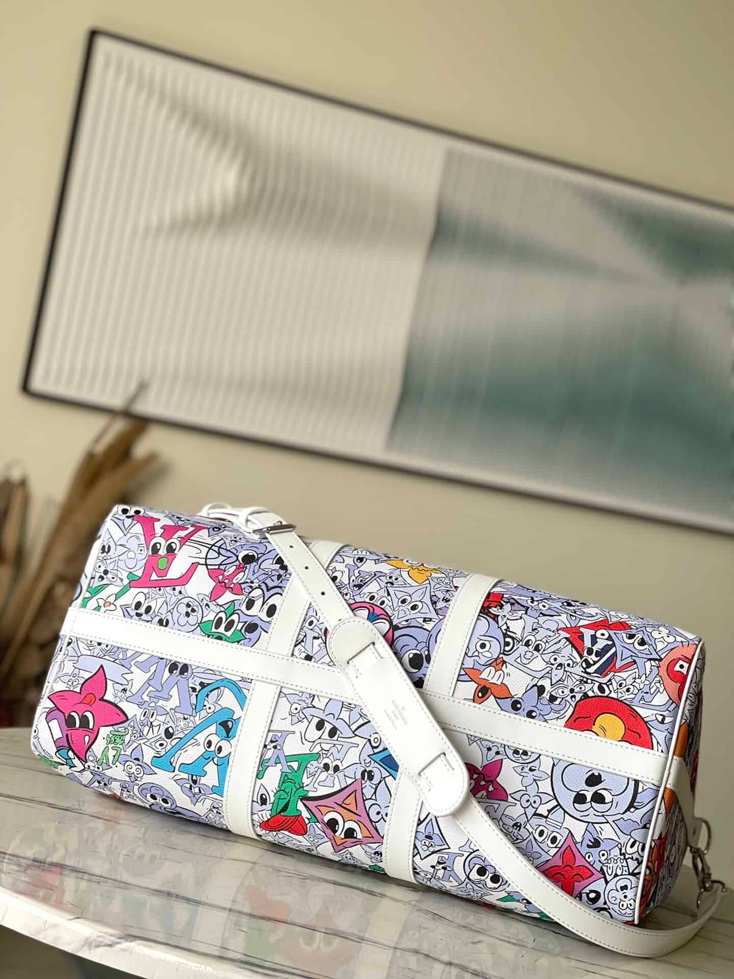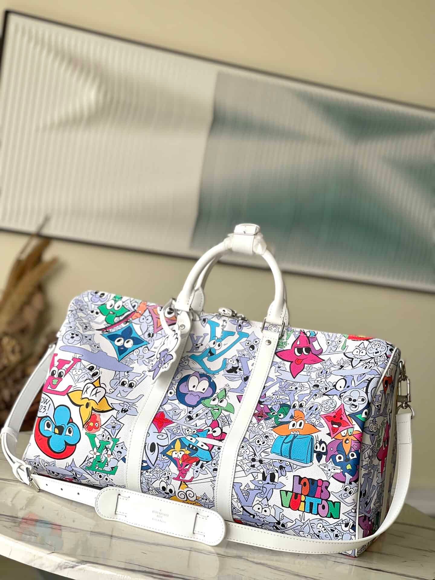 KEEPALL BANDOULIÈRE 50 travel bag Louis classic Keepall travel bag releases the modern innovation of Monogram Shadow leather. The signature Monogram pattern is exquisitely embossed in soft calf leather, and the white flower graffiti silk-screen travel bag has ample capacity and the size of carry-on luggage is suitable for short-distance travel.