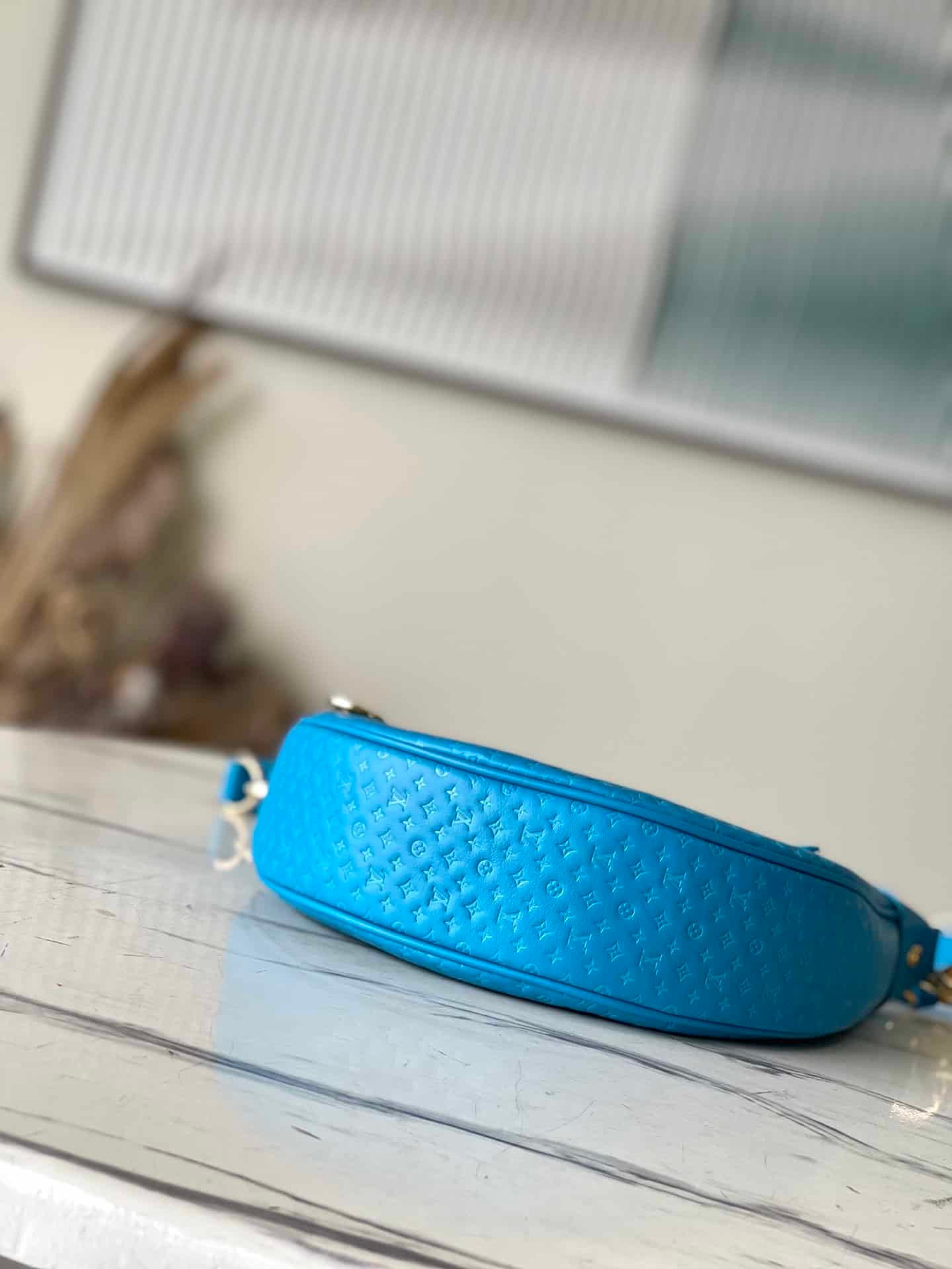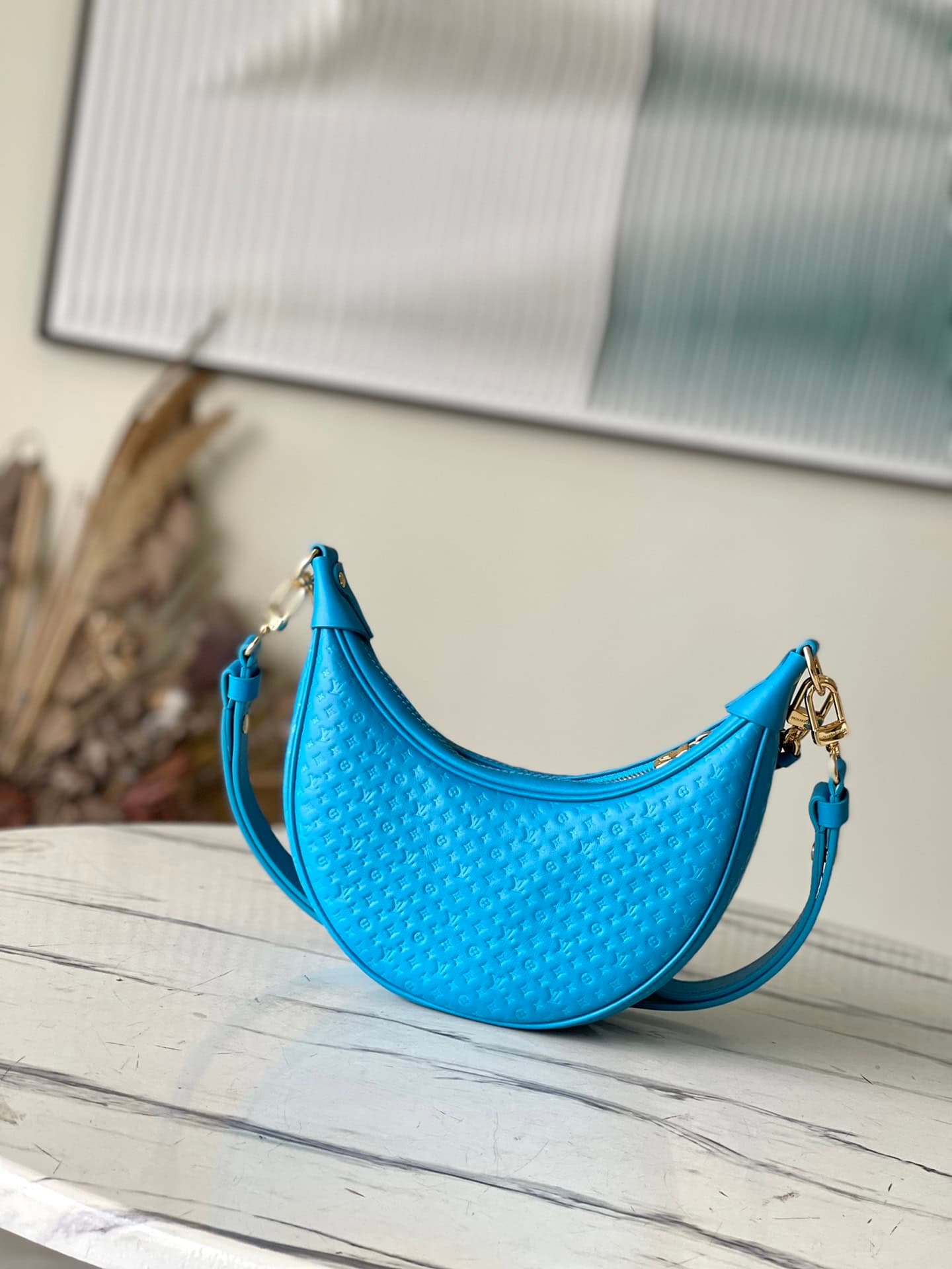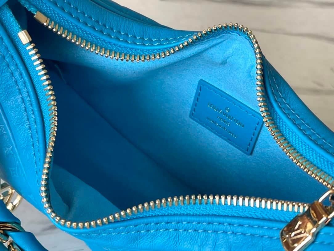 Blue Loop bag in calf leather with Monogram pattern in miniature. The colorful silk-screened lettering and Monogram floral pattern gently contrast with the body of the bag. The chain and signature Circle zip pull have a bright finish.