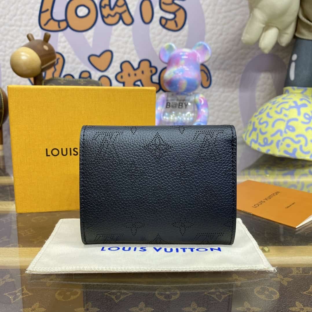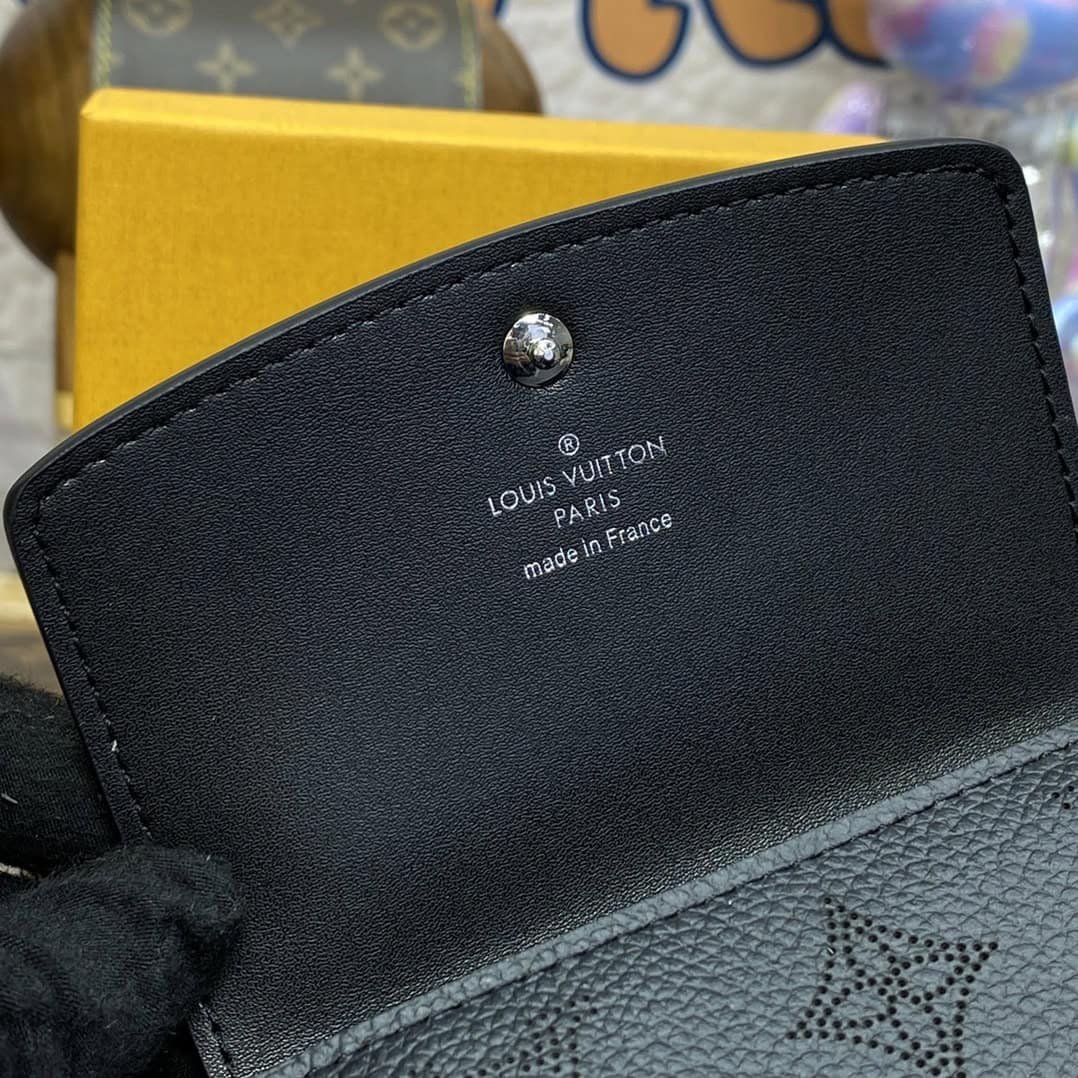This compact wallet can be easily stored in any handbag. Opening the curved flap reveals a functional interior compartment, including a credit card slot and a zippered coin compartment. – 6 credit card slots – 1 zippered coin compartment – 1 accordion compartment – 2 internal patch pockets – Mahina perforated calfskin – cowhide lining – silver metal hardware –