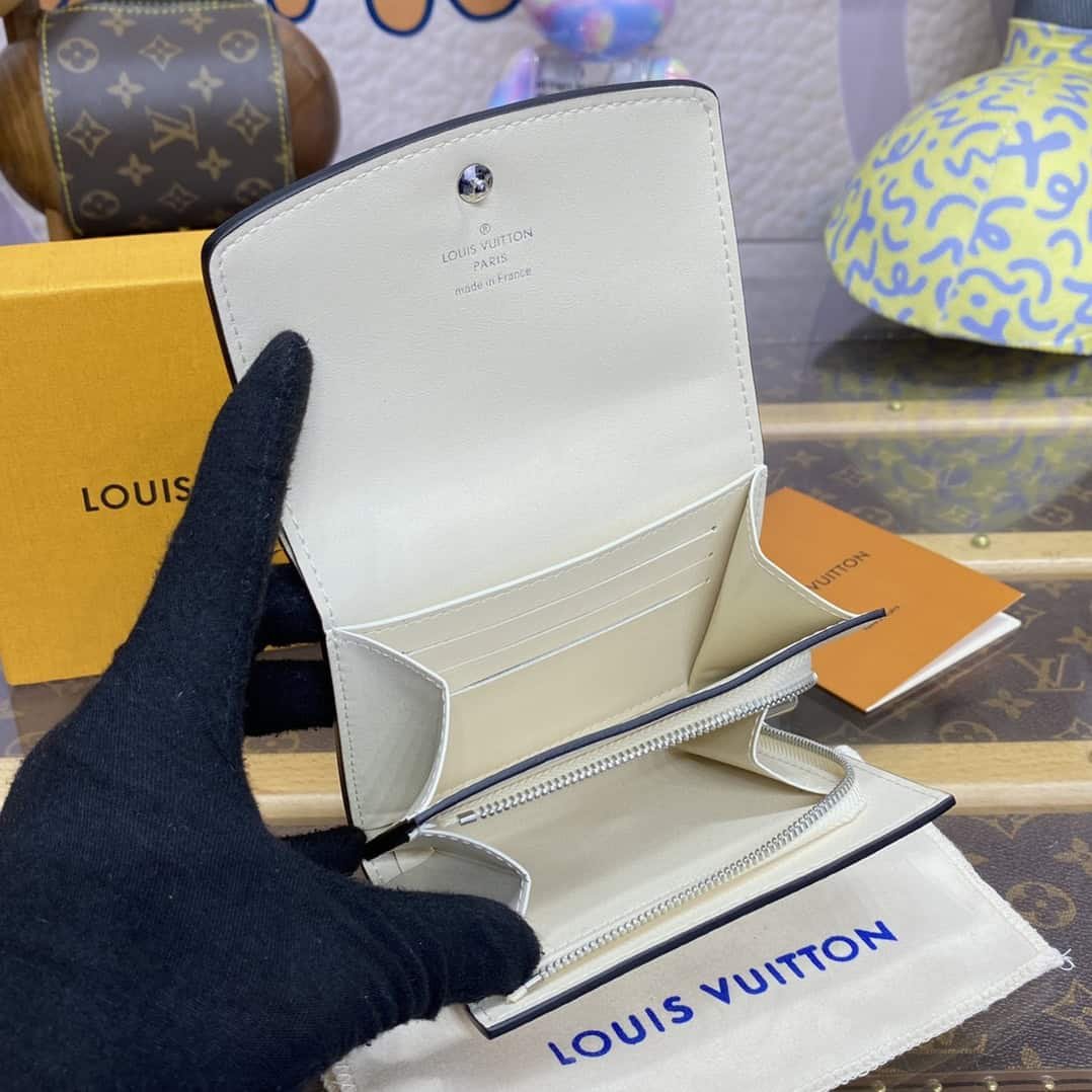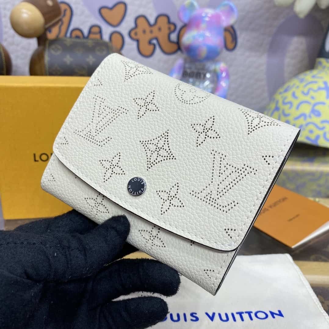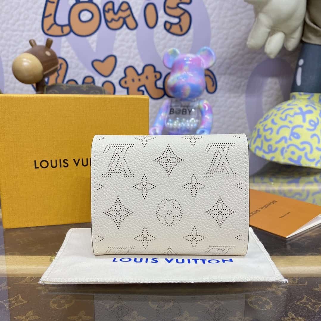 This compact wallet can be easily stored in any handbag. Opening the curved flap reveals a functional interior compartment, including a credit card slot and a zippered coin compartment. – 6 credit card slots – 1 zippered coin compartment – 1 accordion compartment – 2 internal patch pockets – Mahina perforated calfskin – cowhide lining – silver metal hardware –