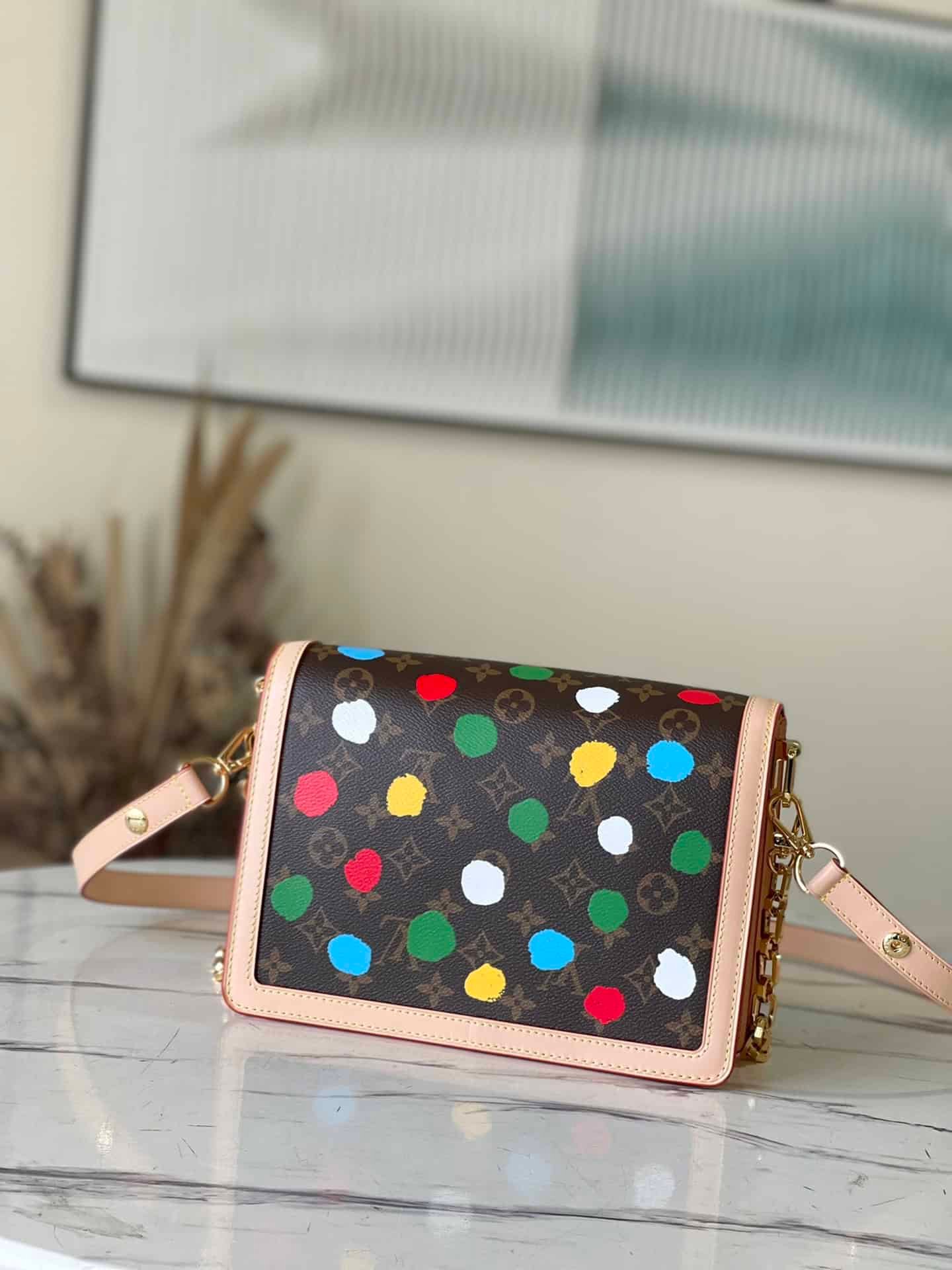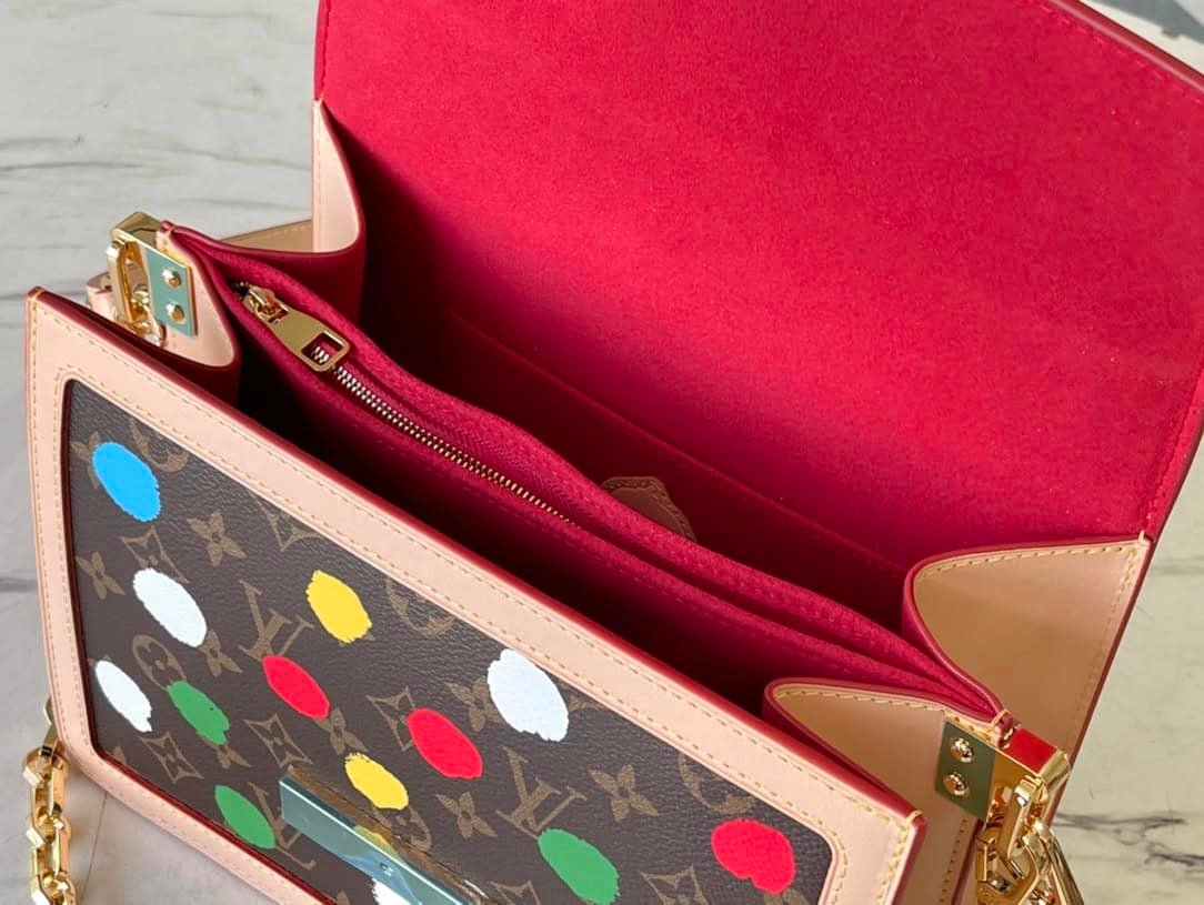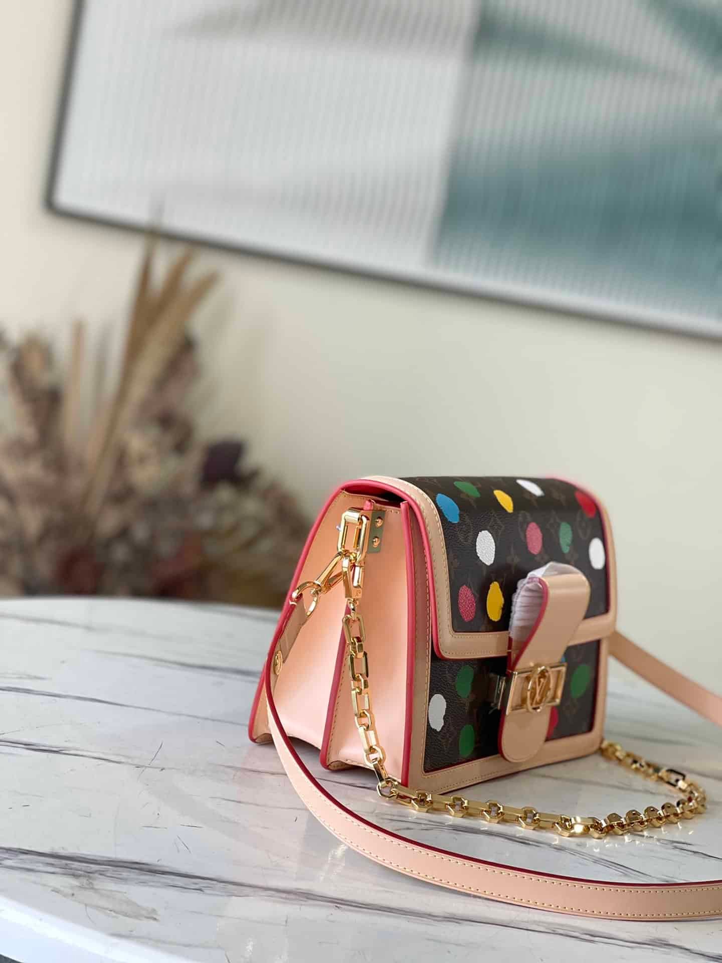 Yayoi Kusama cooperation series is LV x YK Dauphine medium handbag “hand-painted” polka dot pattern. Artist Yayoi Kusama has used polka dots as a creative medium since she was a child. This time, she used the silk screen printing process to lay out the Monogram canvas, which is as colorful and vivid as her own drawing, injecting creativity into the classic design.