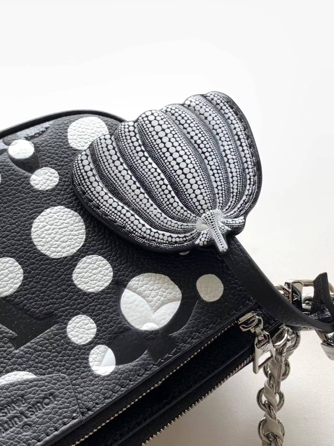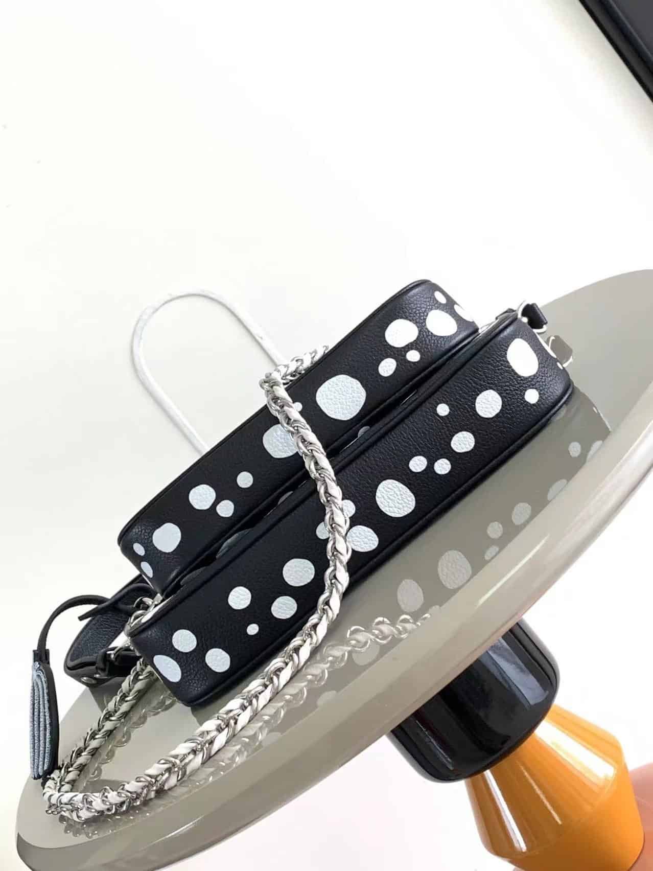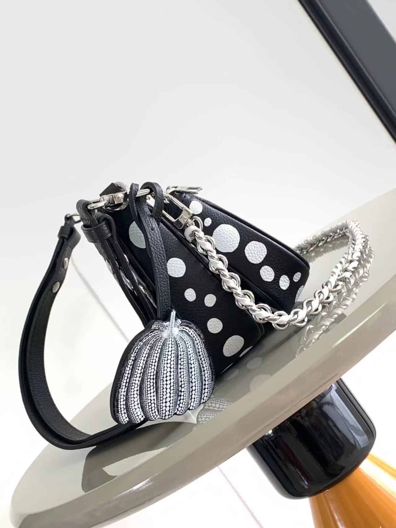 Louis Vuitton once again joined hands with Yayoi Kusama to inject new interest into this LV x YK Multi Pochette Accessoires handbag. The pattern of polka dots of different sizes is paved with Monogram embossed calfskin leather, reproducing the iconic elements in the works of the Japanese artist. The pumpkin-shaped decoration indicates another visual calling card of Yayoi Kusama.