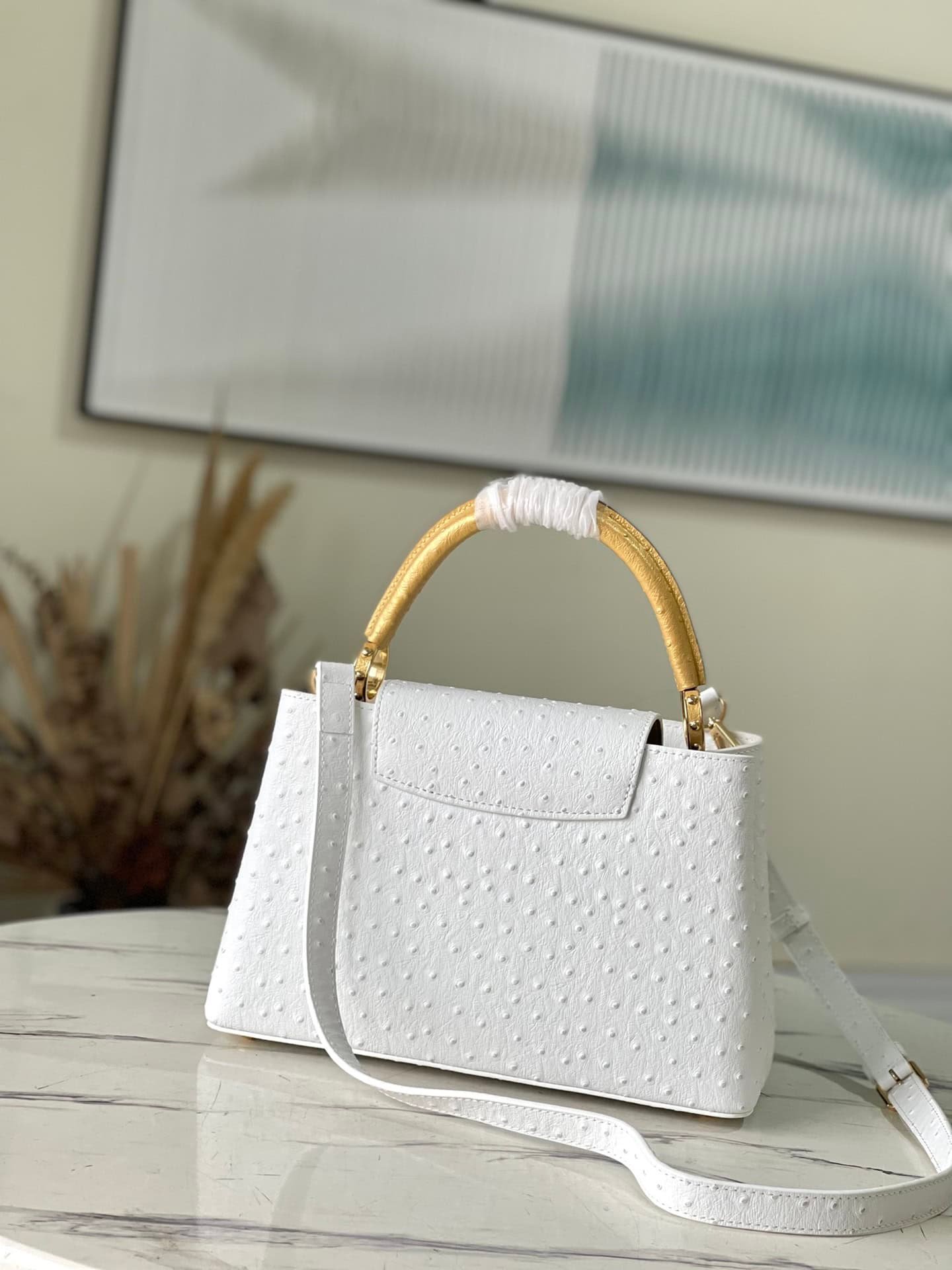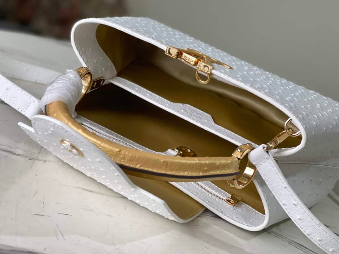 Medium-sized Capucines ostrich leather handbag with ostrich pattern in white gold, moderate hardness handle, gorgeous buckle connecting the handle, spacious and practical shape, etc. The drop cover can be used in two ways, and it can be placed outside the bag to show the fashion trend of the Monogram flower pattern.