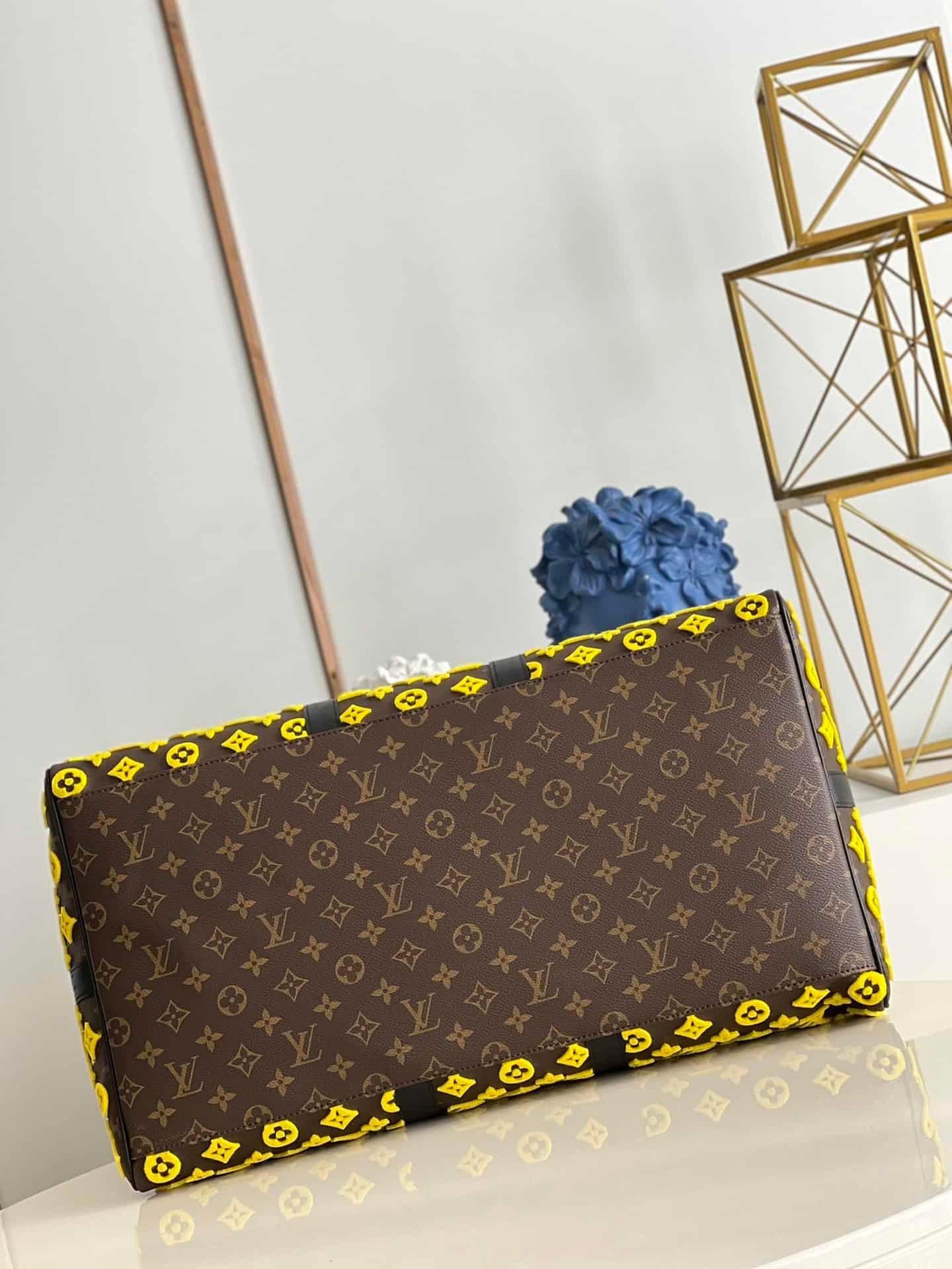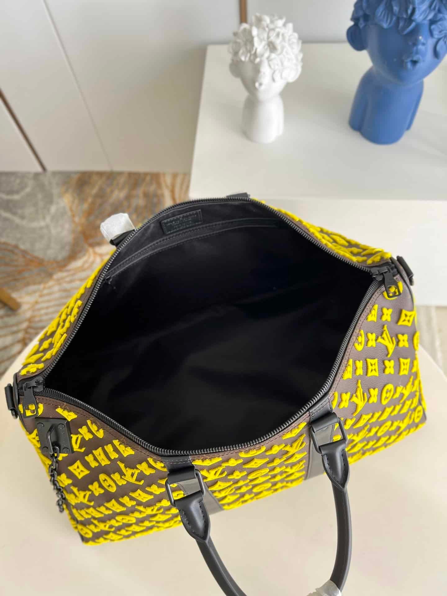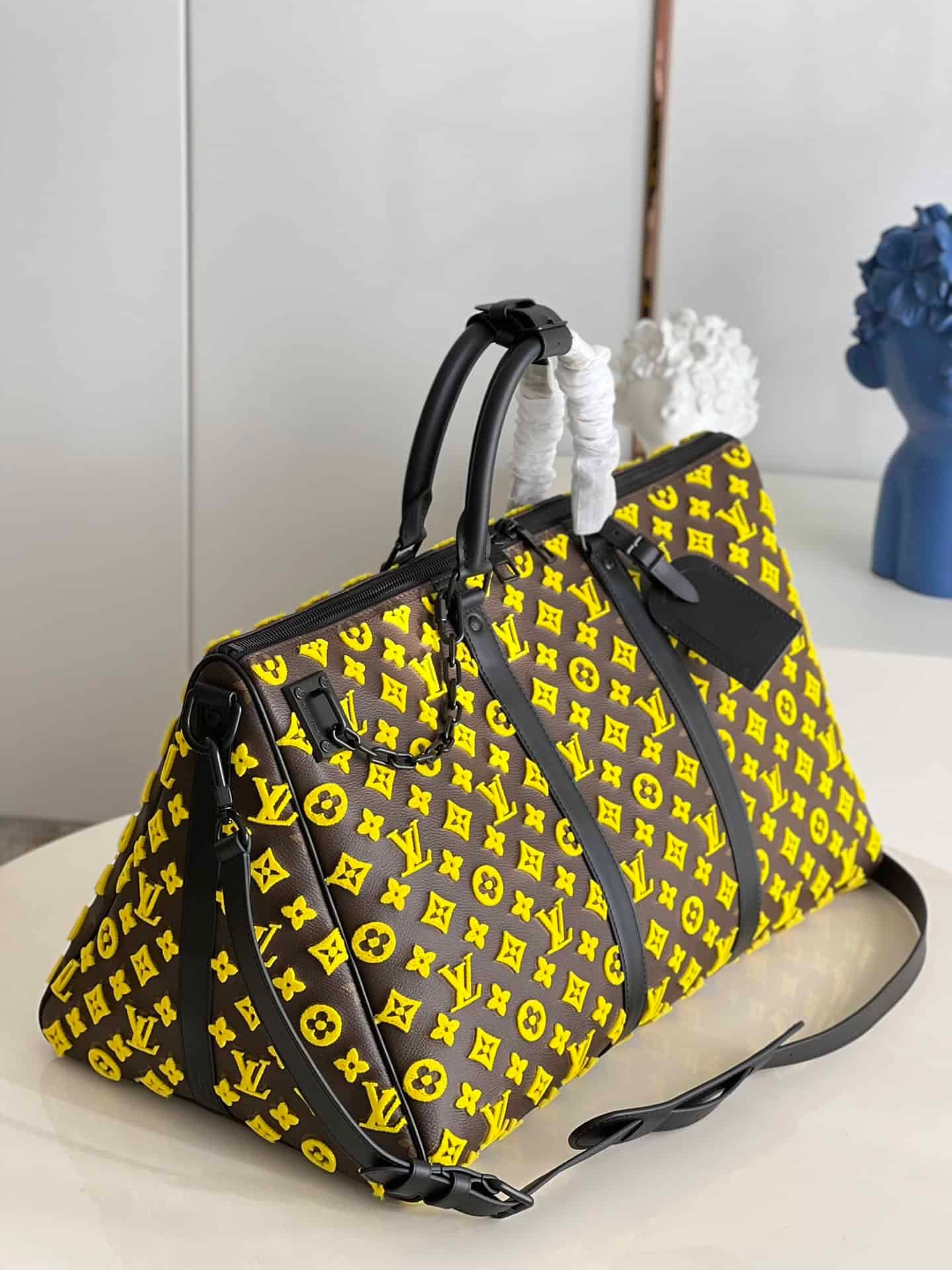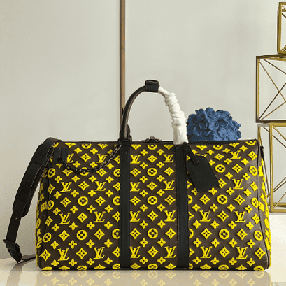 ellow Flocked Travel Bag Series Louis Vuitton Men’s Artistic Director Virgil Abloh interprets classic travel bags with interesting geometric shapes, creating a yellow Monogram Tuffetage canvas version of the Keepall Triangle BANDOULIÈRE 50 travel bag. The triangular shape is complemented by a pair of smooth leather top handles and side straps that complement the yellow Monogram embroidered background. This travel bag holds a variety of travel essentials.