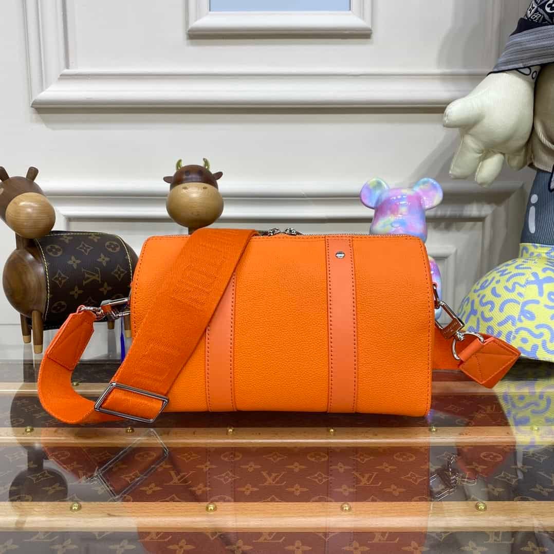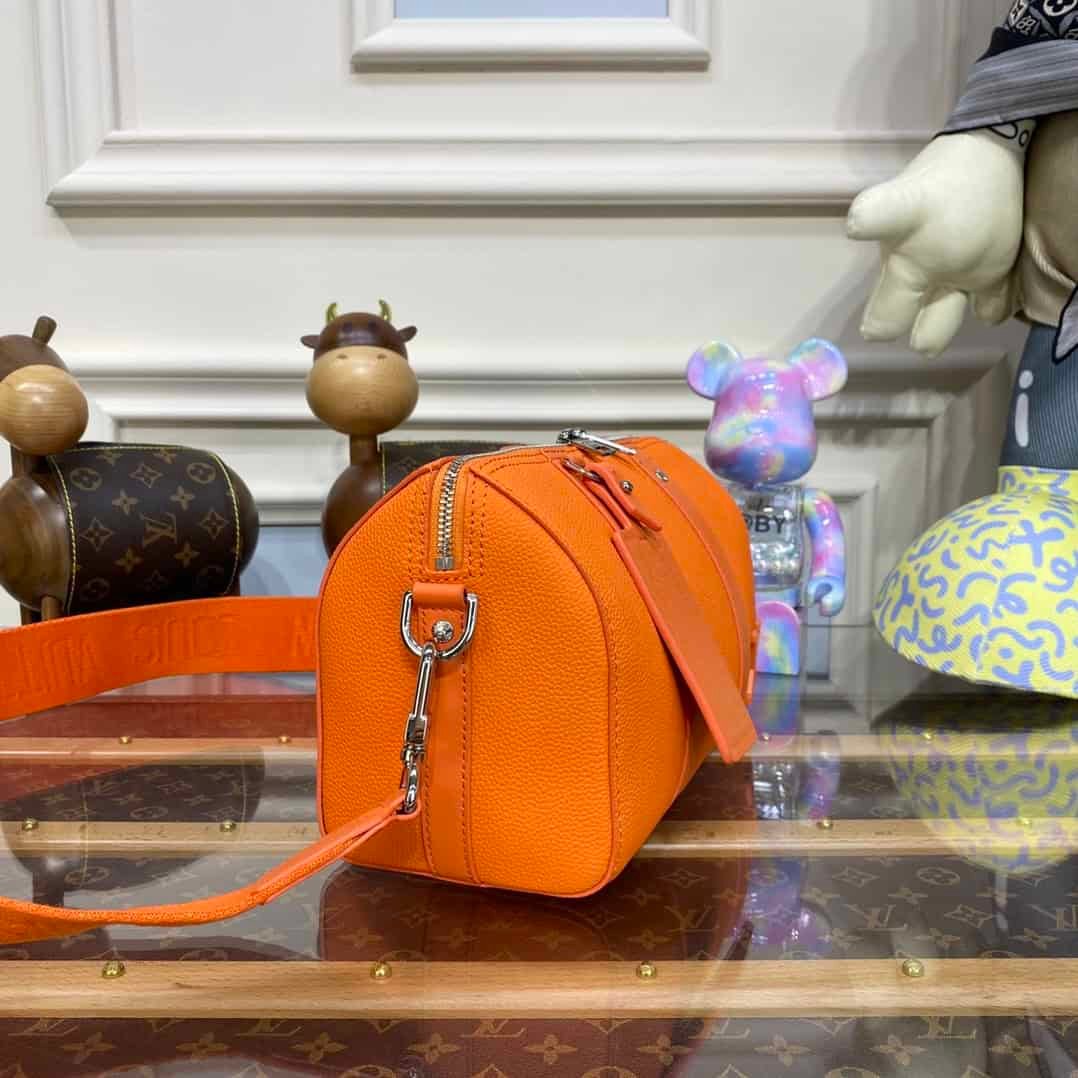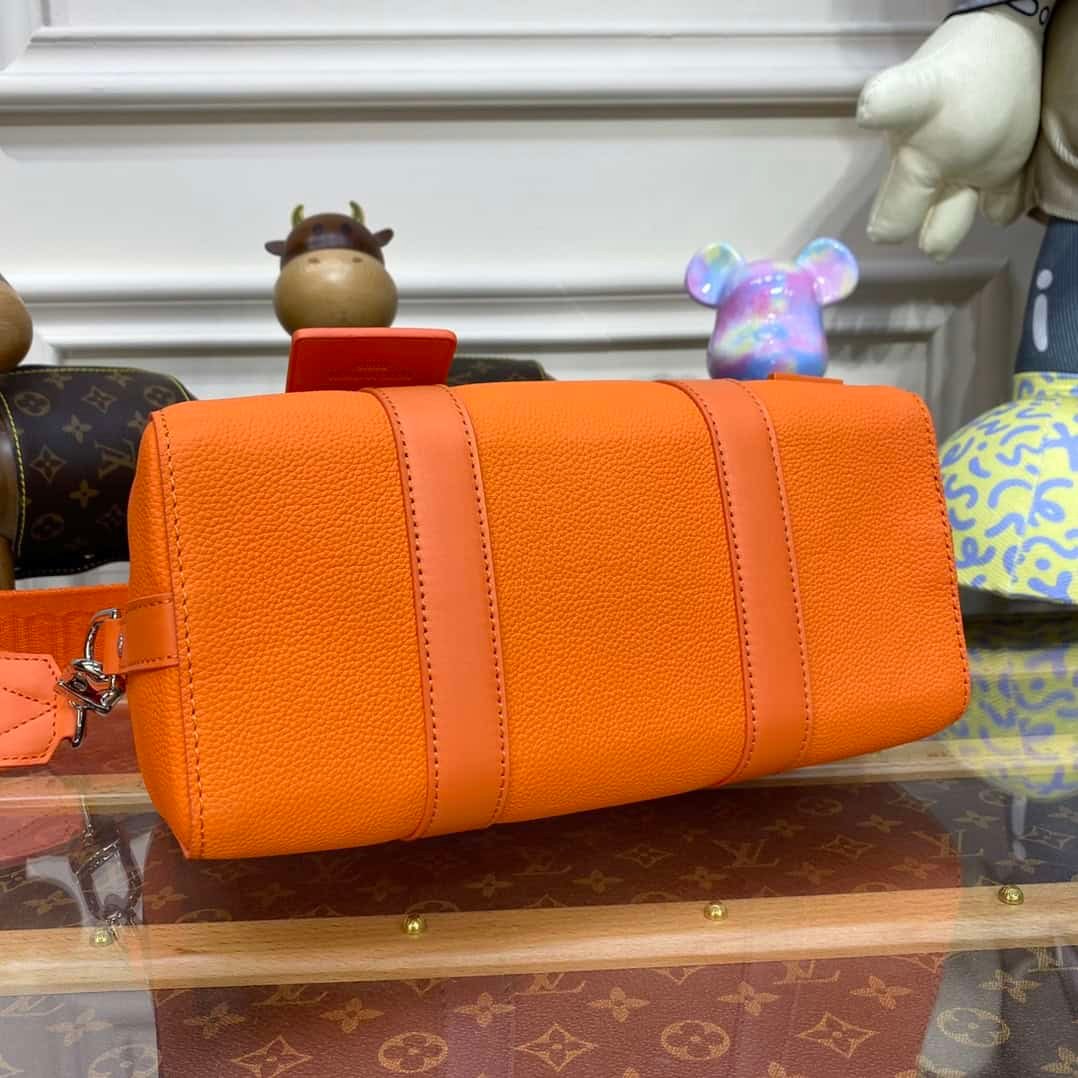 Menswear Artistic Director Virgil Abloh reimagines a classic bag – creating the Men’s City Keepall. Made of black grained leather with details in black and white Damier Distorted canvas. Decorated with initials.