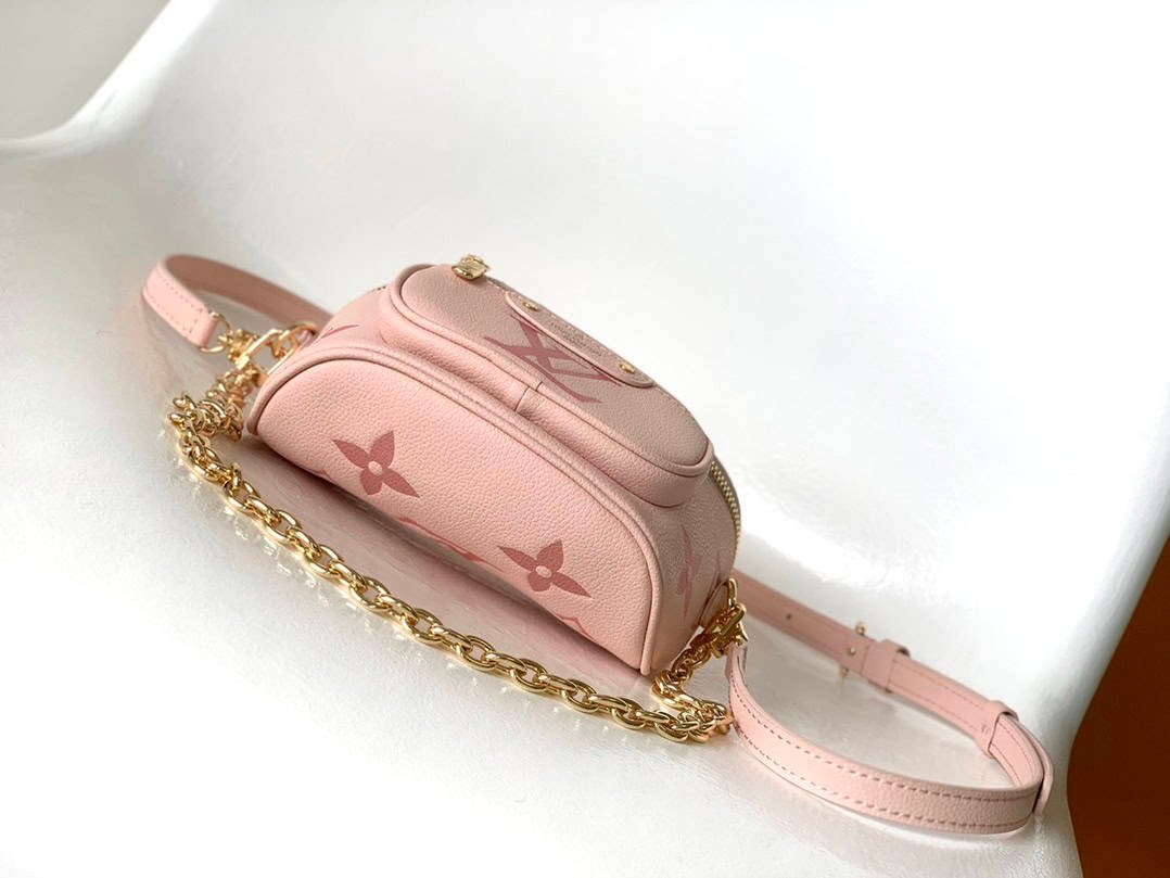 Mini Bumbag handbag from the LV Gradient series, which renders the gradient midsummer color for the Monogram embossing of Monogram Empreinte leather. The on-trend shape features a zipped main compartment, and a Louis Vuitton leather label accents the front pocket. Clever use of the detachable chain and detachable and adjustable shoulder strap, the shoulder and crossbody can be converted at will.