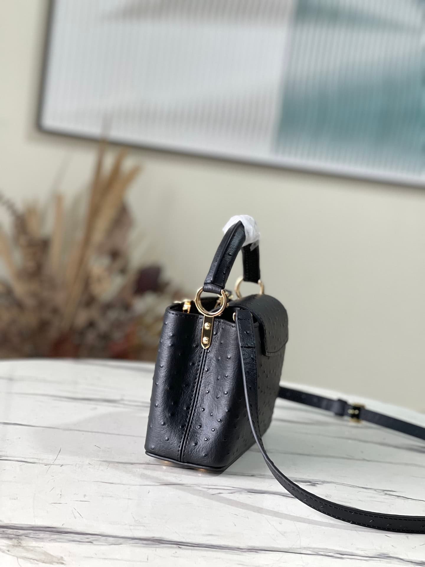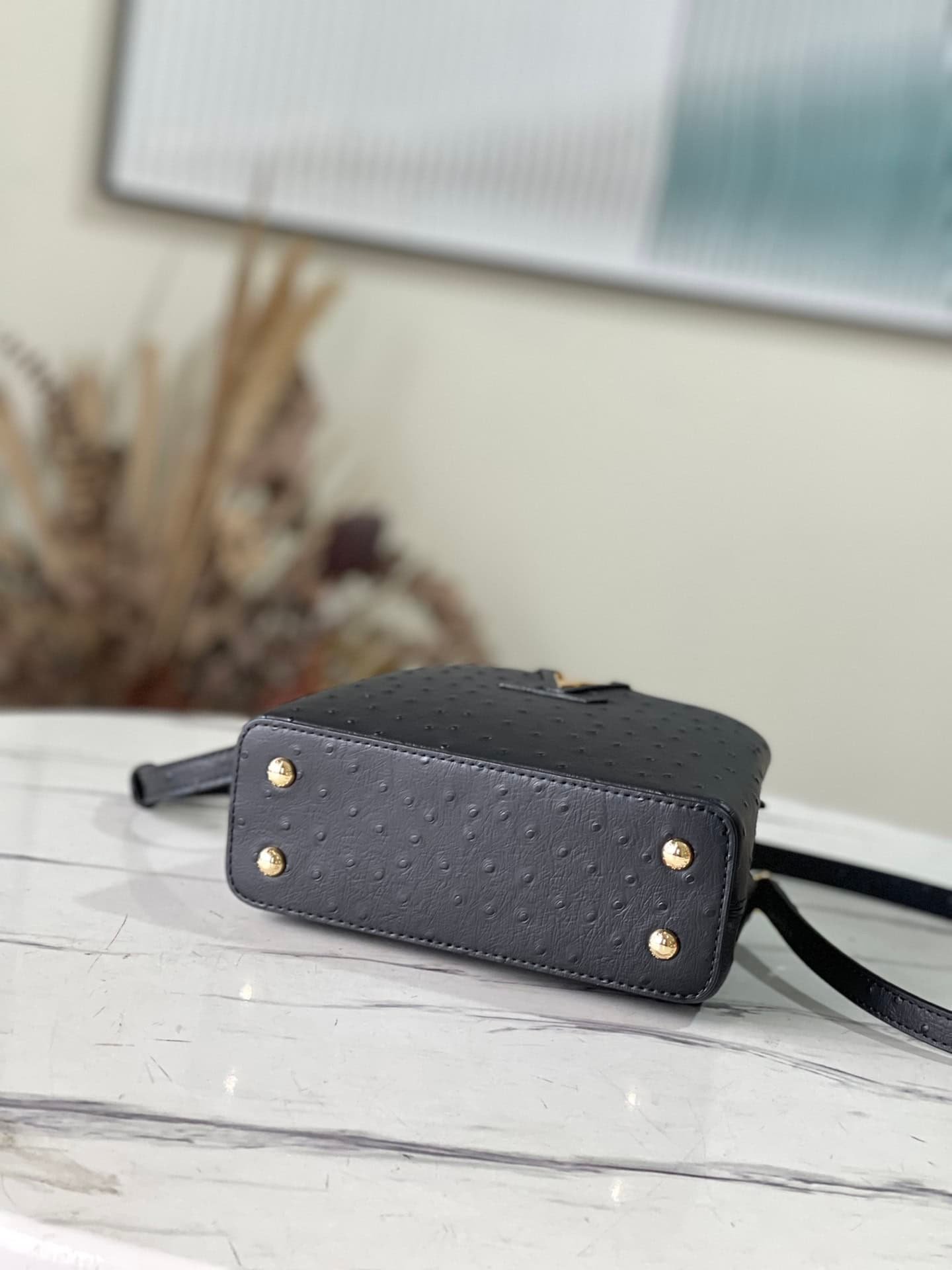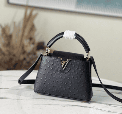 Black ostrich leather mini Capucines ostrich leather handbag, moderate hardness handle, gorgeous buckle connecting the handle, spacious and practical shape, etc. The drop cover can be used in two ways, and it can be placed outside the bag to show the fashion trend of the Monogram flower pattern.