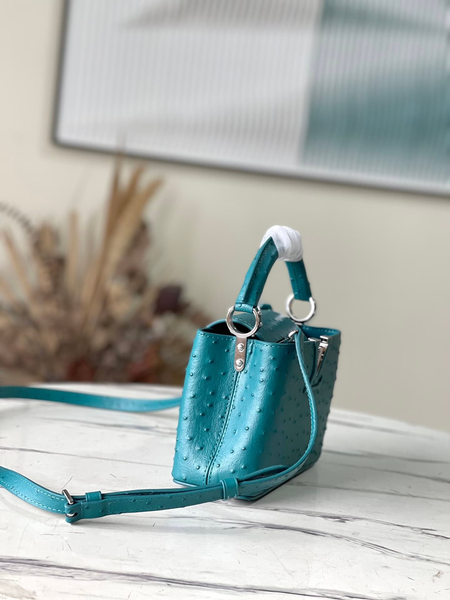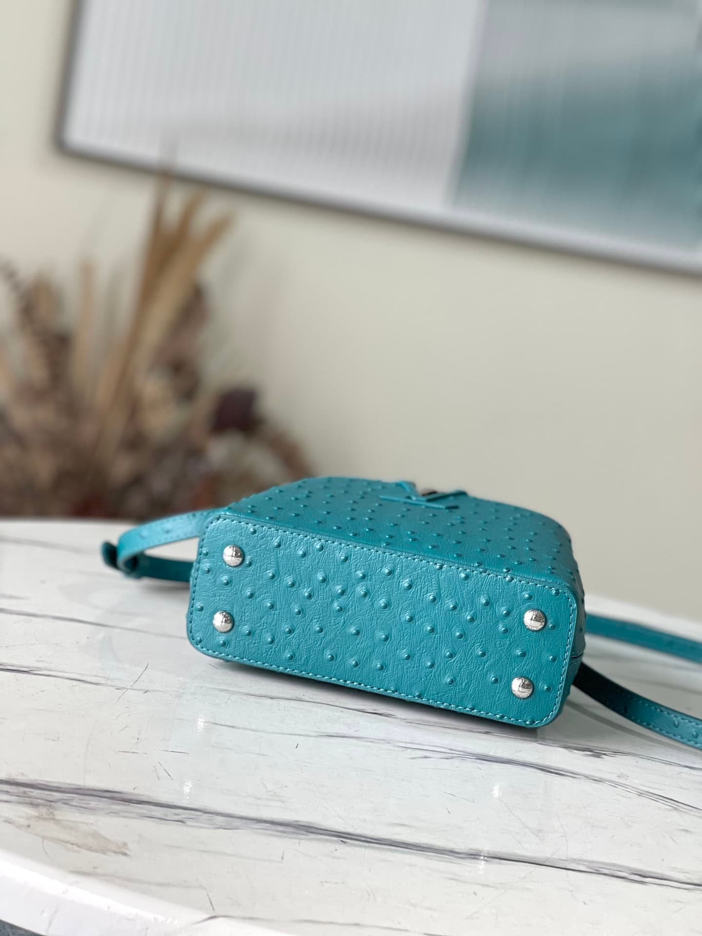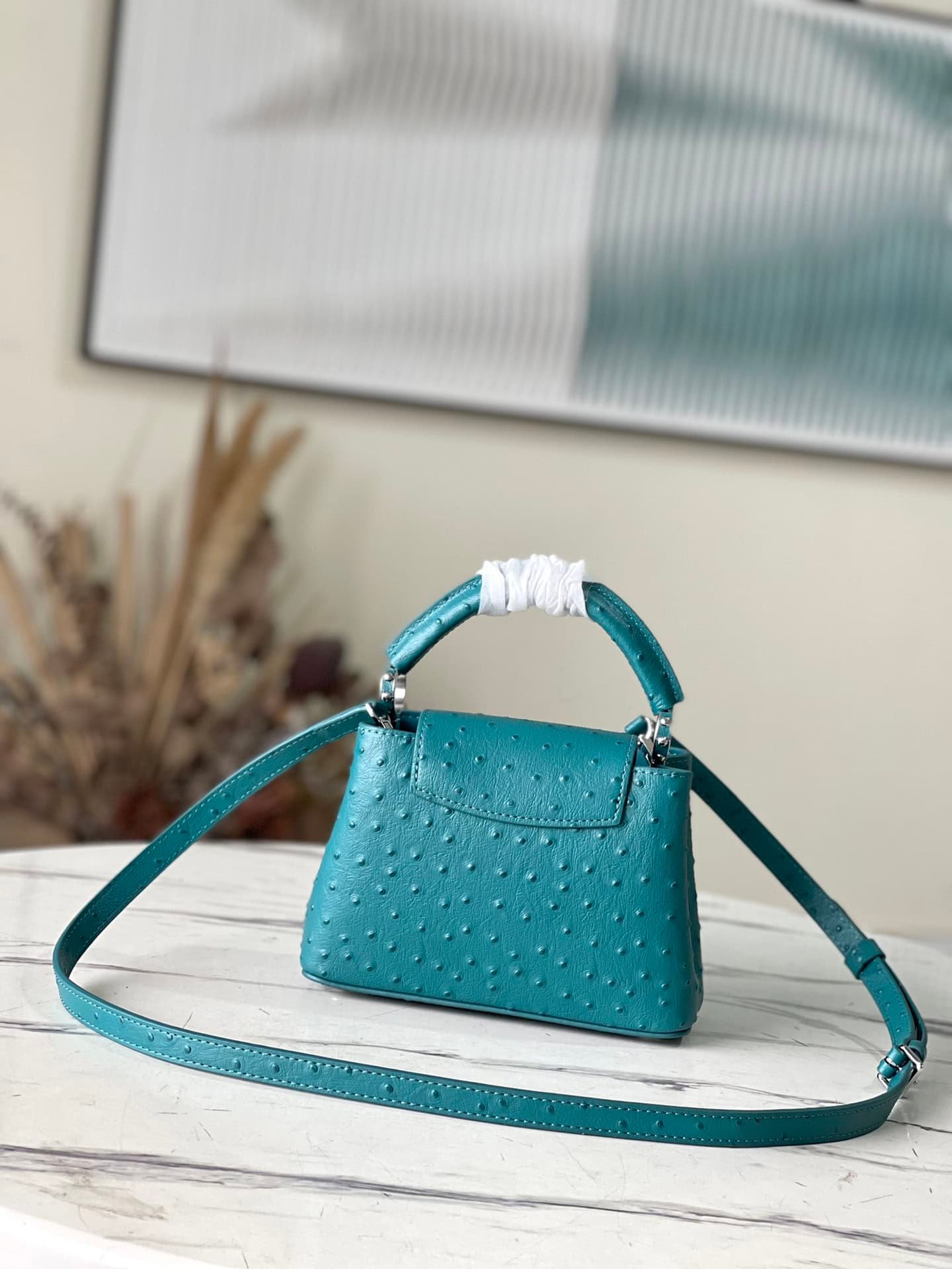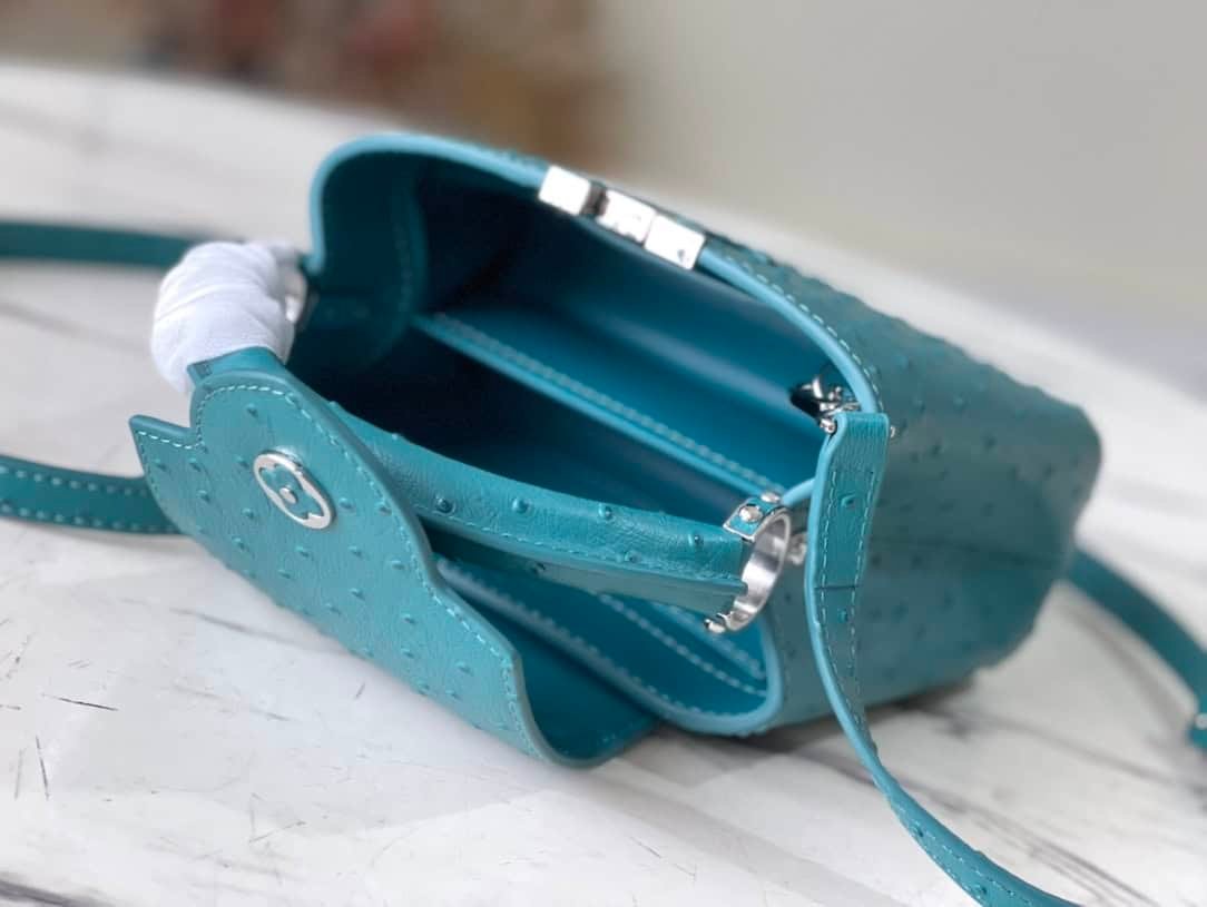 Blue ostrich leather mini Capucines ostrich leather handbag, moderate hardness handle, gorgeous buckle connecting the handle, spacious and practical shape, etc. The drop cover can be used in two ways, and it can be placed outside the bag to show the fashion trend of the Monogram flower pattern.