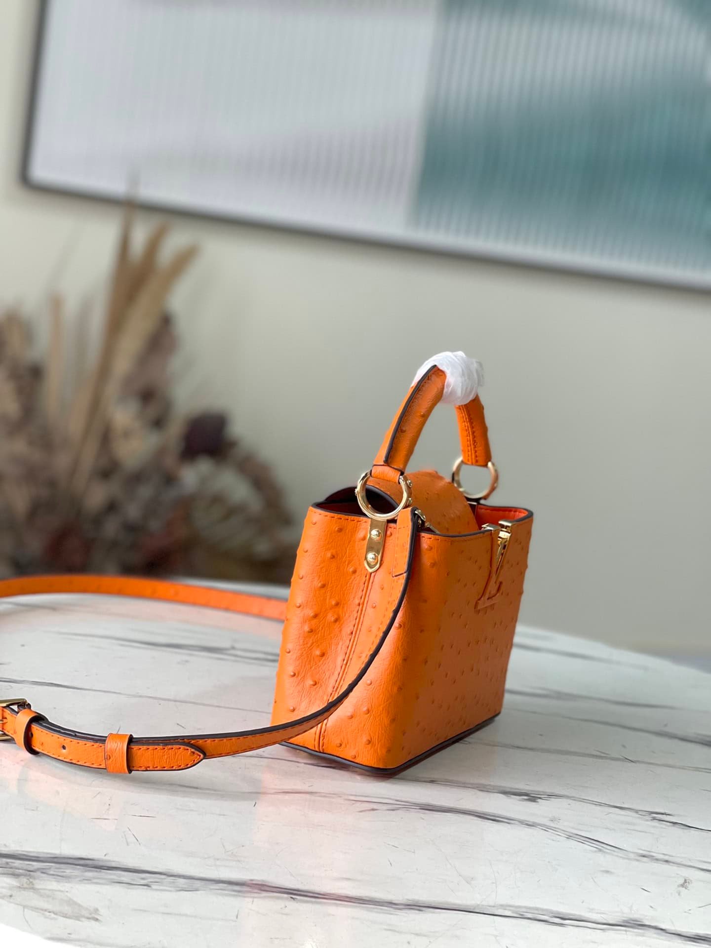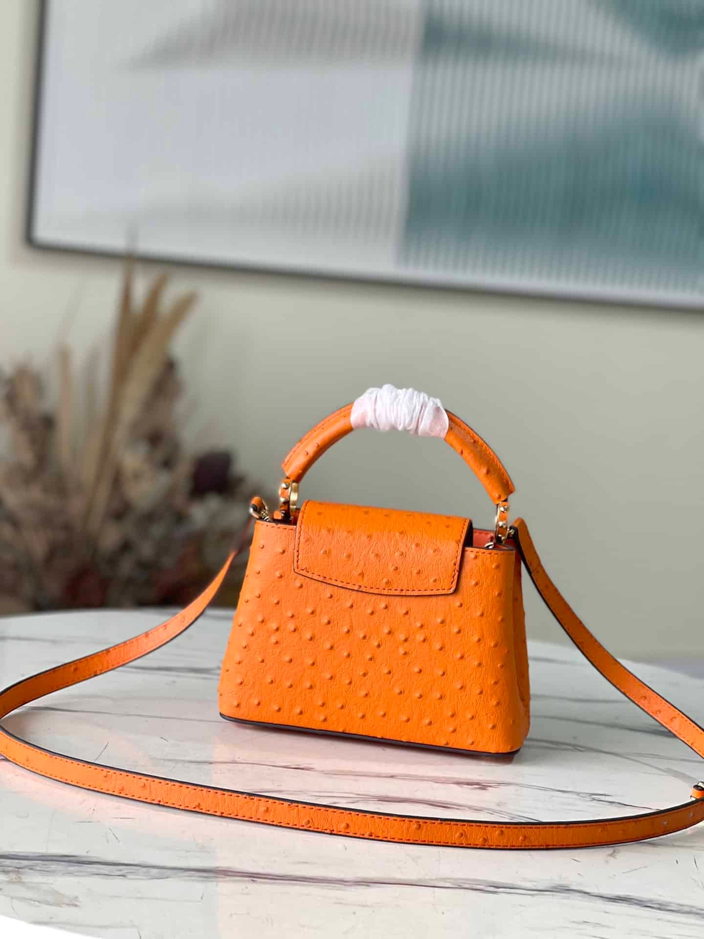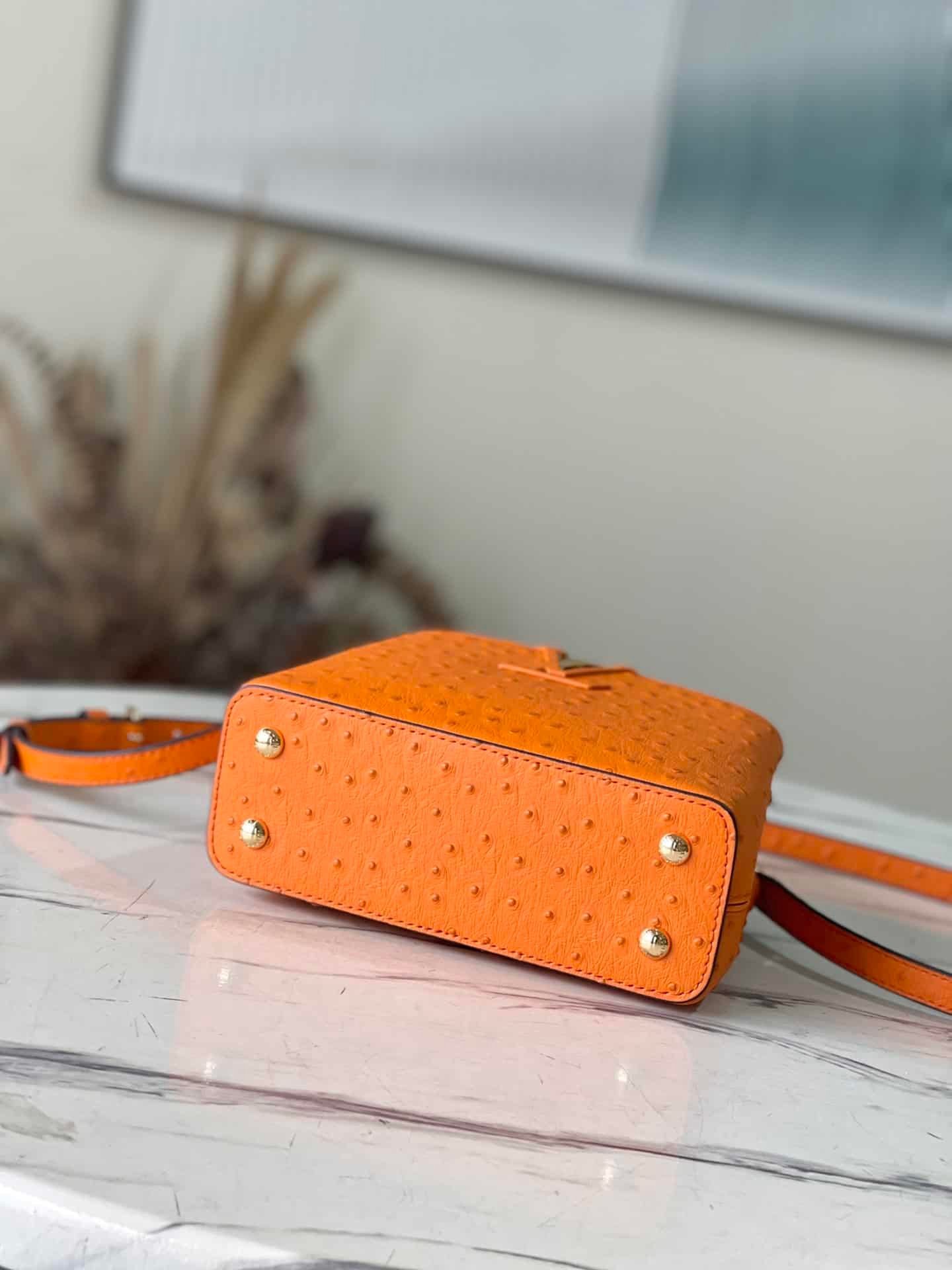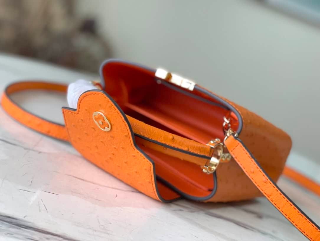 Orange ostrich leather mini Capucines ostrich leather handbag, moderate hardness handle, gorgeous buckle connecting the handle, spacious and practical shape, etc. The drop cover can be used in two ways, and it can be placed outside the bag to show the fashion trend of the Monogram flower pattern.