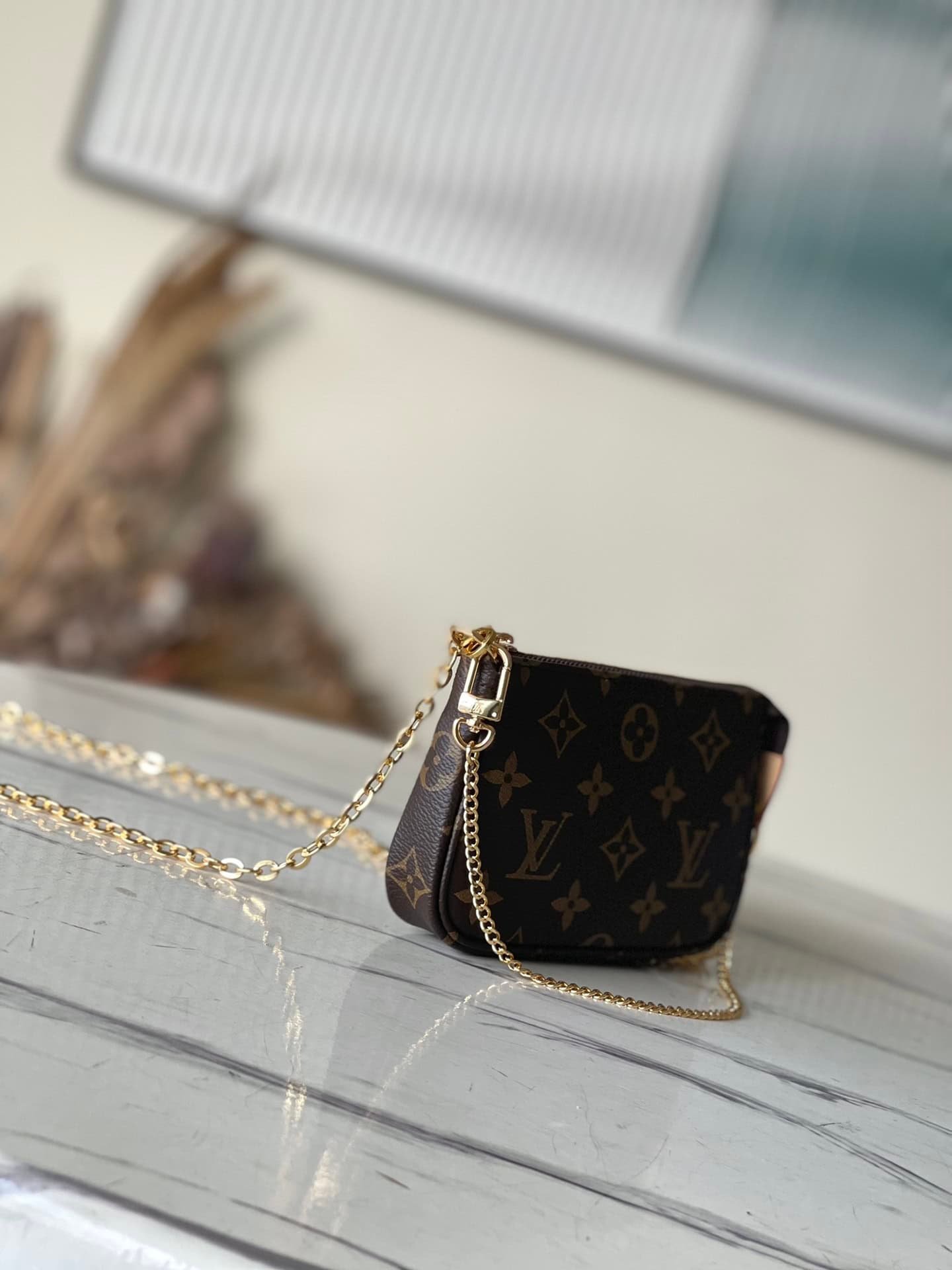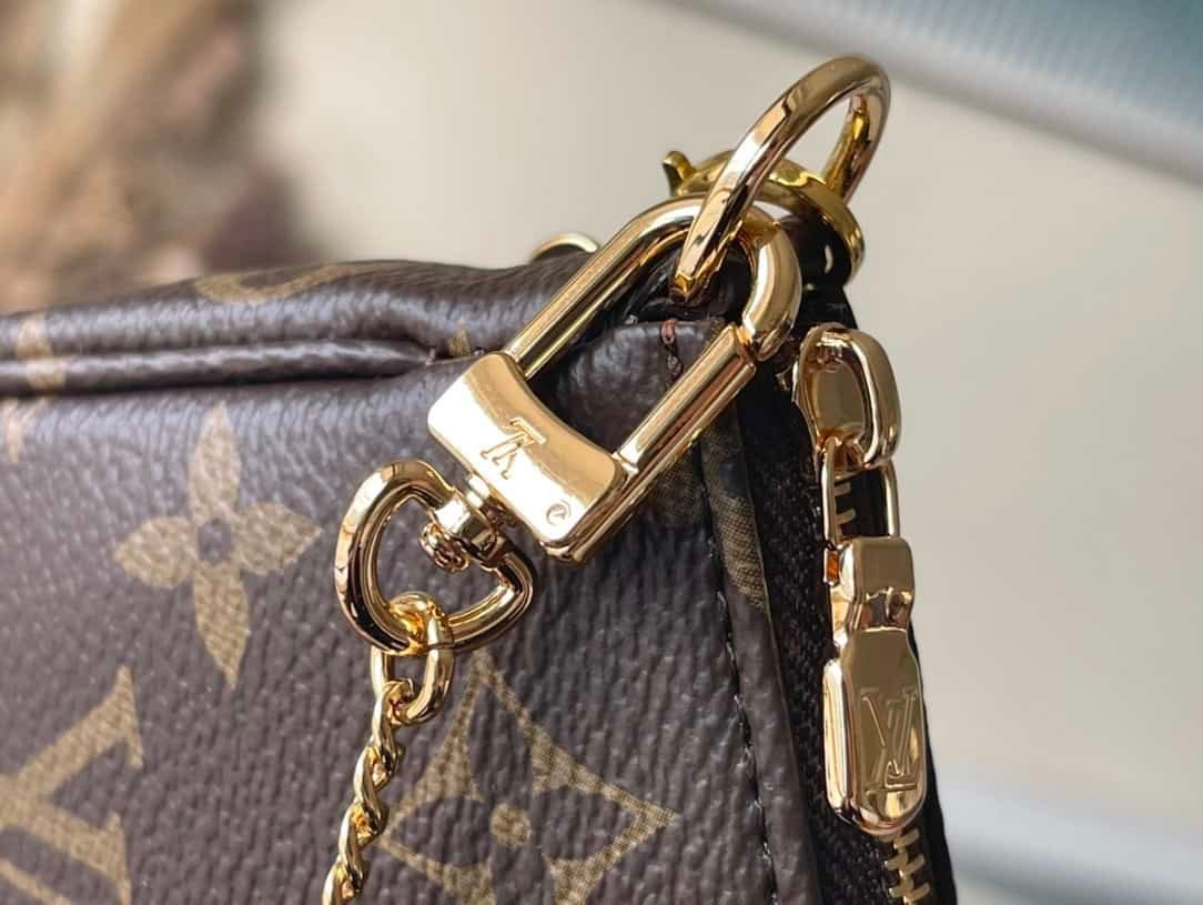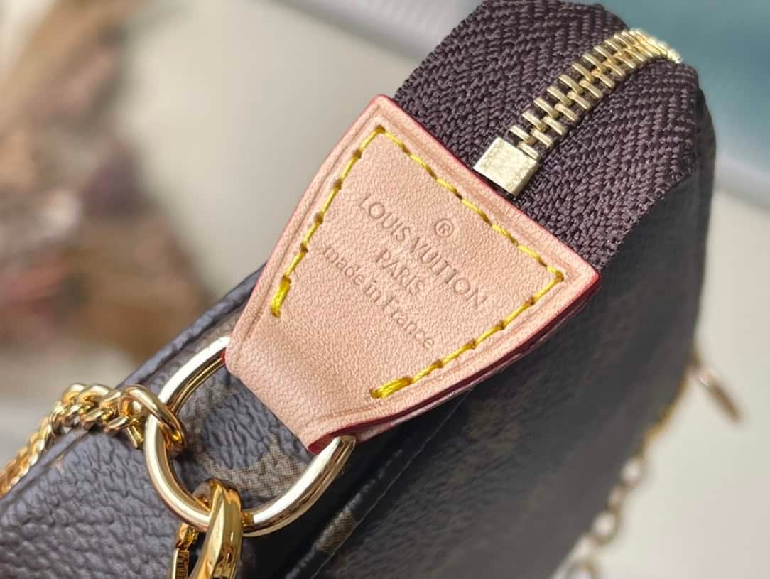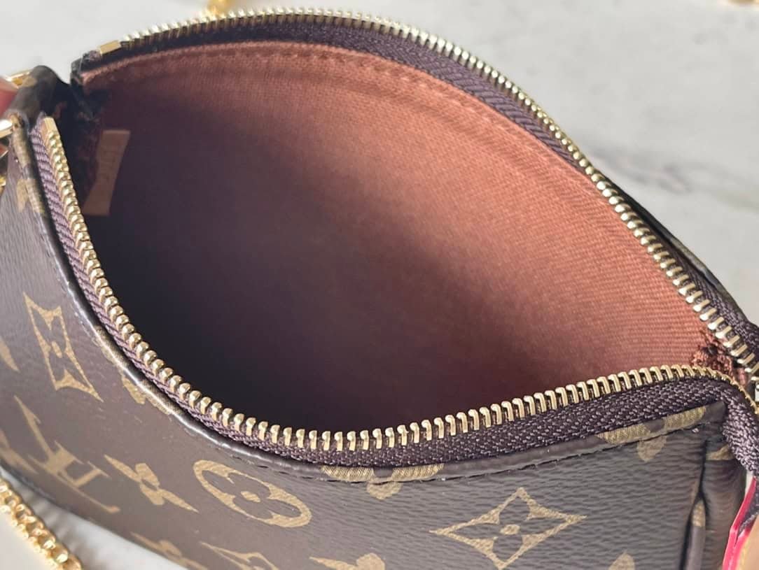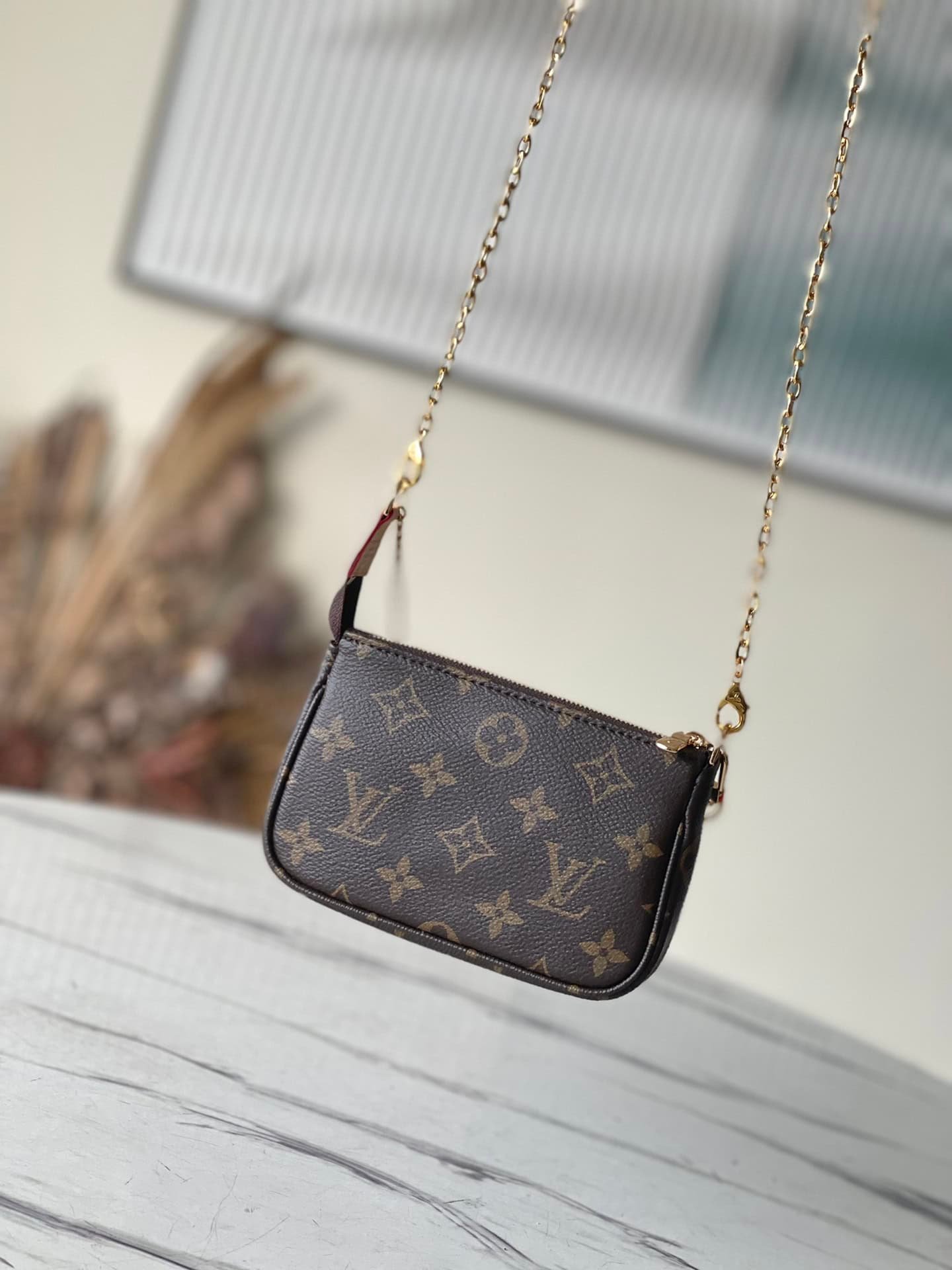 Mini Pochette Accessoires on Chain handbags are made of Monogram canvas to create an exquisite configuration, which can easily accommodate small accompanying items. The short chain and zipper closure continue the original design, and the detachable long chain adds shoulder and crossbody options.