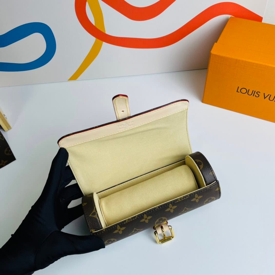 Crafted in signature Monogram canvas with a soft, luxurious lining, this watch case is the ideal travel accessory. Size: 20×8×8cm