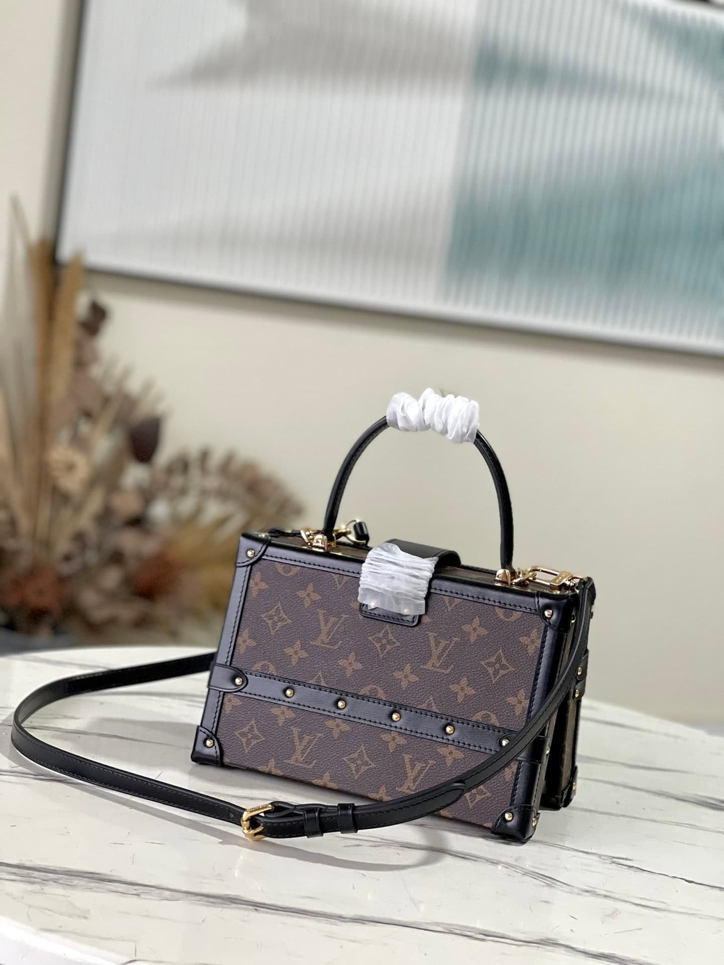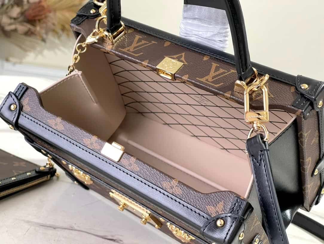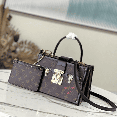Nicolas Ghesquières went back to Louis Vuitton’s tradition of making boxes again to create this Petite Malle V handbag. Monogram canvas with leather trim and V-shaped side gussets for softness and roominess. Attached Monogram zipped interior pocket secured with a chain.