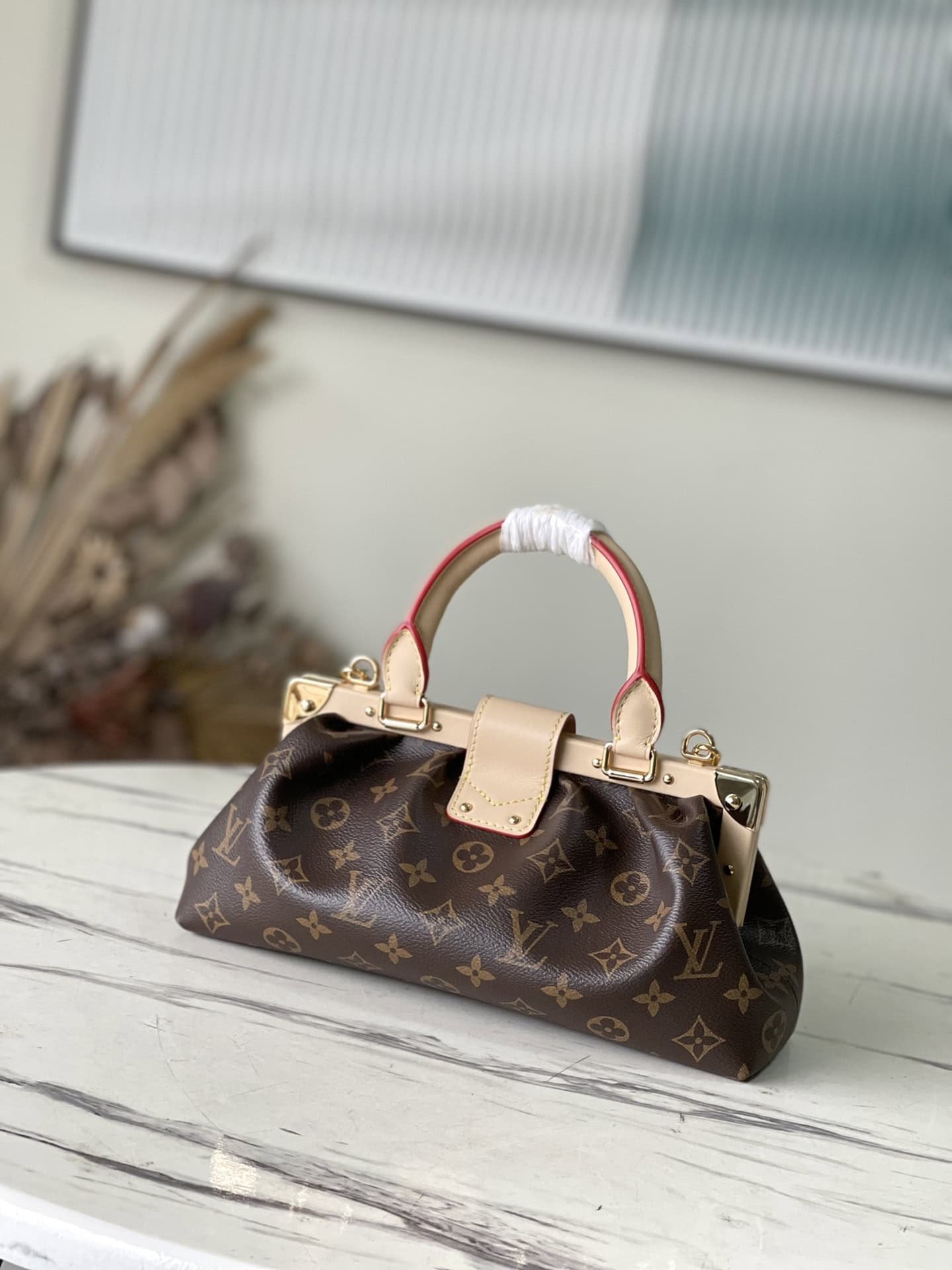 Monogram Clutch handbags are made of Monogram canvas with cow leather trim and classic S-lock locks, rivet buckles, metal corners, and other metal parts. It’s topped with a rolled leather top handle and features a detachable chain and retractable swivel joint.