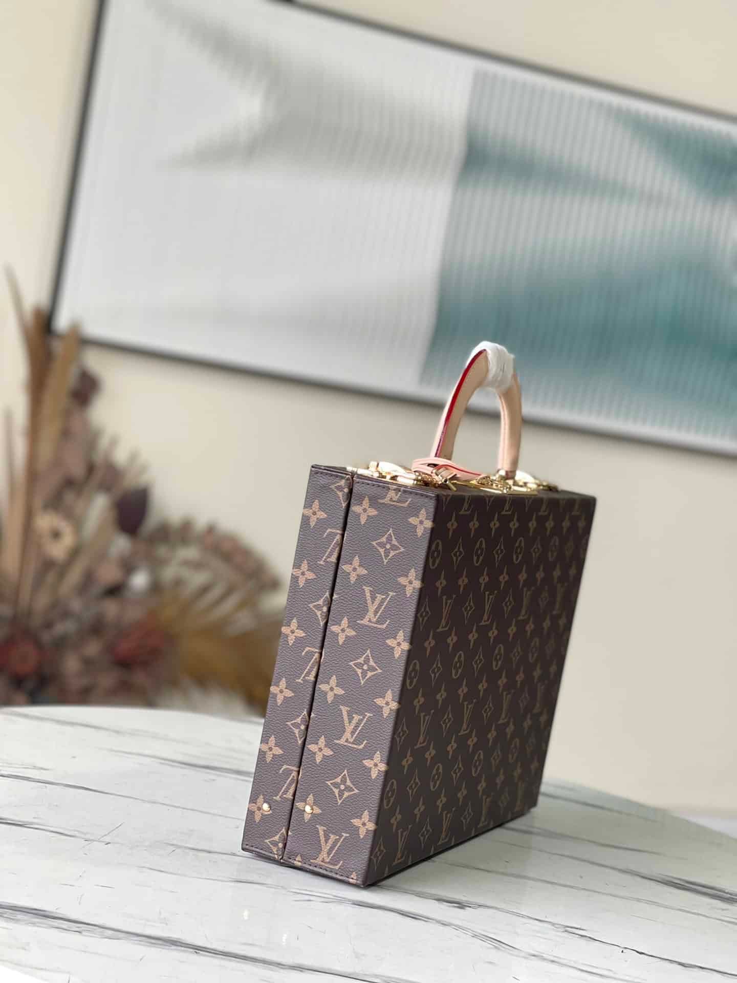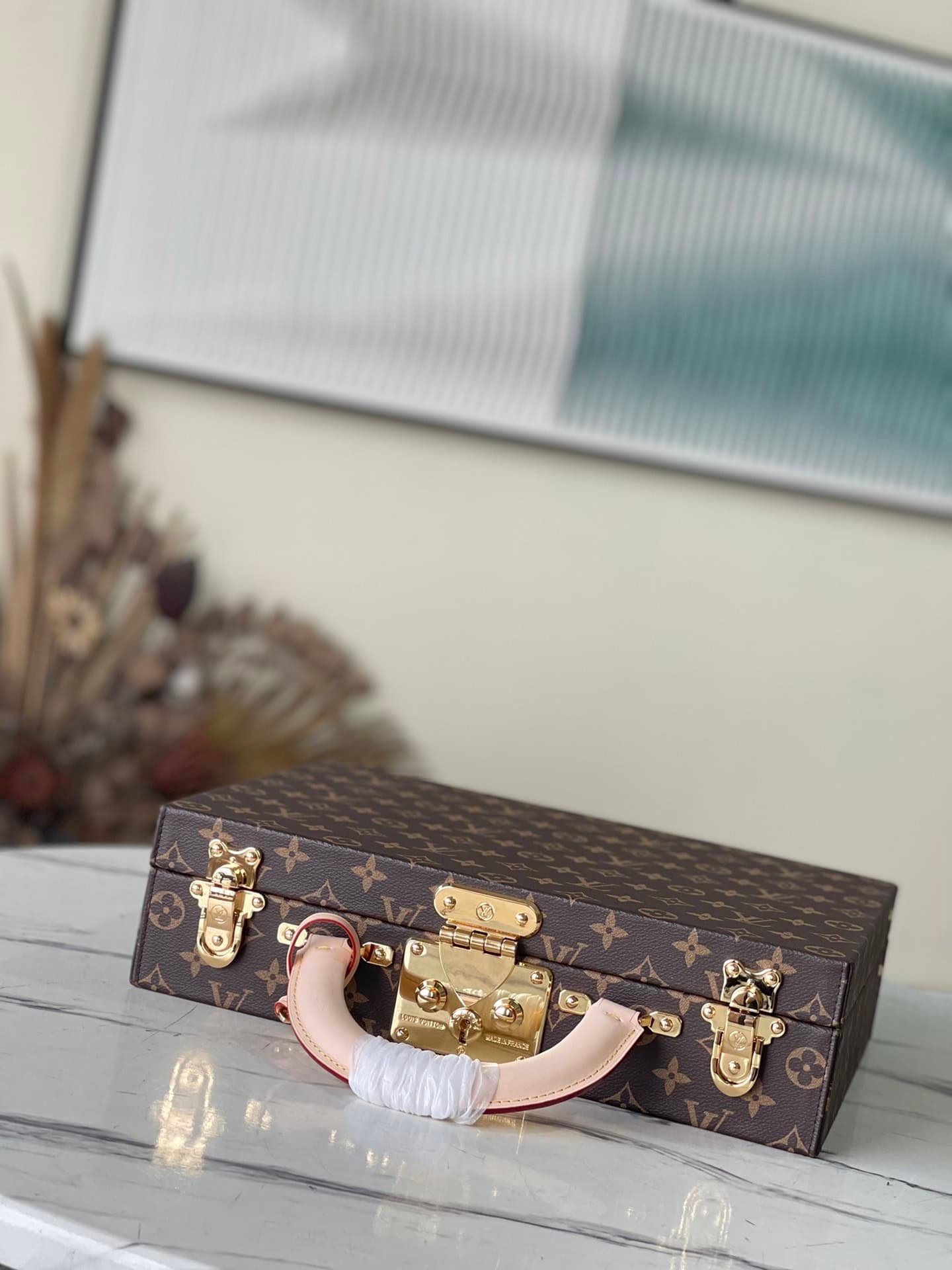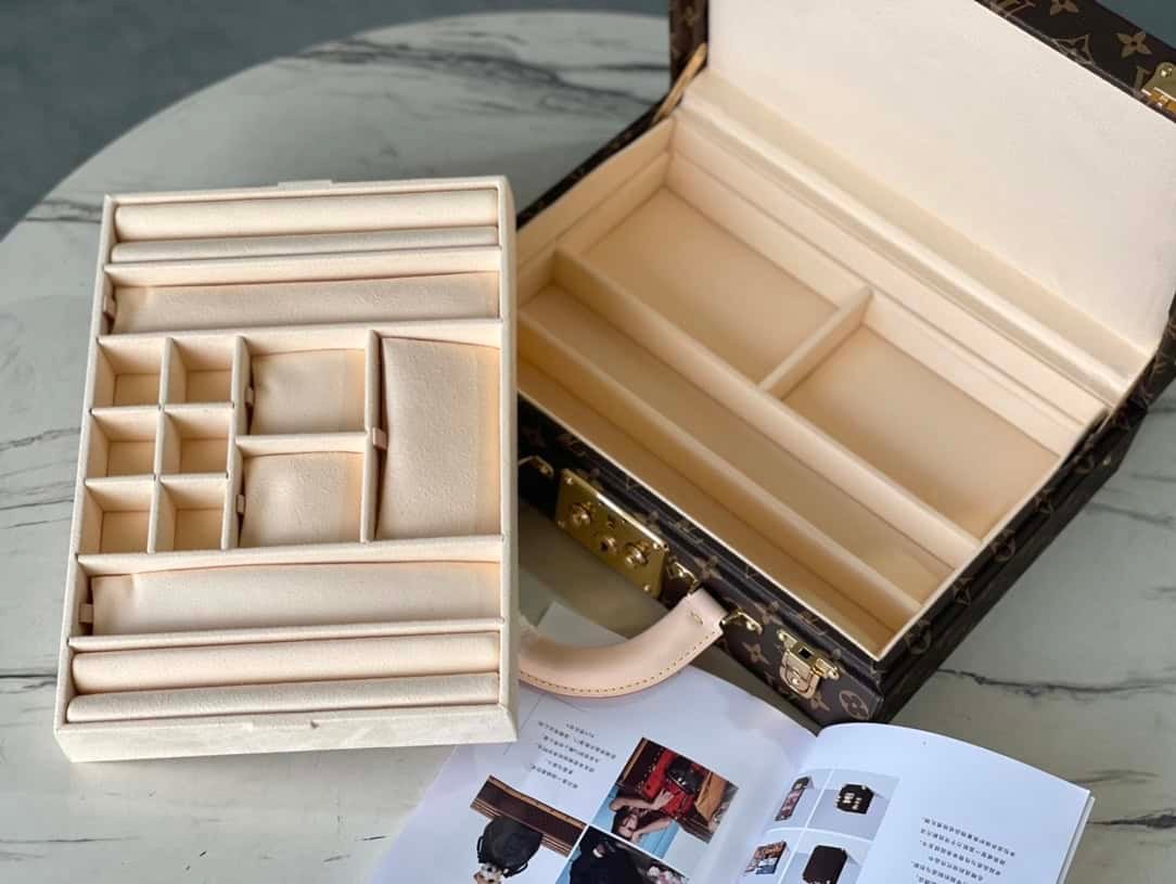 Beige This Monogram jewelry case is especially suitable for carrying precious items when traveling. There are thirteen compartments of different sizes, which are opened and closed by S lock and two suitcase mortise locks. This product is expected to arrive in more than three months.