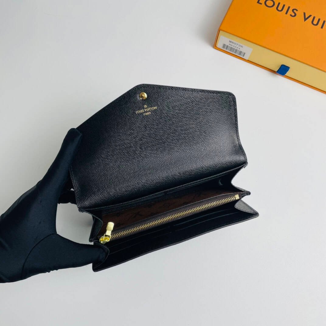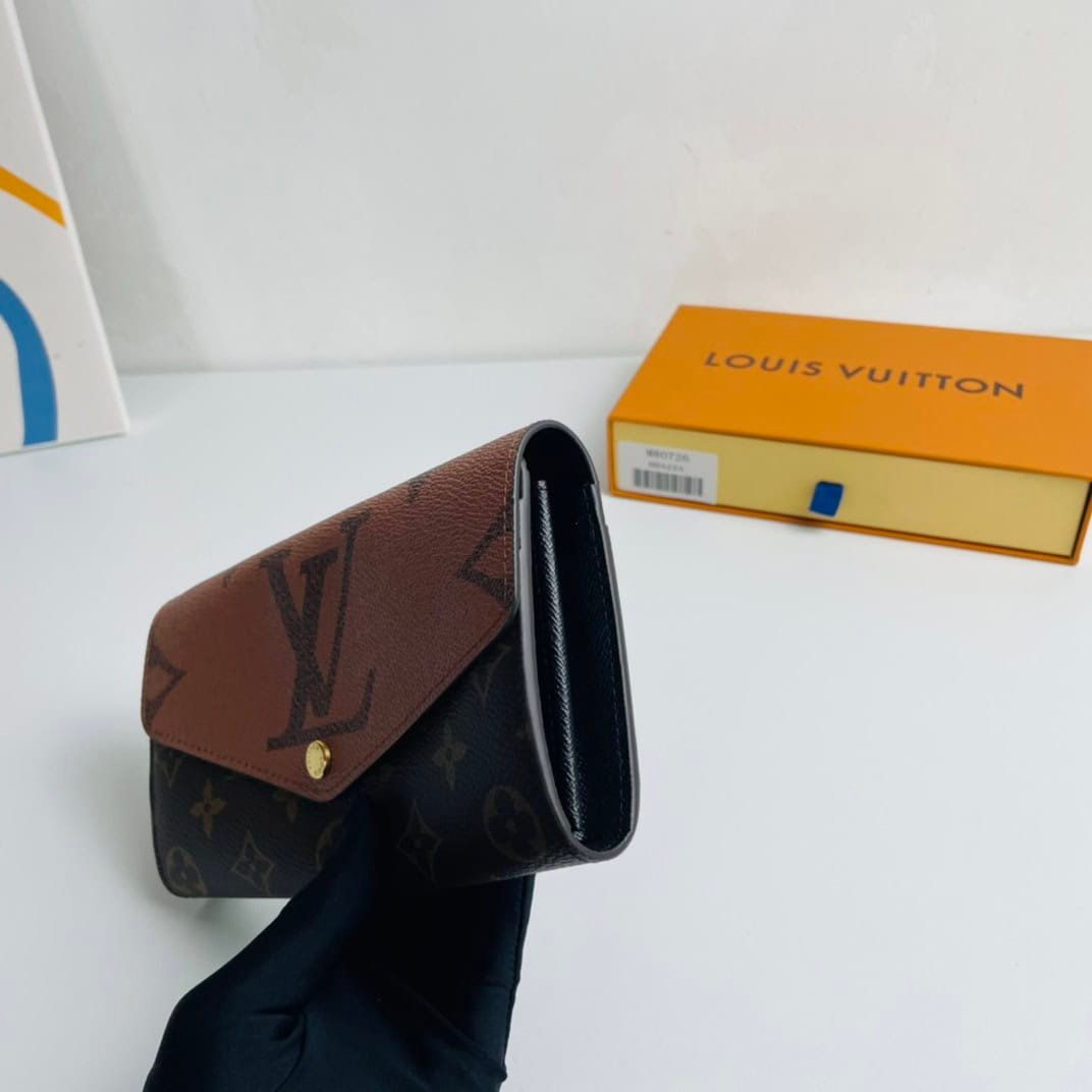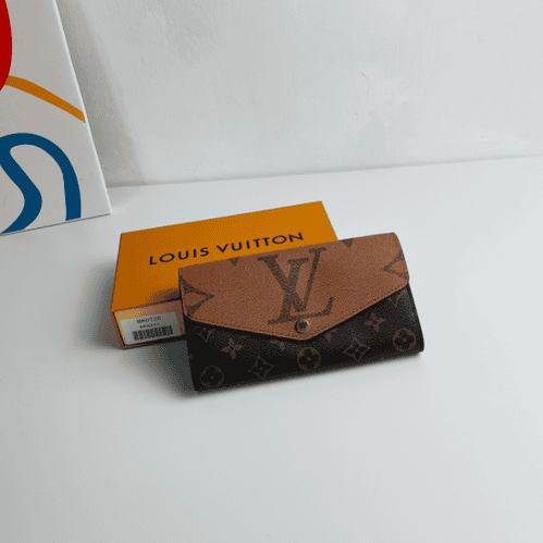 The Sarah Wallet recreates the classic boxy shape in Monogram and Monogram Reverse Giant canvas. The well-organized interior features pockets and card slots, and the envelope flap is topped with an inscription snap.