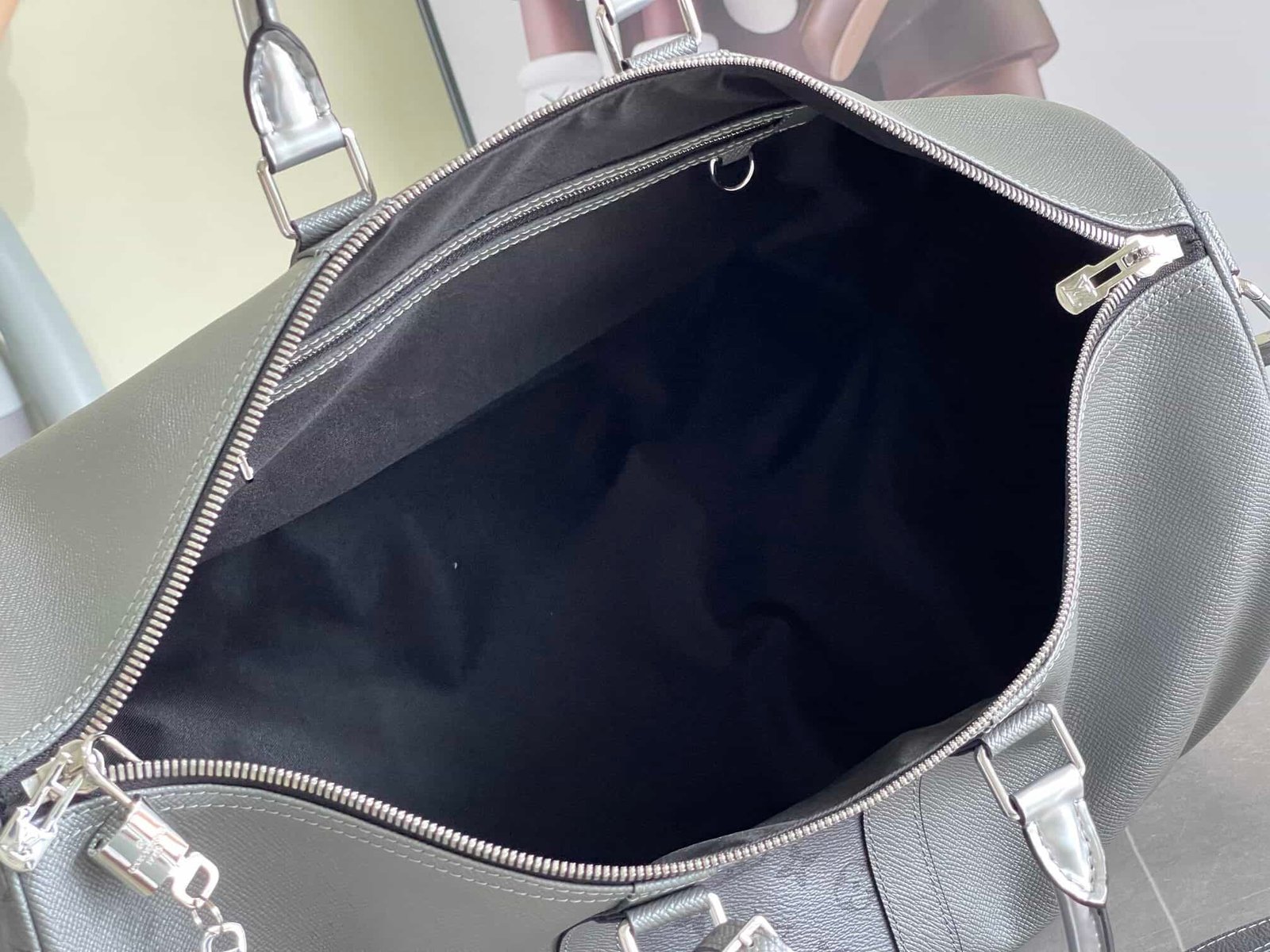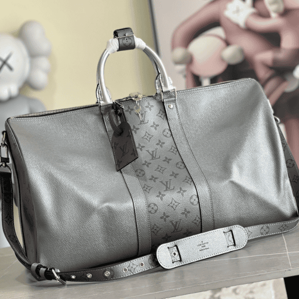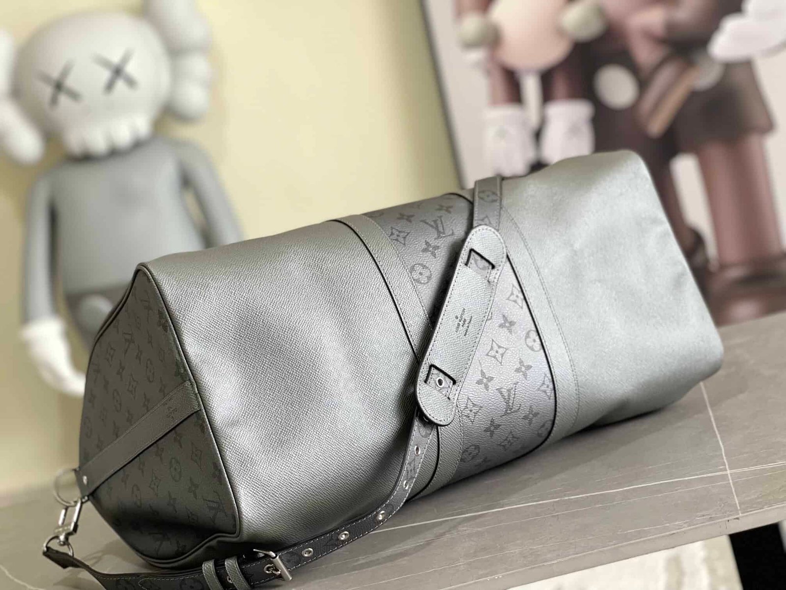 This keepall travel bag uses flexible Taiga leather and classic canvas to create a dynamic configuration. Just the right size to accommodate your travel needs.