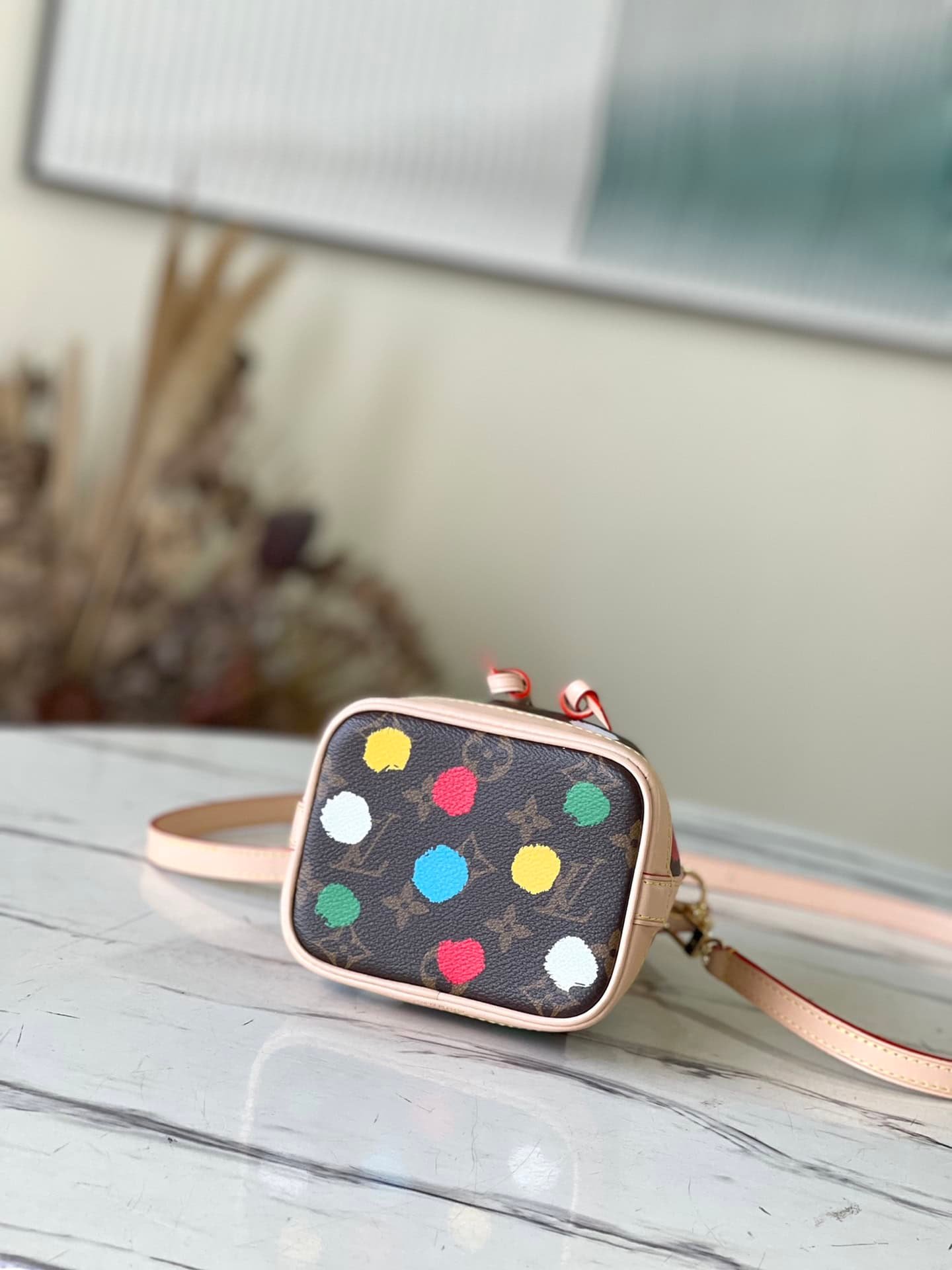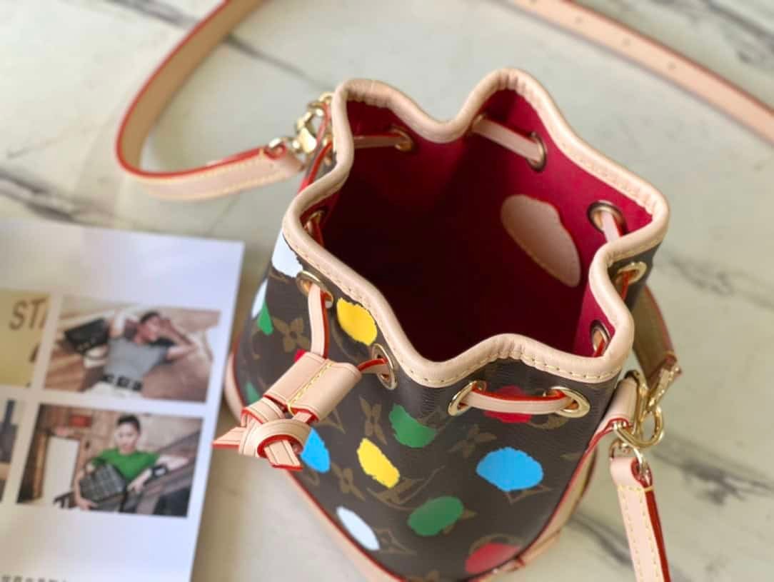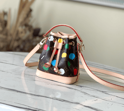 This Nano Noé bag condenses the classic shape of the 1932 Noé bag, combining traditional design and contemporary functionality with Monogram canvas and calfskin trim. Ample space can accommodate keys, card holders, mobile phones and other accompanying needs, m81863 presbyopic white leather yellow leather dot spots graffiti colorful silk screen mini bucket detachable handle and detachable and adjustable shoulder strap for various carrying methods .