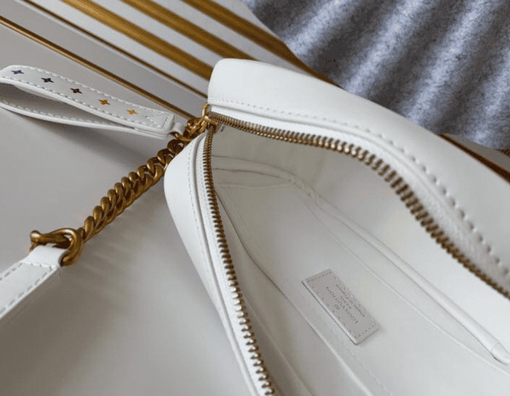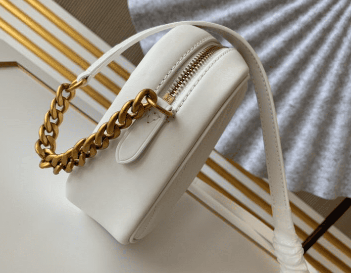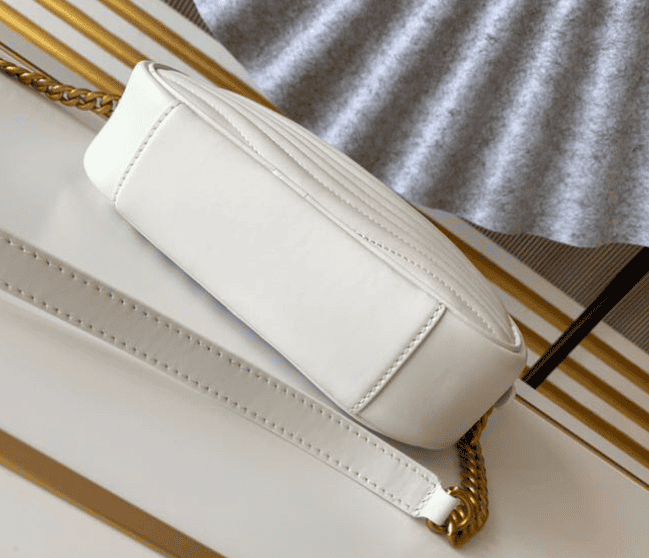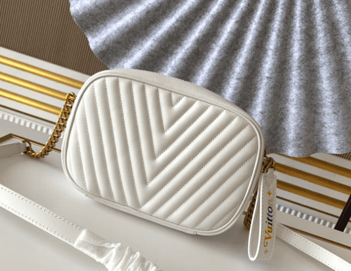 The New Wave camera bag in quilted calfskin to welcome the spring and summer of 2019. Retro gold lettering embellishes the personalized structure, and colorful branding outlines the modern lines of the New Wave quilted leather zipper puller. Comes with a leather and chain shoulder strap for a comfortable shoulder or cross-body carry experience.