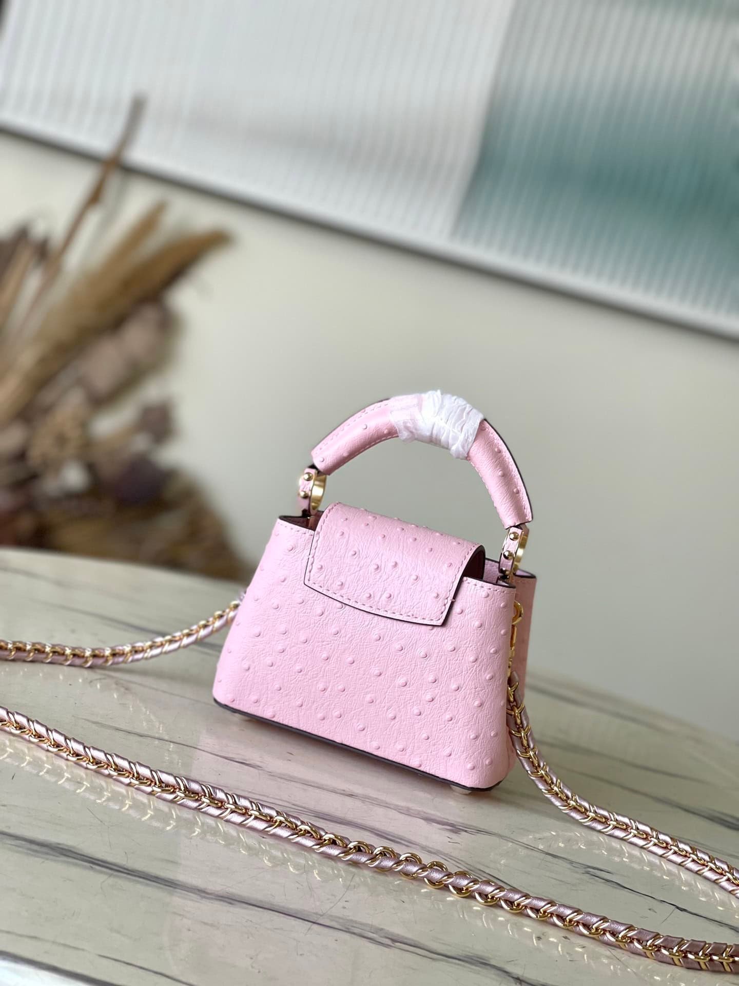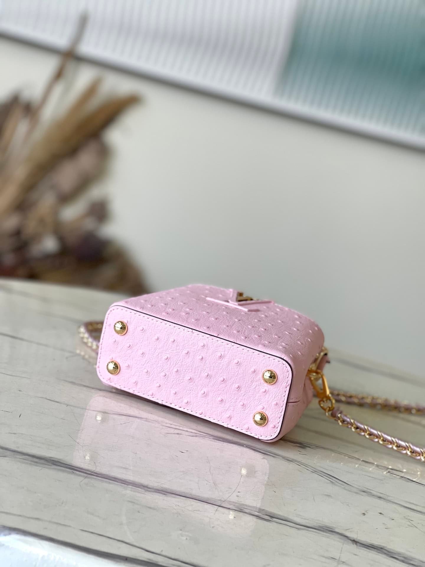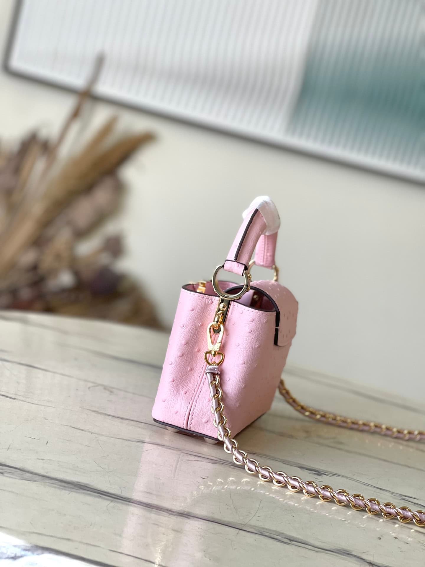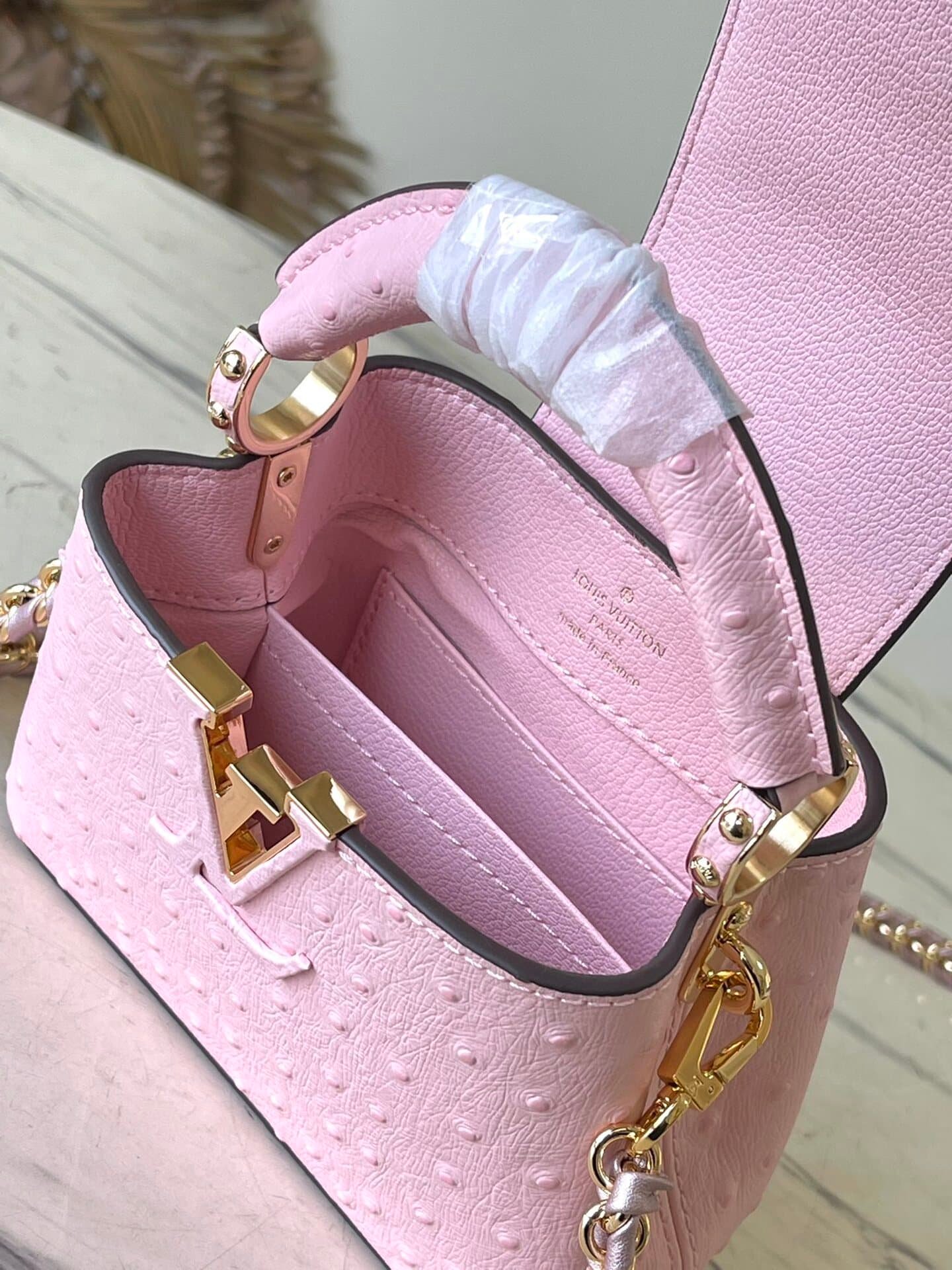 Pink super mini (cow leather pressed ostrich pattern). The noble crocodile leather pattern has been polished and shines charmingly. The luxurious goatskin lining and sparkling metal accessories. The unique Capucines Yhl cover can be stored in the bag to display the letters. The logo can be turned outwards to reveal the Monogram Flower pattern.