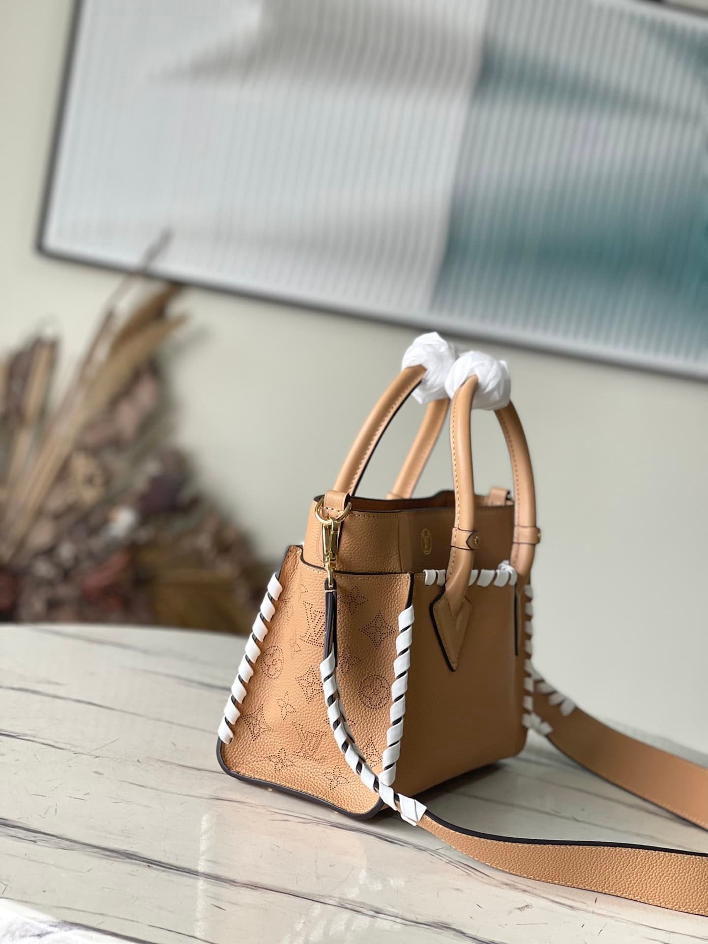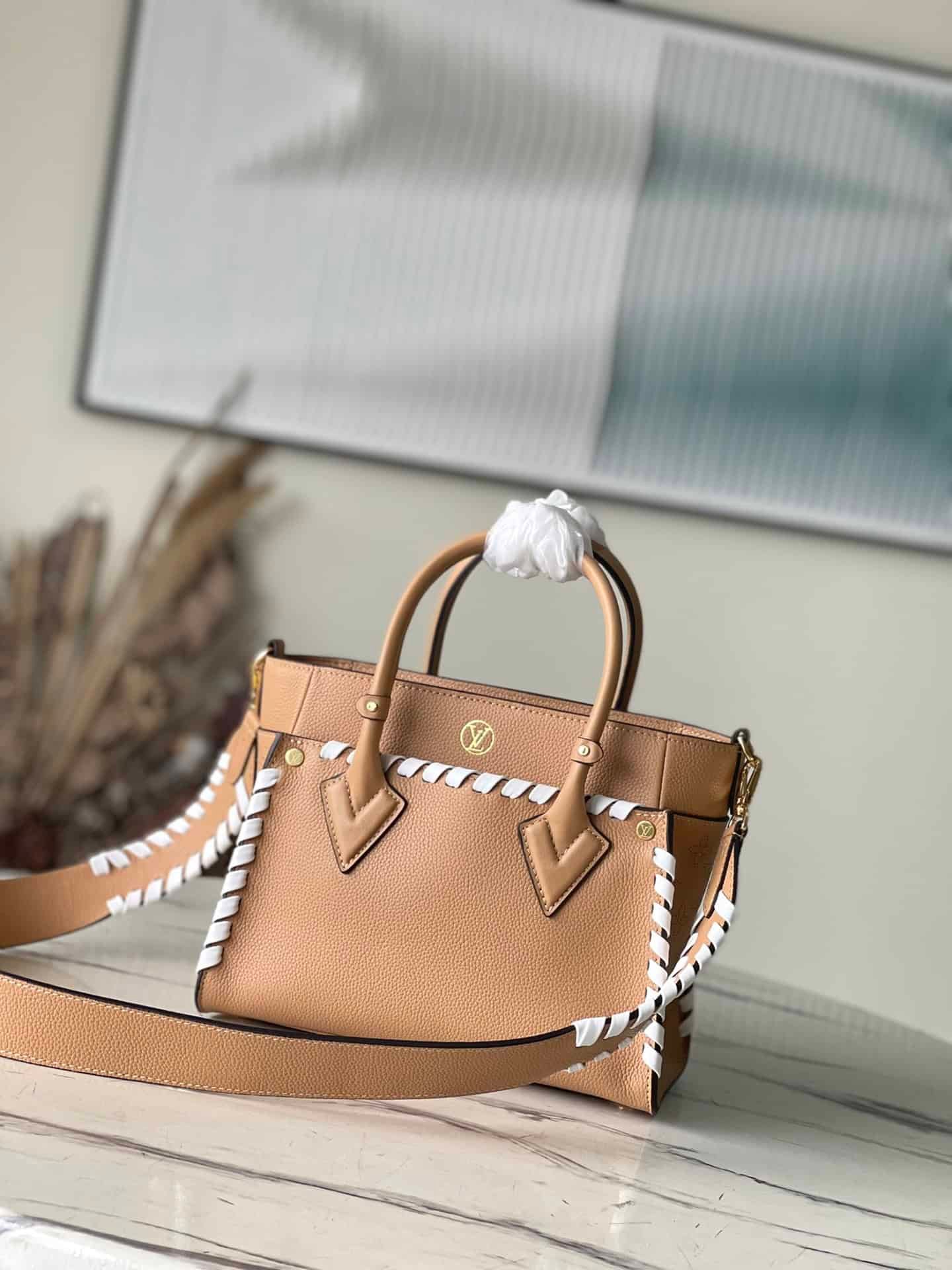 Apricot full leather woven series This On My Side small handbag is made of calf leather, with Monogram perforated calf leather to shape the structure on both sides. External pockets provide easy access to items, while the top handle and detachable shoulder strap allow shoulder and cross-body options.