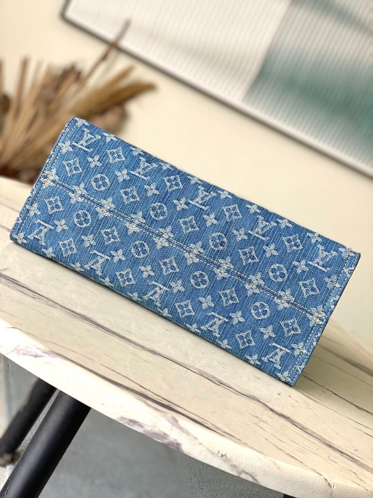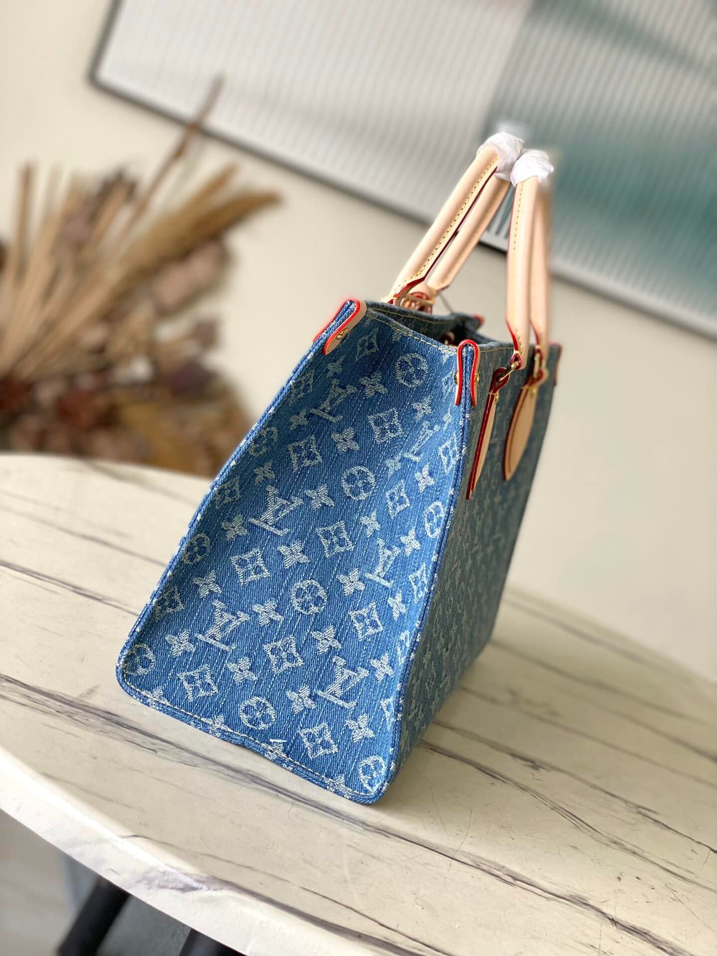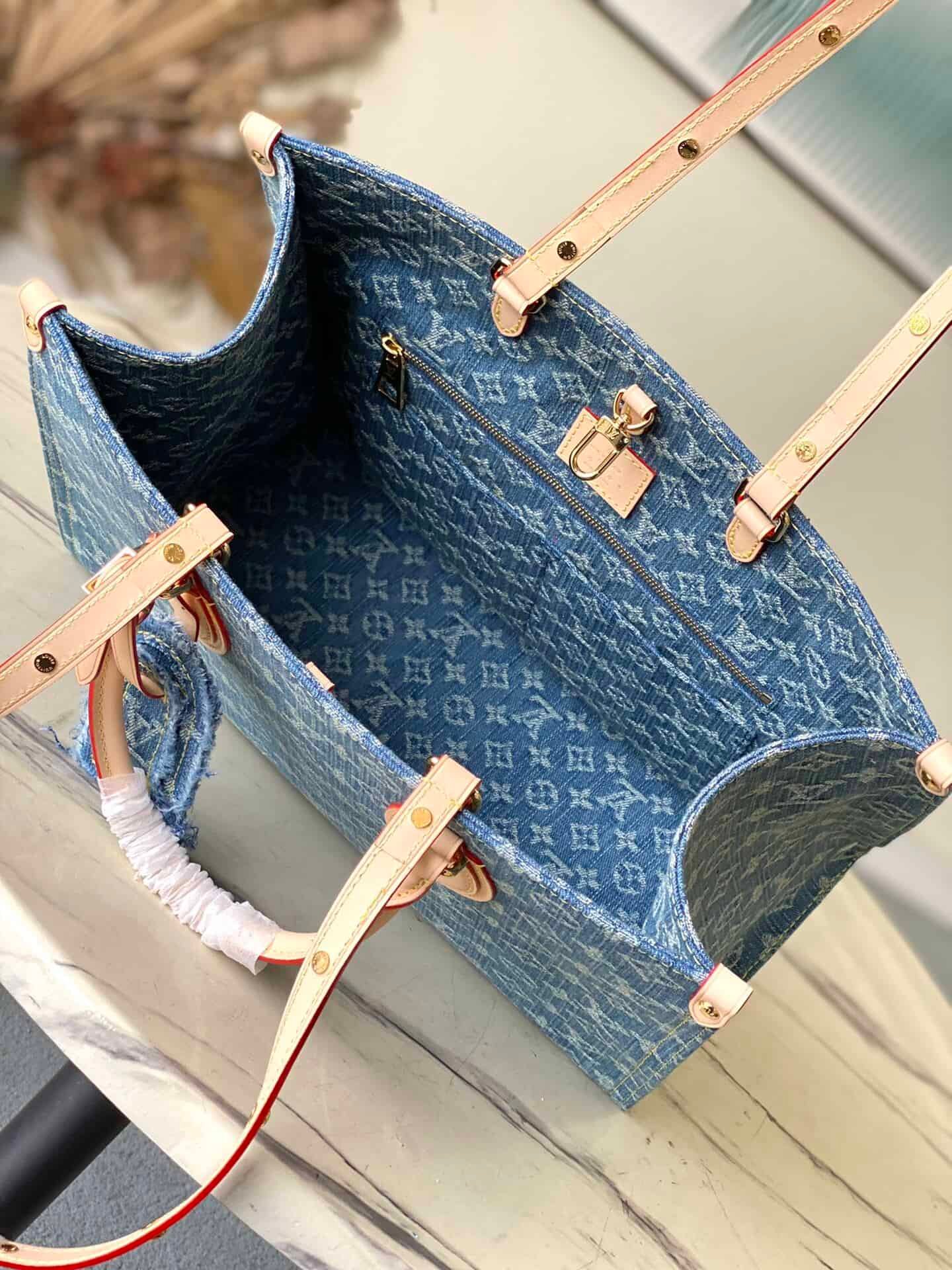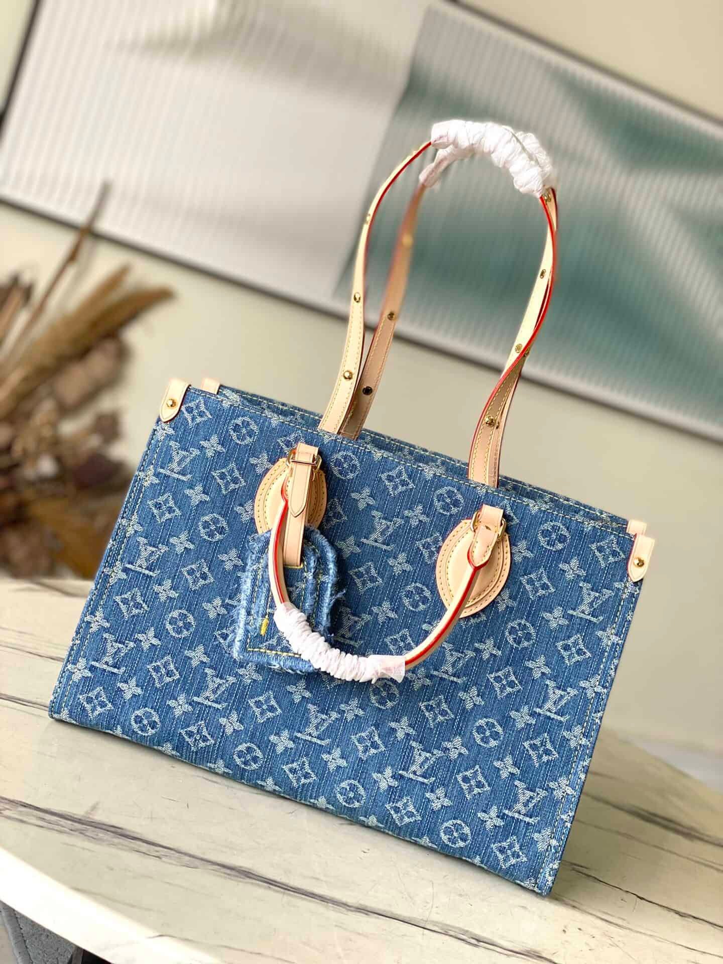 Blue denim denim square bag series Onthego medium handbag blue (denim denim) This Onthego medium handbag is refreshed with sand-washed Monogram jacquard denim, with leather trim and contrast stitching . The ample capacity meets business or leisure needs, and the exquisite handle and long shoulder strap unlock multiple carrying methods.
