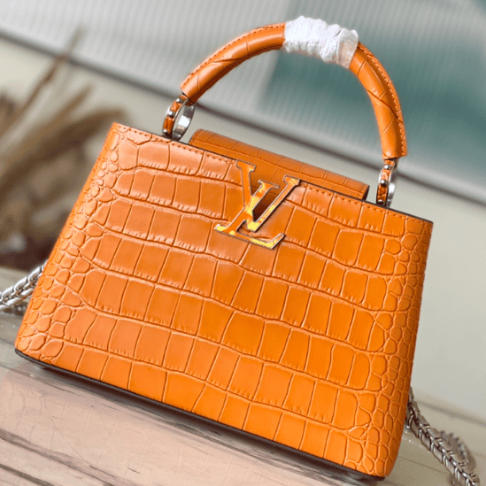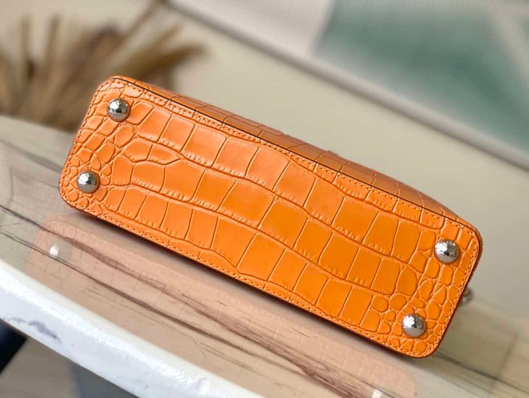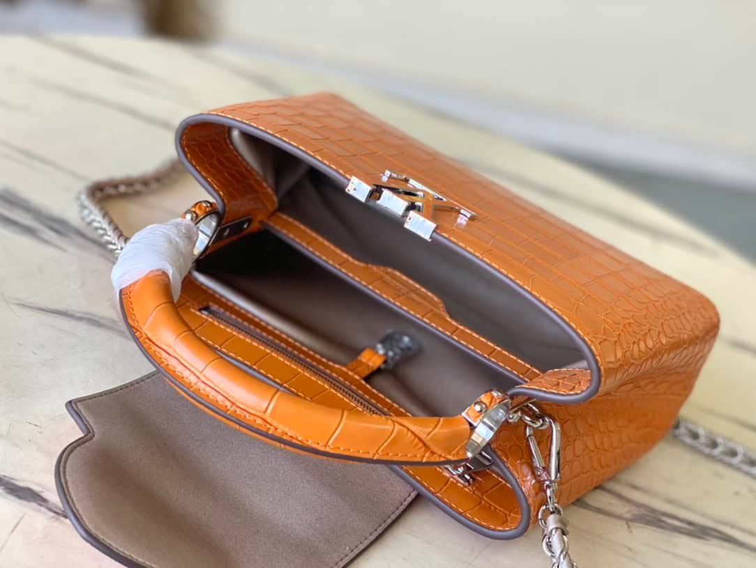 The noble crocodile leather pattern has been polished and shines charmingly. The luxurious goatskin lining and sparkling metal accessories. The unique Capucines Yhl cover can be stored in the bag to display the letters. The logo can be turned outwards to reveal the Monogram Flower pattern.