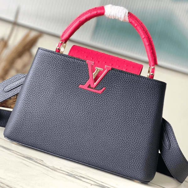Ostrich pattern Capucines handbag is made of Taurillon leather to create a delicate configuration, and the flap, handles and LV letters are wrapped in ostrich leather. The flap can be opened or closed to read the LV logo, and the detachable wide leather shoulder strap is full of modern fashion.