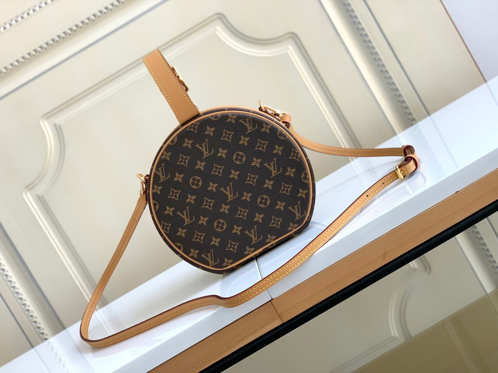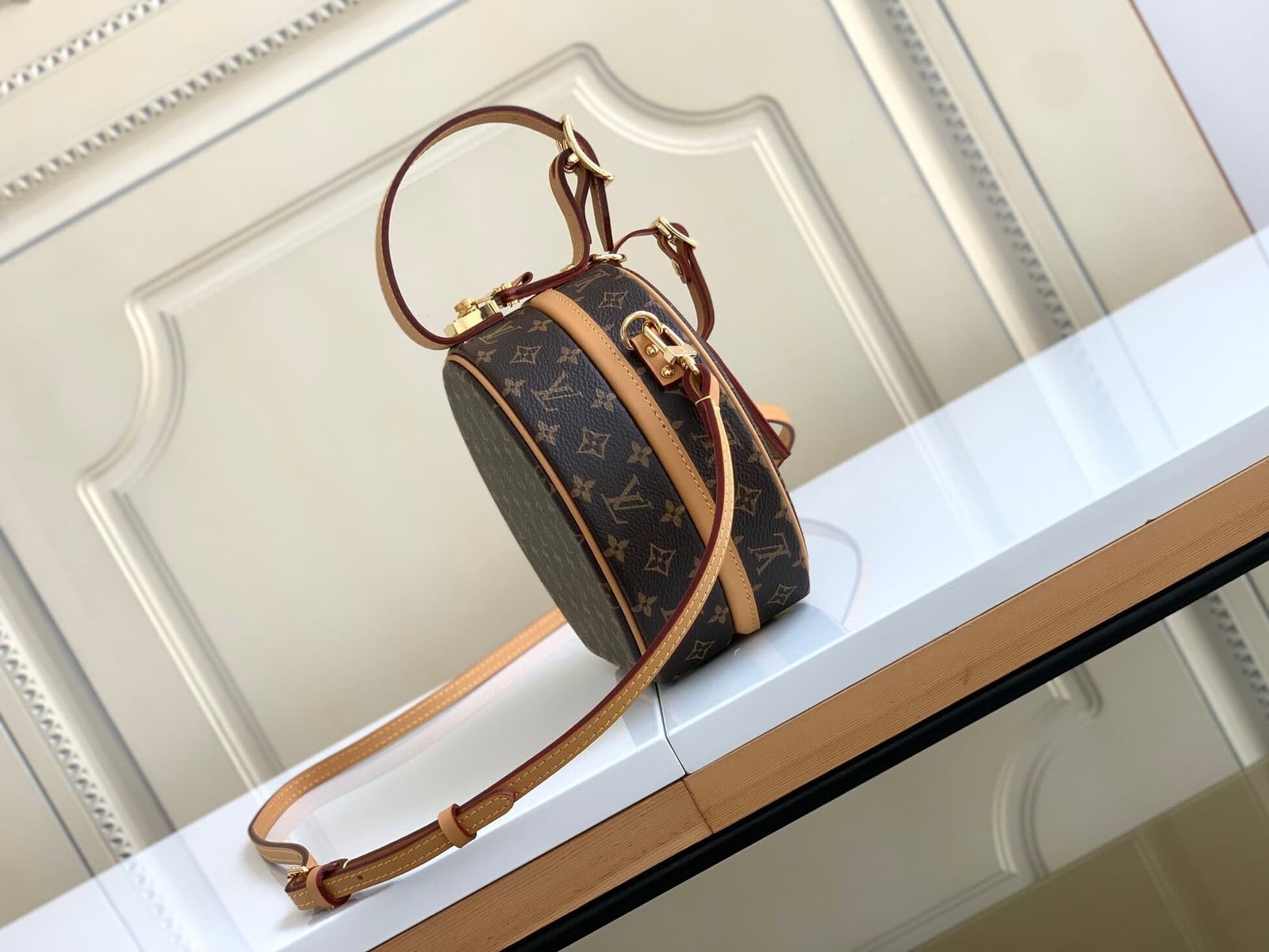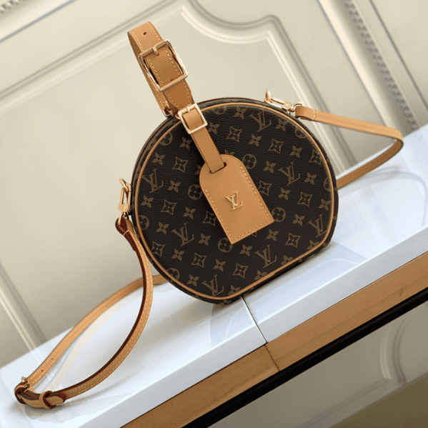 PETITE BOITE CHAPEAU handbag catwalk style barrel bag 👄 Size: 17.5×16.5X7.5cm Monogram coated canvas – Natural leather trim – Lambskin lining – Gold metal trim – Adjustable leather top handle – Removable, adjustable leather strap – Removable leather ID holder – 4 protective metal studs