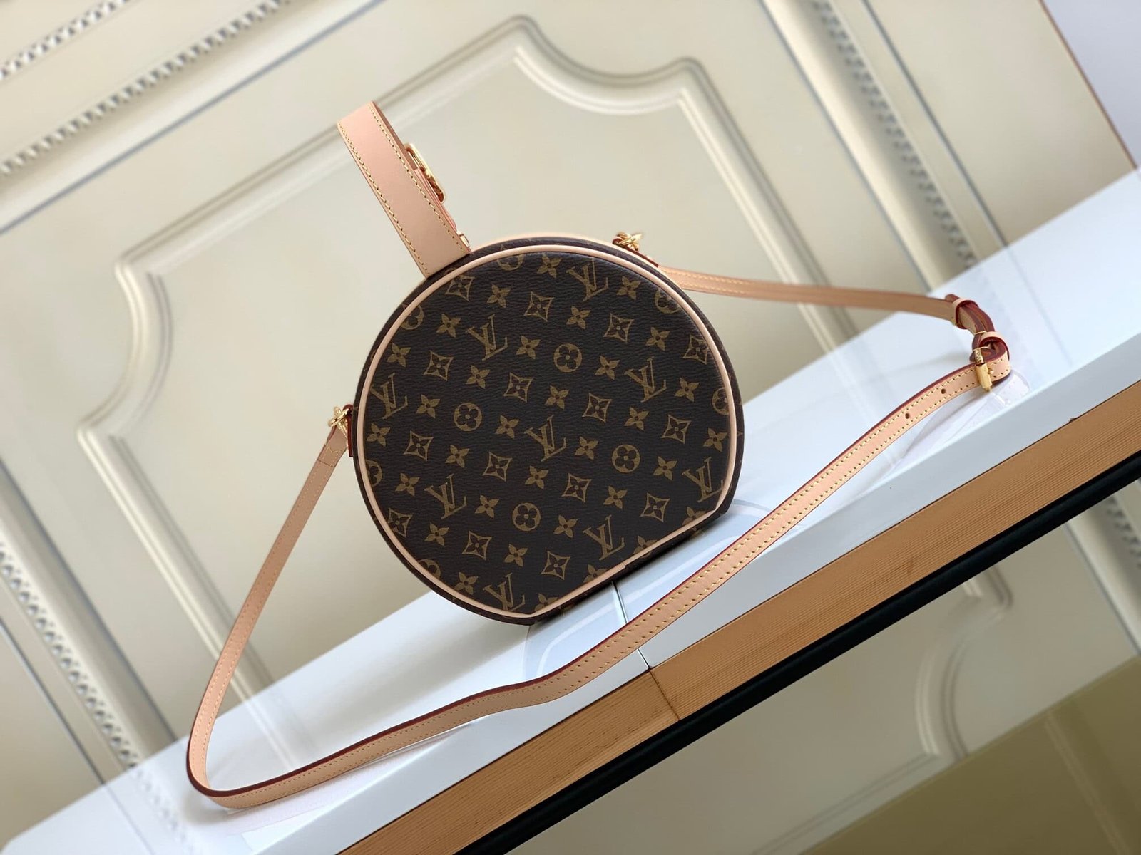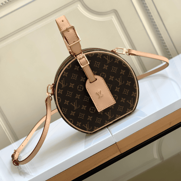 PETITE BOITE CHAPEAU handbag catwalk style barrel bag 👄 Size: 17.5×16.5X7.5cm Monogram coated canvas – Natural leather trim – Lambskin lining – Gold metal trim – Adjustable leather top handle – Removable, adjustable leather strap – Removable leather ID holder – 4 protective metal studs