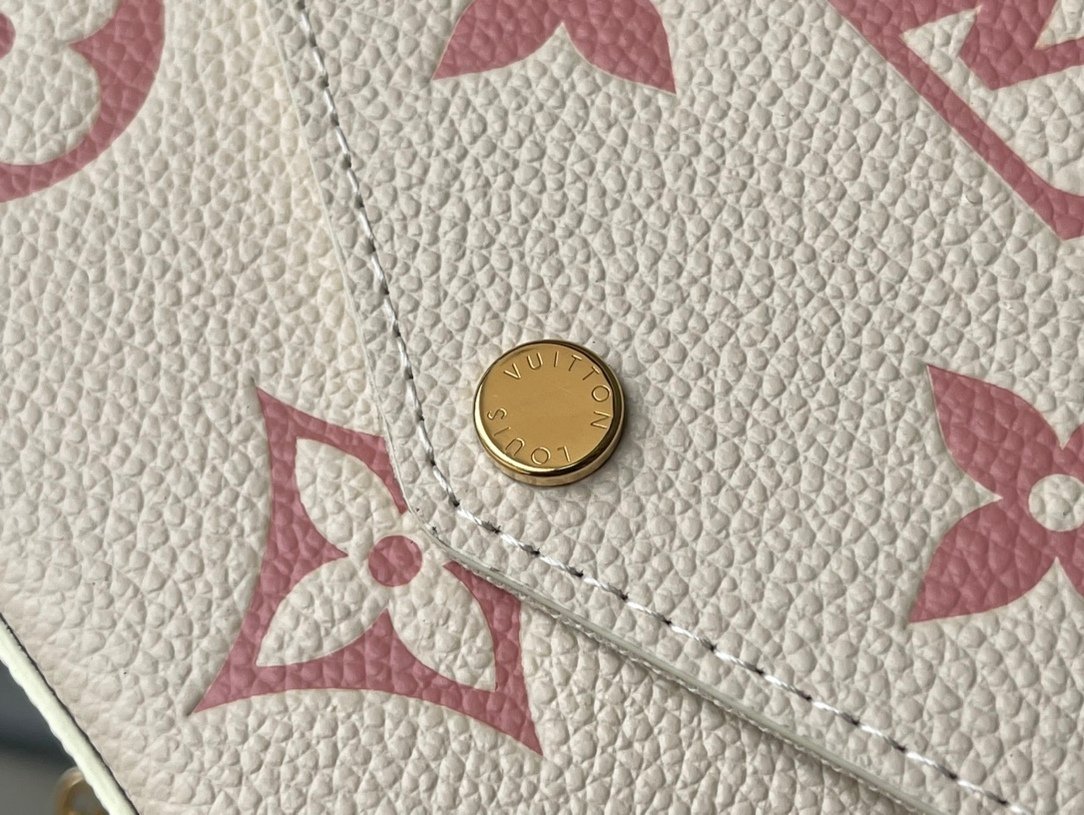 This Pochette Félicie chain bag is made of Monogram Empreinte leather, depicting the Monogram pattern in light colors. The envelope silhouette includes a detachable interior pocket, which can be transformed into an elegant clutch by removing the chain.