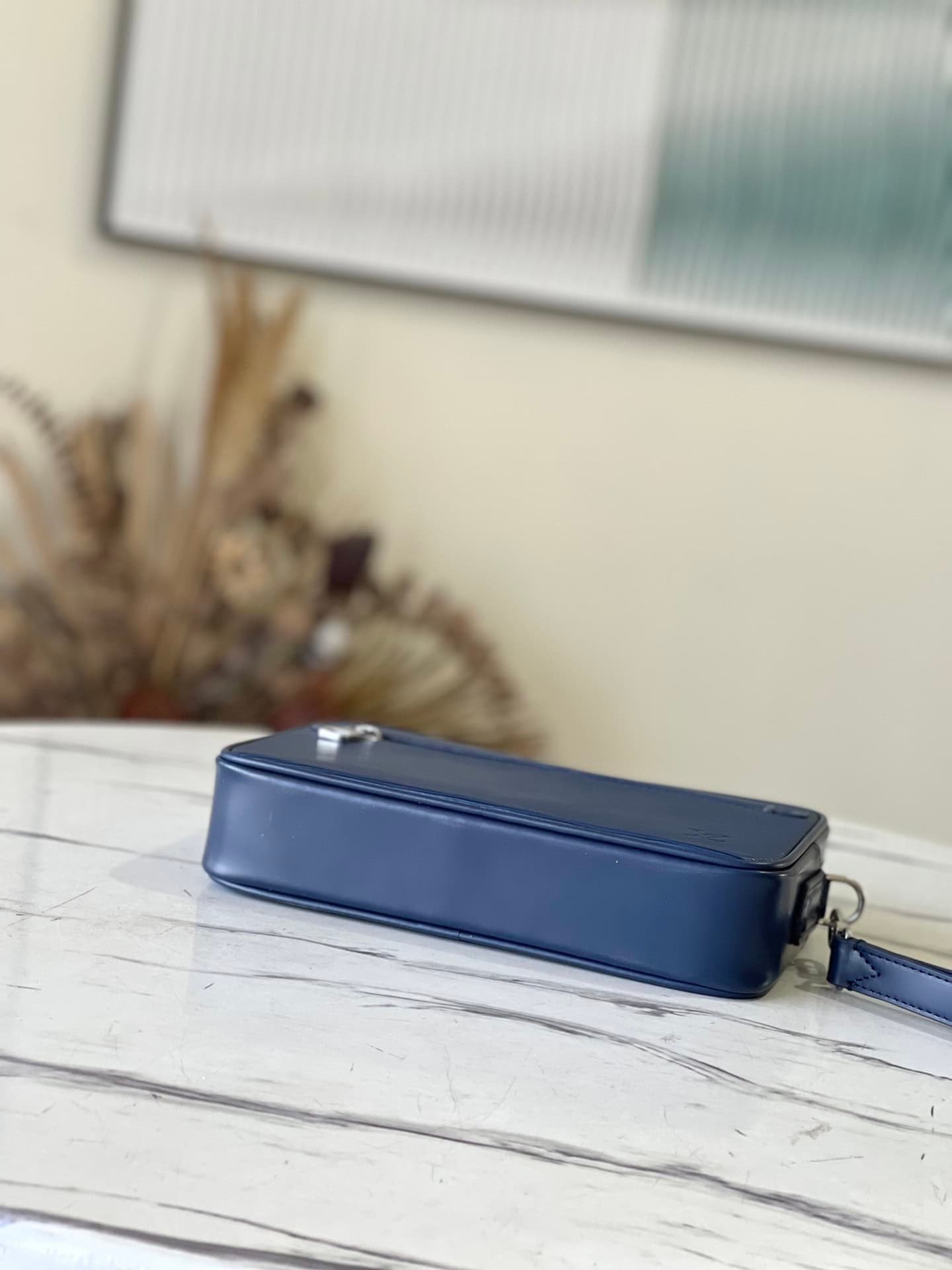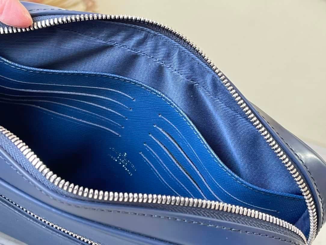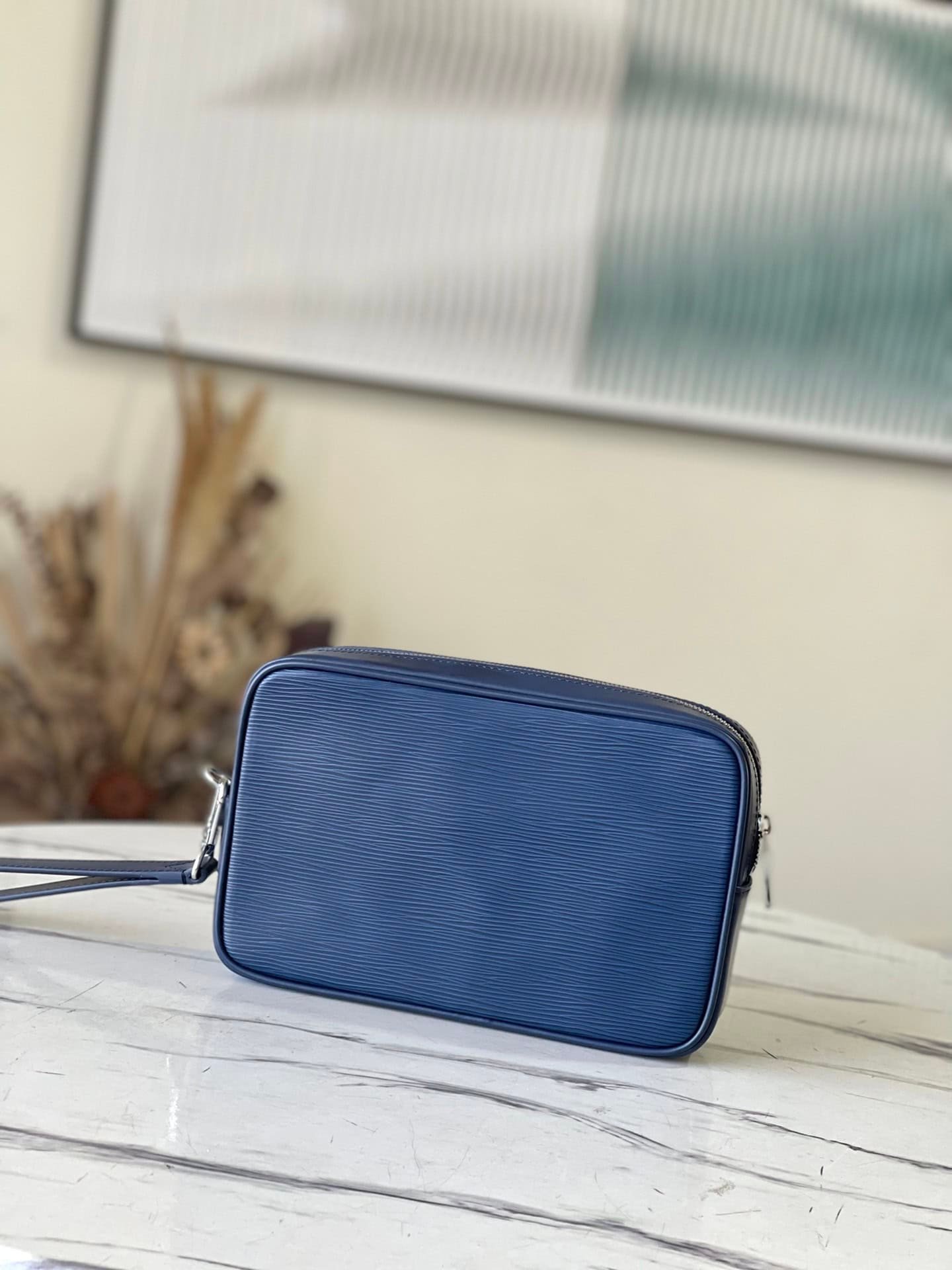 Water ripple blue Pochette Kasai clutch bag is made of delicate Taïga leather to create a compact structure, and the bottom corner is marked with letters, and there are patch pockets and card slots inside to ensure that the travel needs are neat and orderly. A leather wrist strap allows for multiple carrying options.